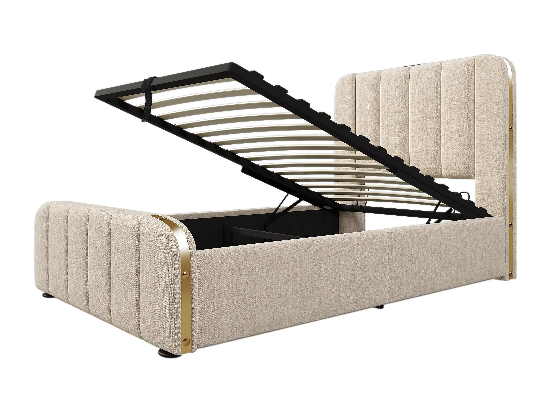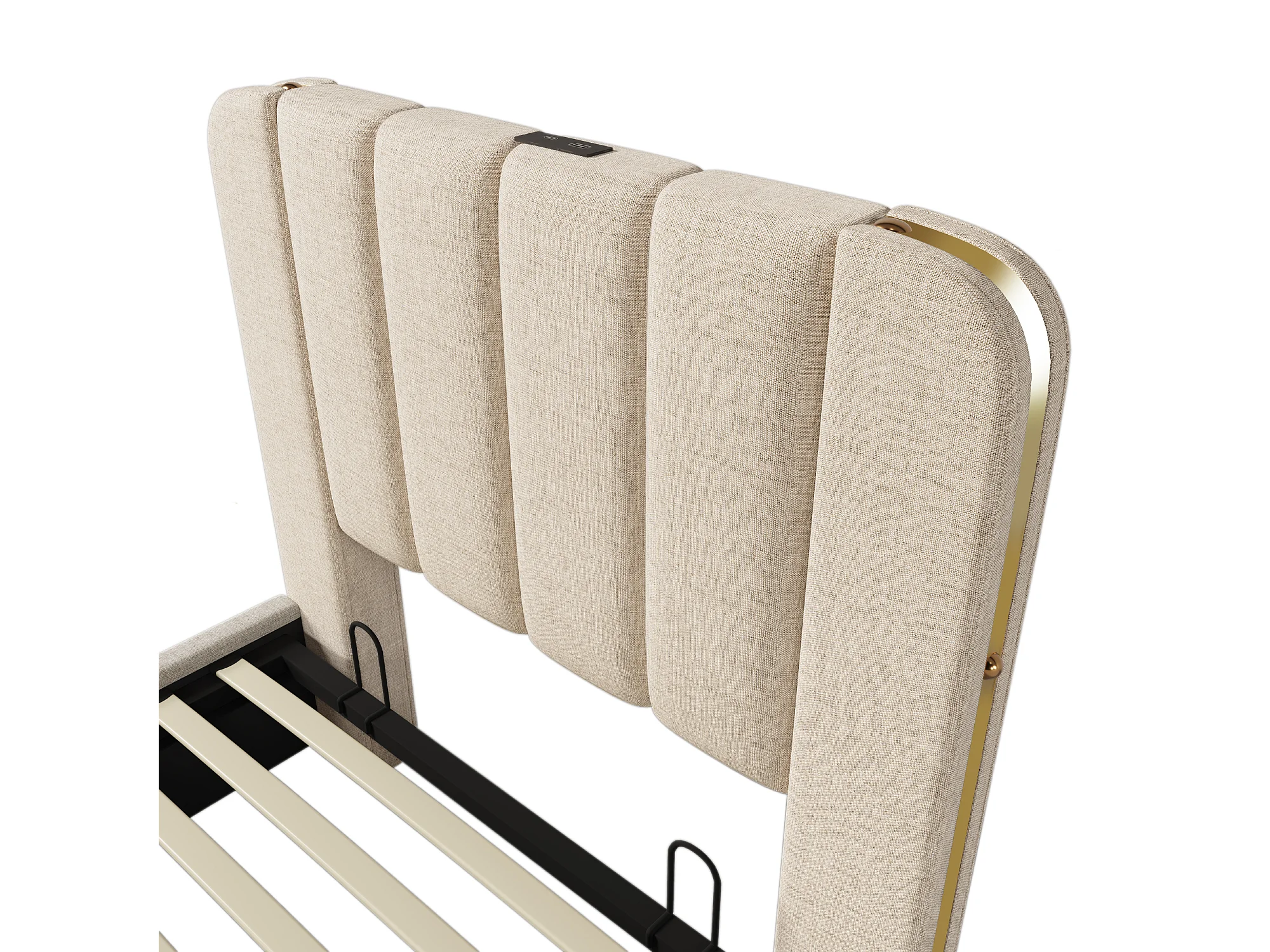 Lit coffre 90x200 cm avec sommier - tête de lit capitonnée avec USB - tissu lin - beige (sans matelas)