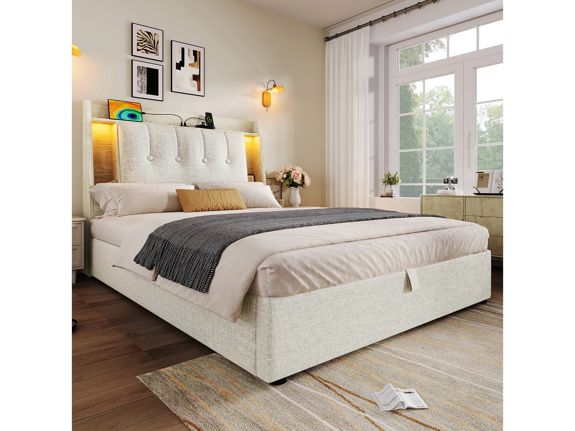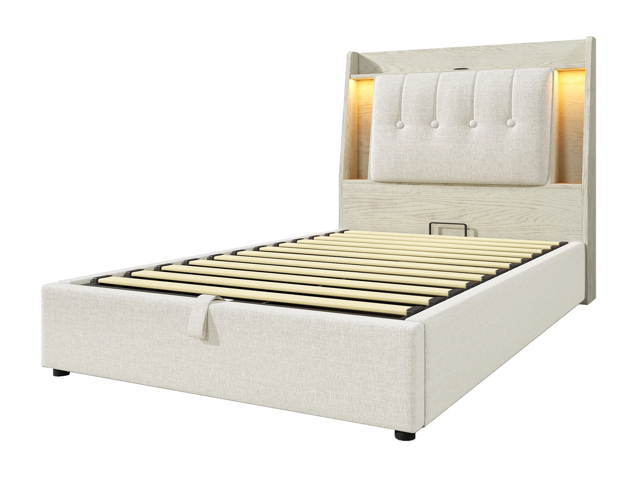 Lit coffre 90x200 cm - avec tête de lit avec rangement, USB et Type-C, LED - lin beige - sans matelas