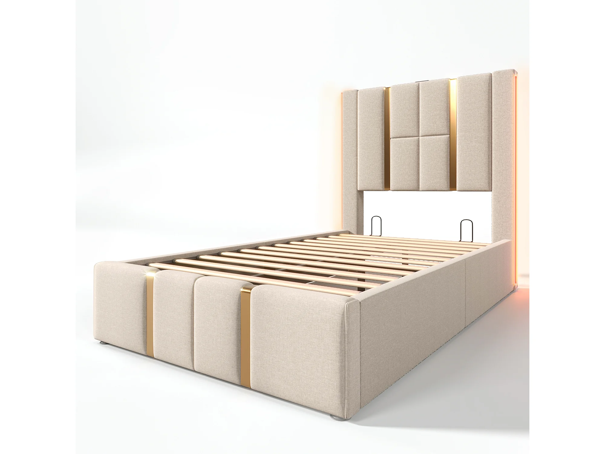 Lit coffre 90x200 cm - lit ado avec chargement USB Type C et LED - lin - beige - sans matelas