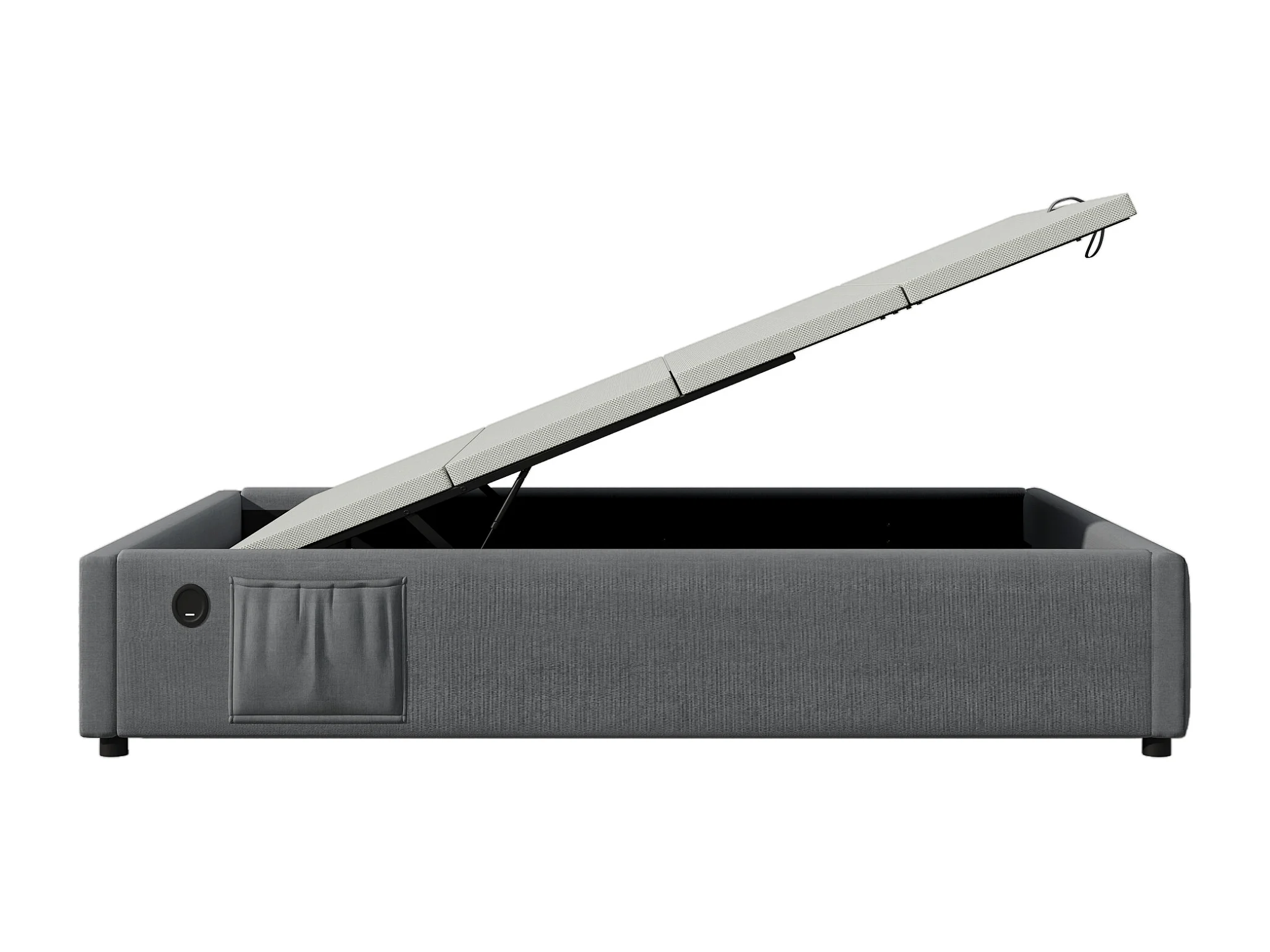 Lit coffre 90x200 cm - lit capitonnée avec USB - coton lin - gris - sans tête de lit ni matelas