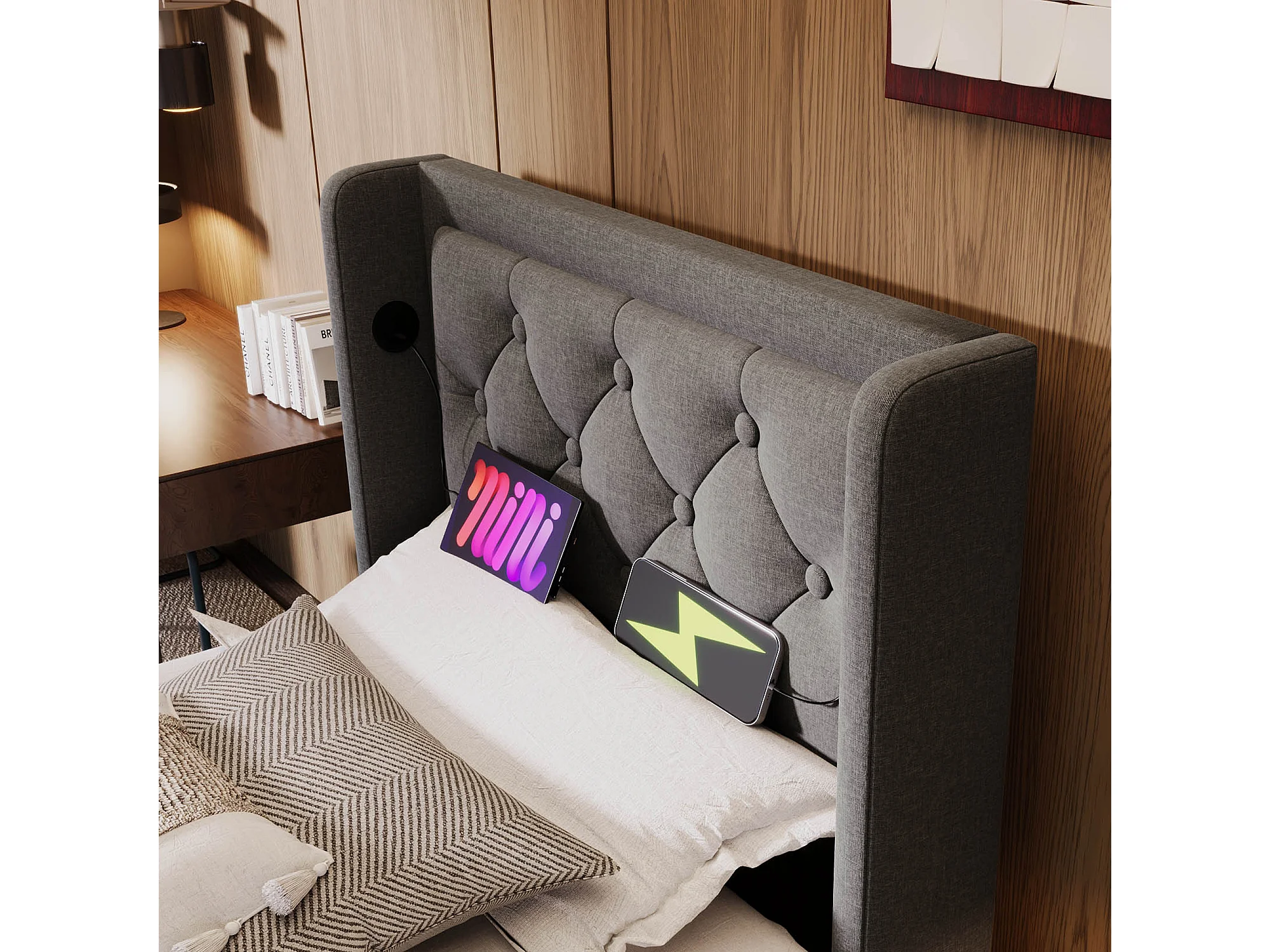 Lit Coffre 90x200cm avec LED USB Espace de rangement Matelas Sommier à lattes en bois en gris pour enfants et adolescents