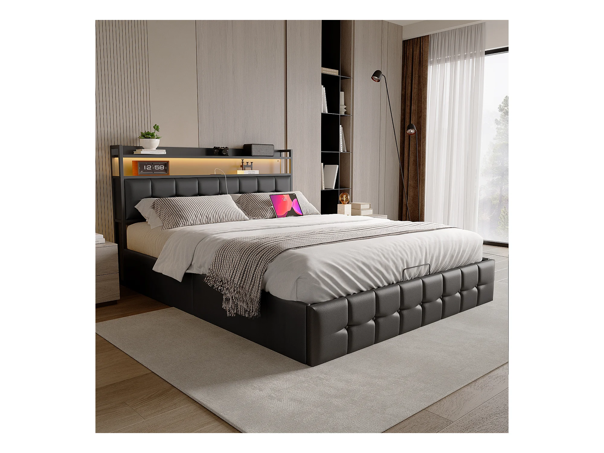 Lit coffre avec LED, lit adulte 140 x 200 cm, lit double avec sommier à lattes, port USB, Noir