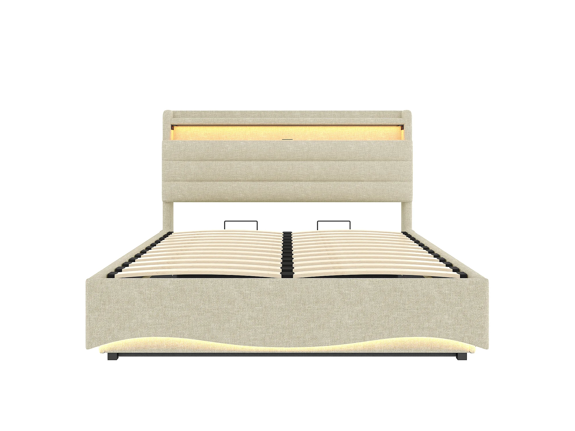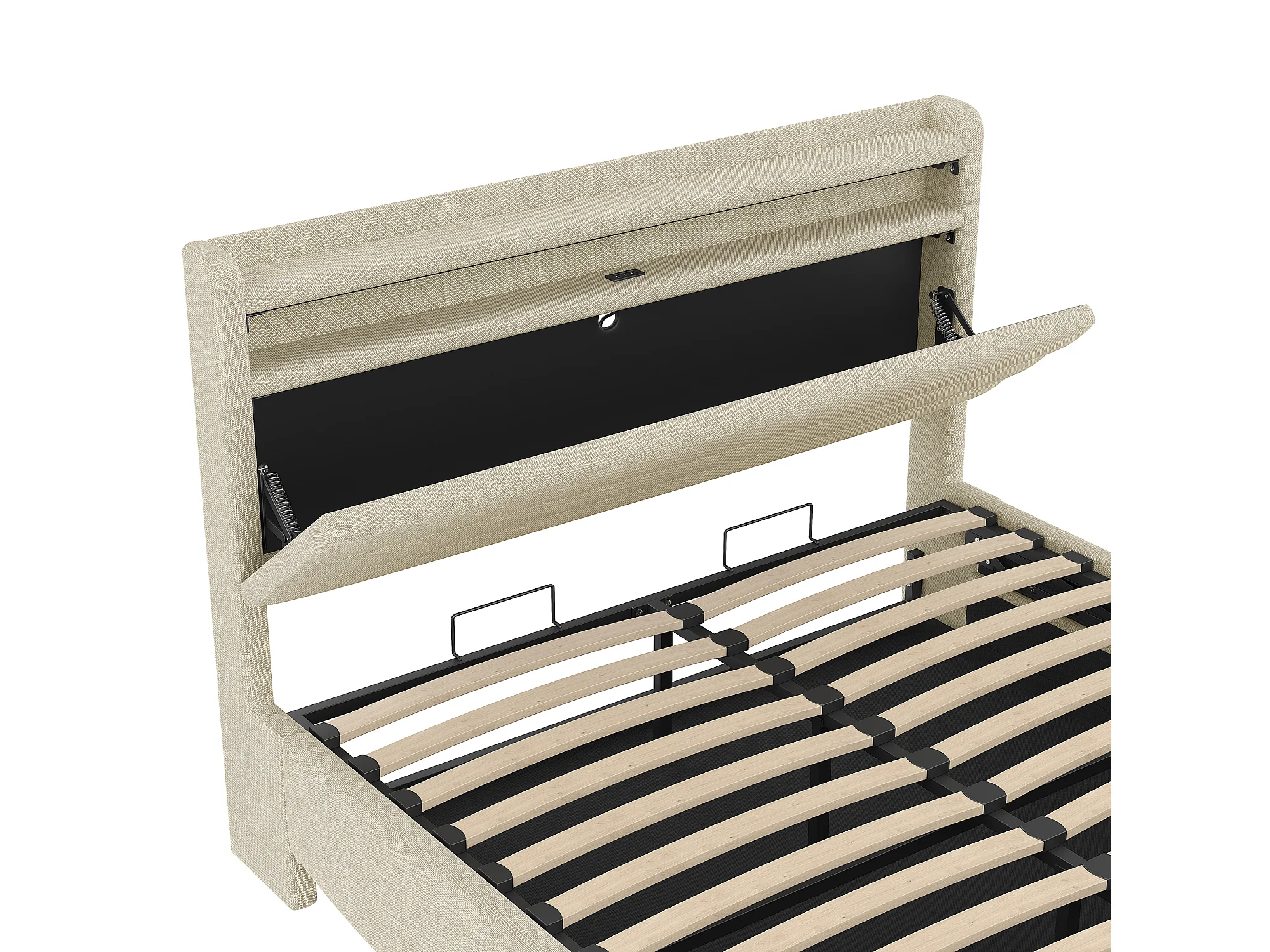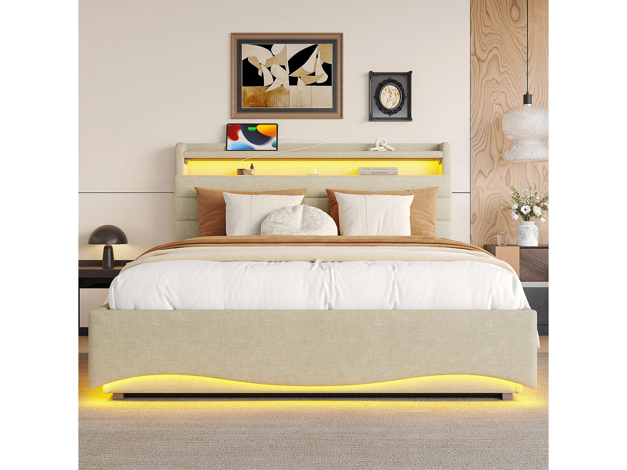 Lit coffre capitonné 140x200 cm - avec lumière LED - avec interface USB + Type-C - avec compartiments de rangement - tissu lin - beige (matelas non inclus)