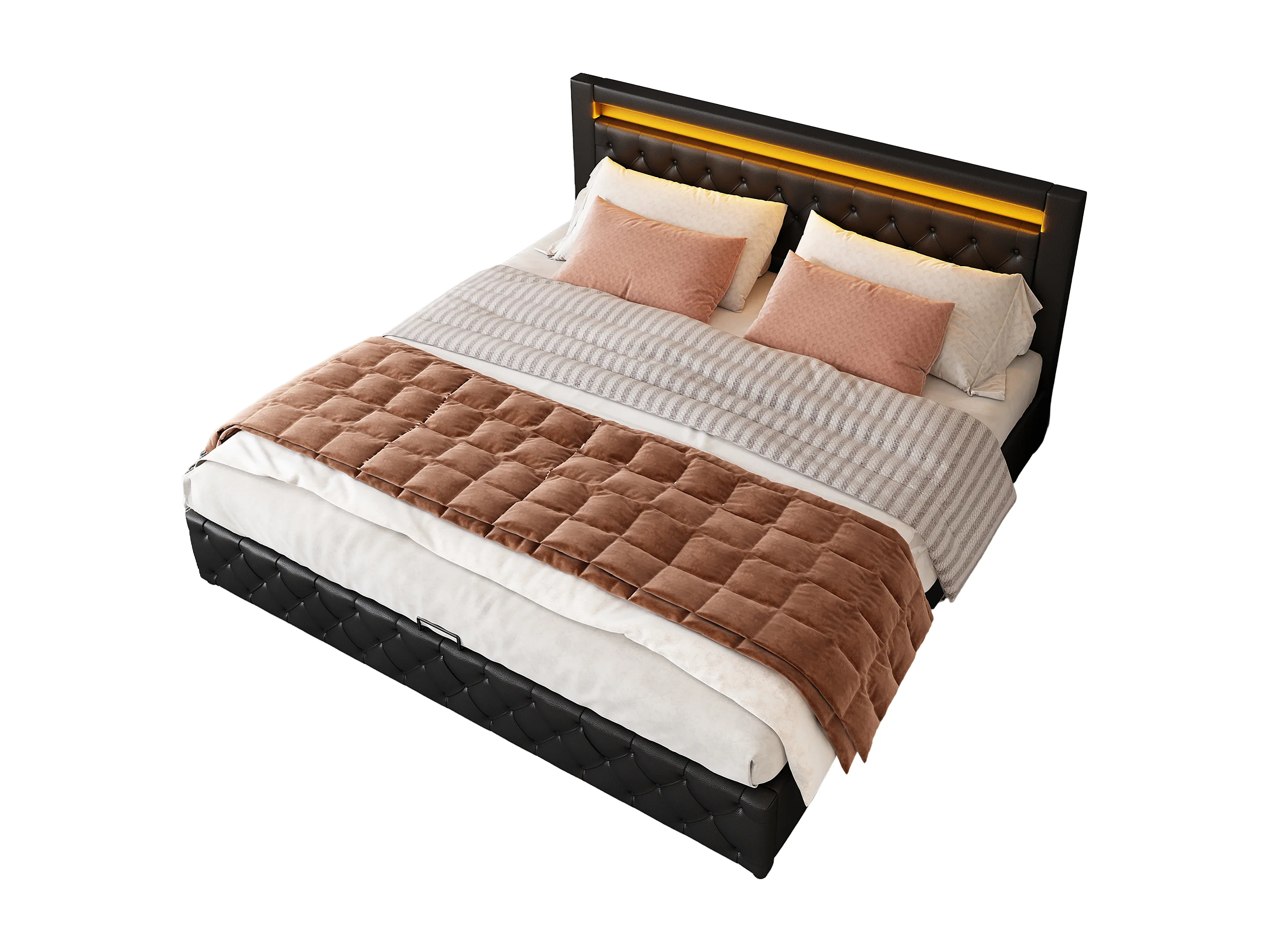 Lit coffre adulte 180x200 cm en PU noir - avec sommier à lattes et LED multicolores, sans matelas