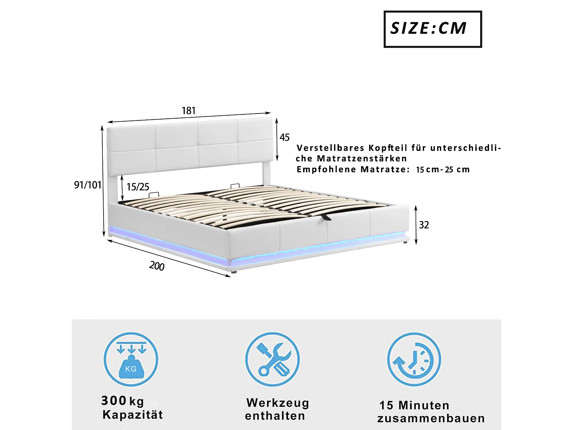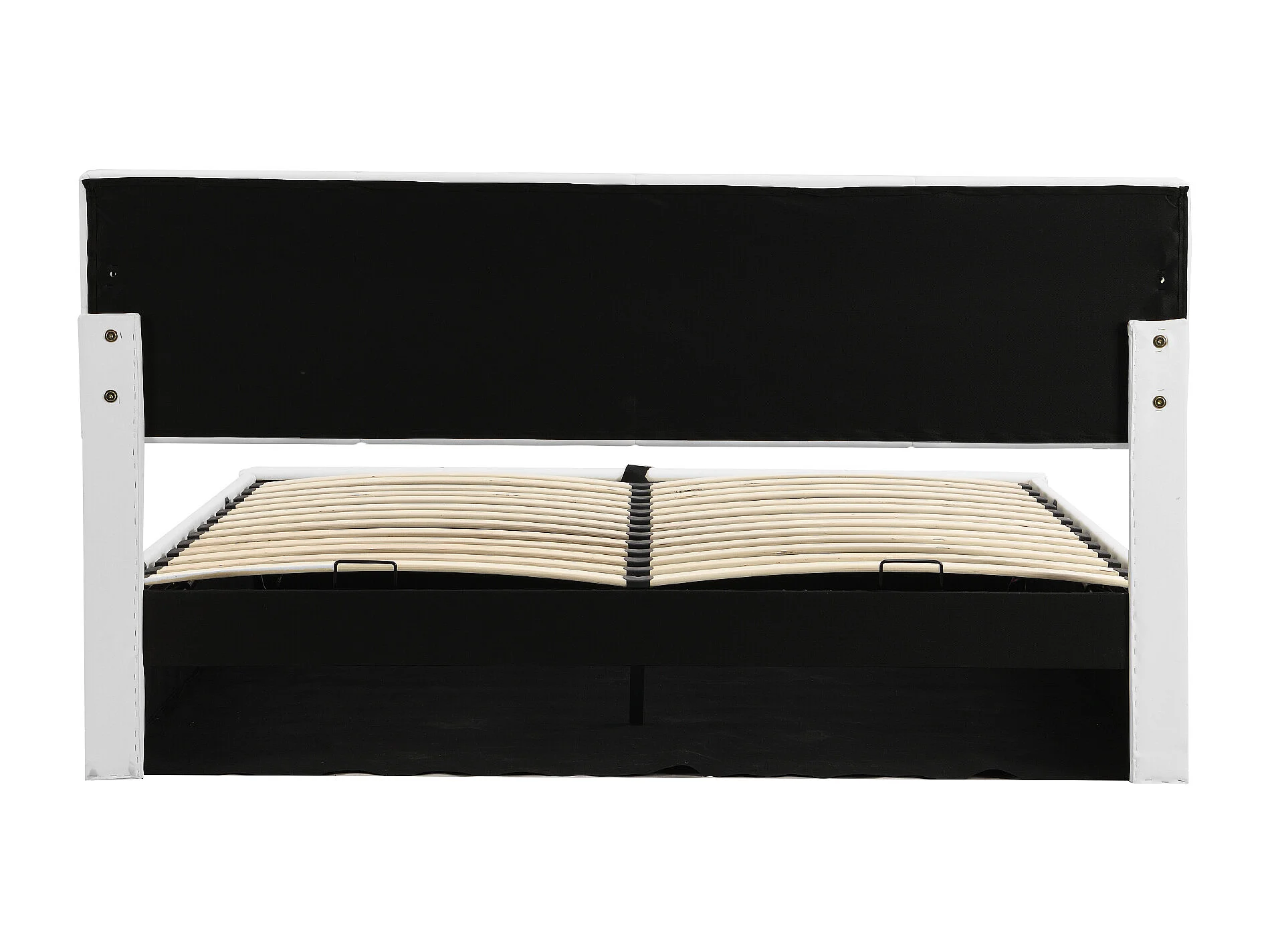 Lit coffre double adulte 180x200cm avec LED - Tête de lit réglable - Simili cuir PU blanc