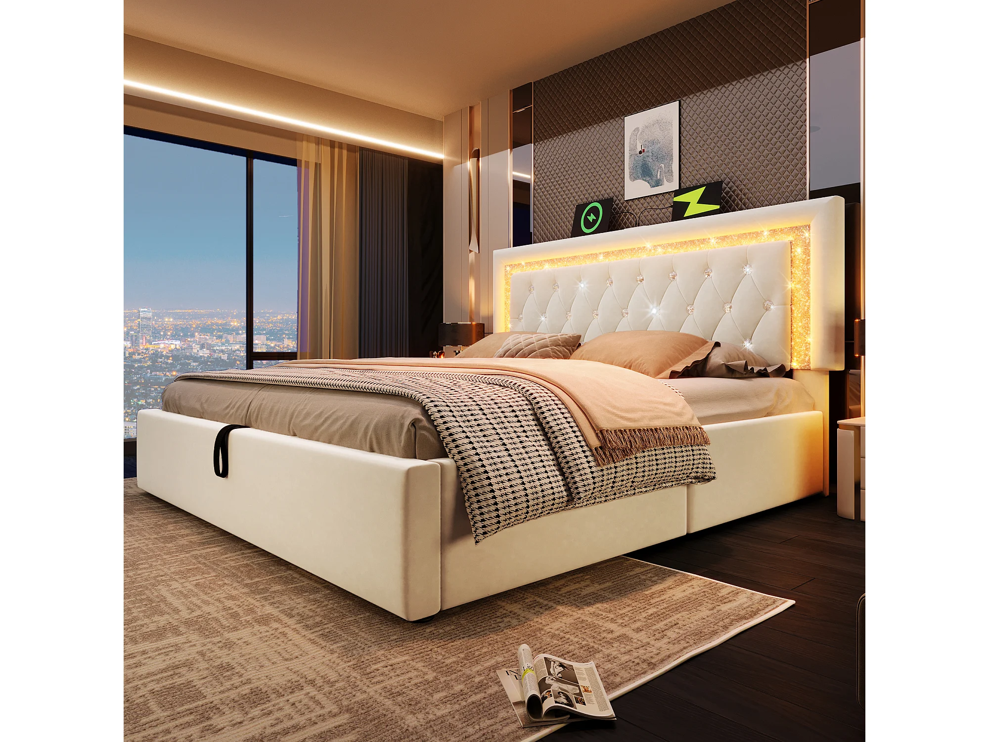 Lit coffre double capitonné - 160 x 200 cm - tête de lit avec Leds + USB et Type-C - rangement hydraulique - velours - beige