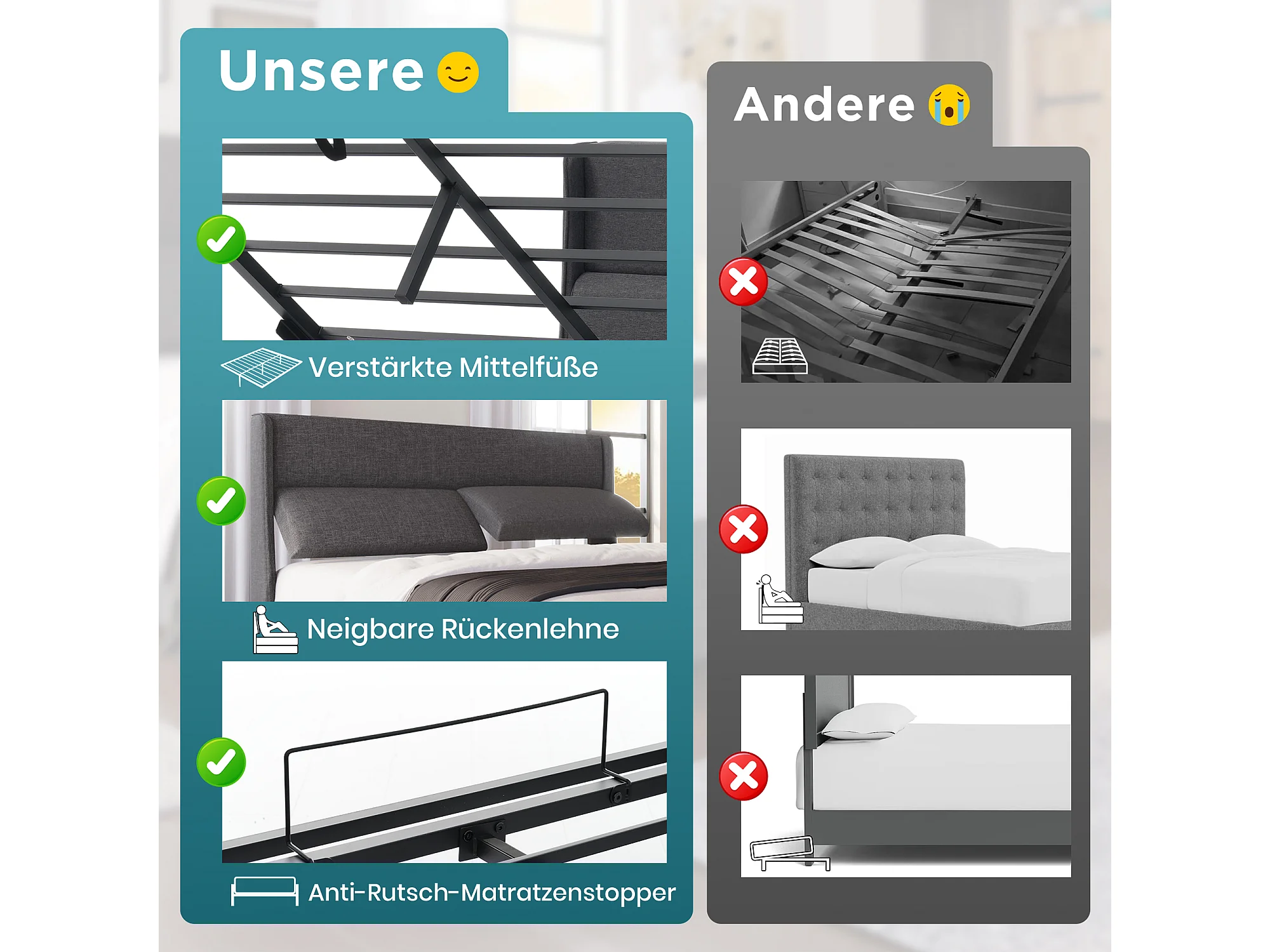 Lit coffre rembourré double - 180 x 200 cm - avec porte-gobelet caché et station de charge - lin - gris