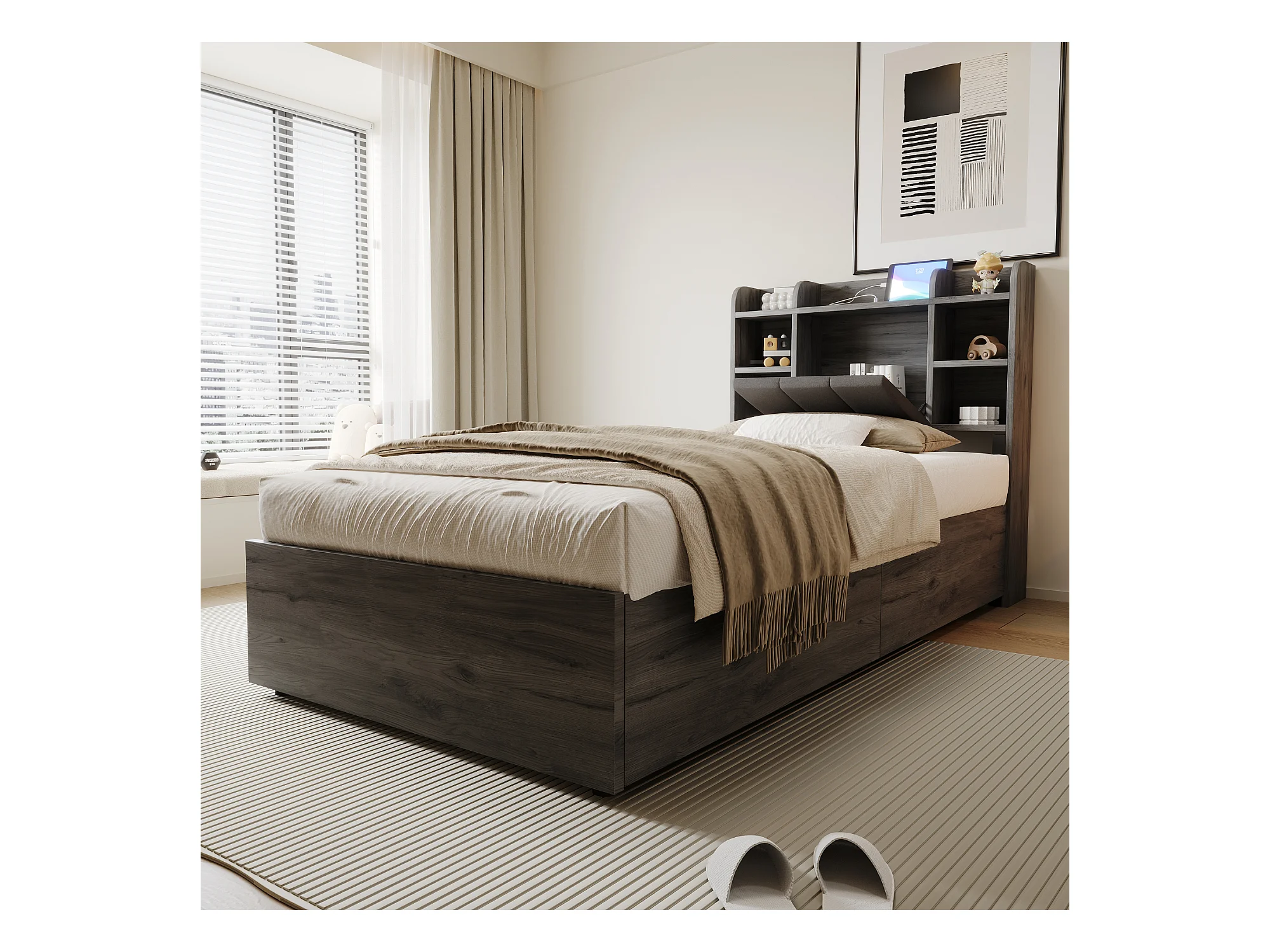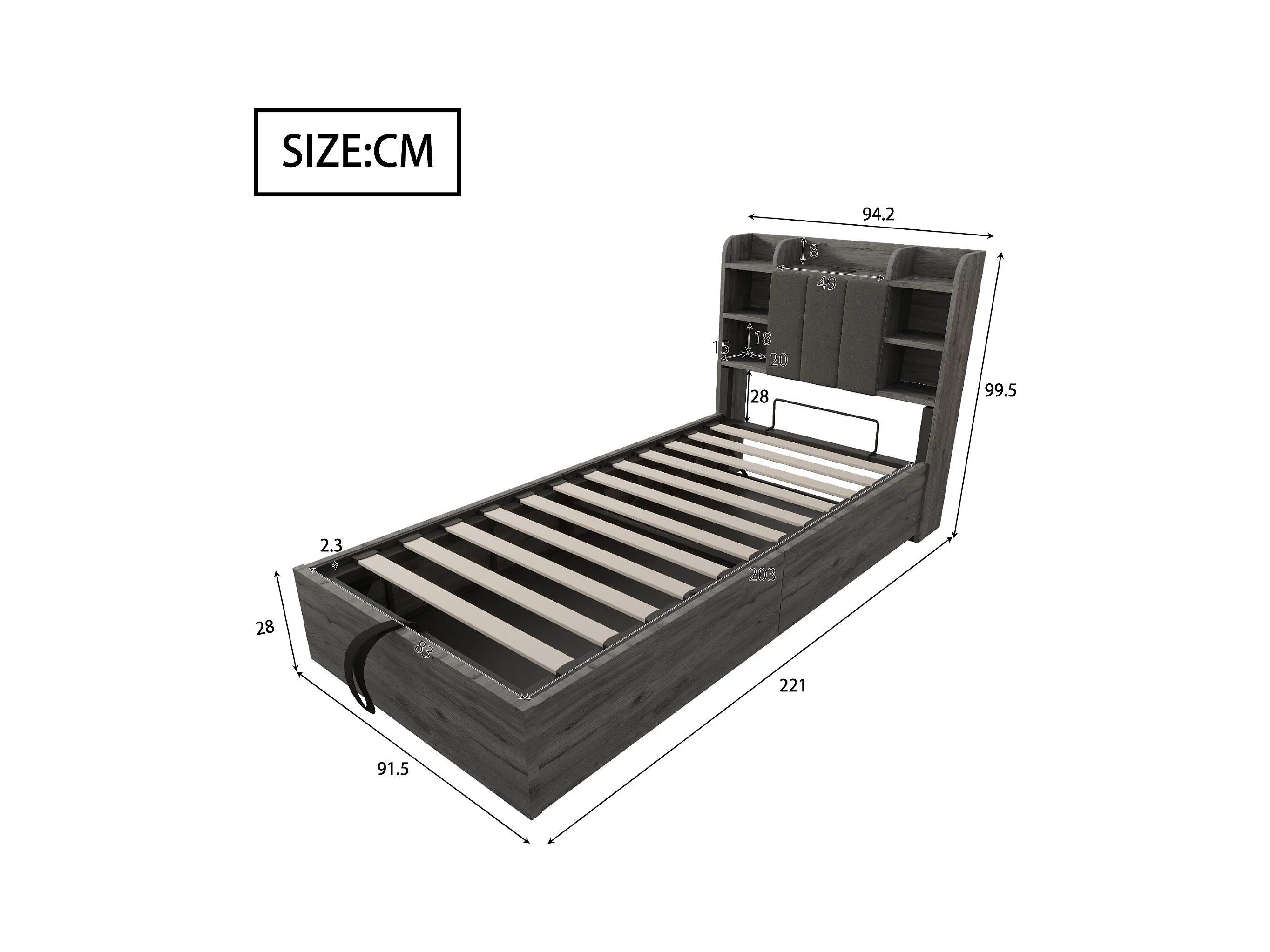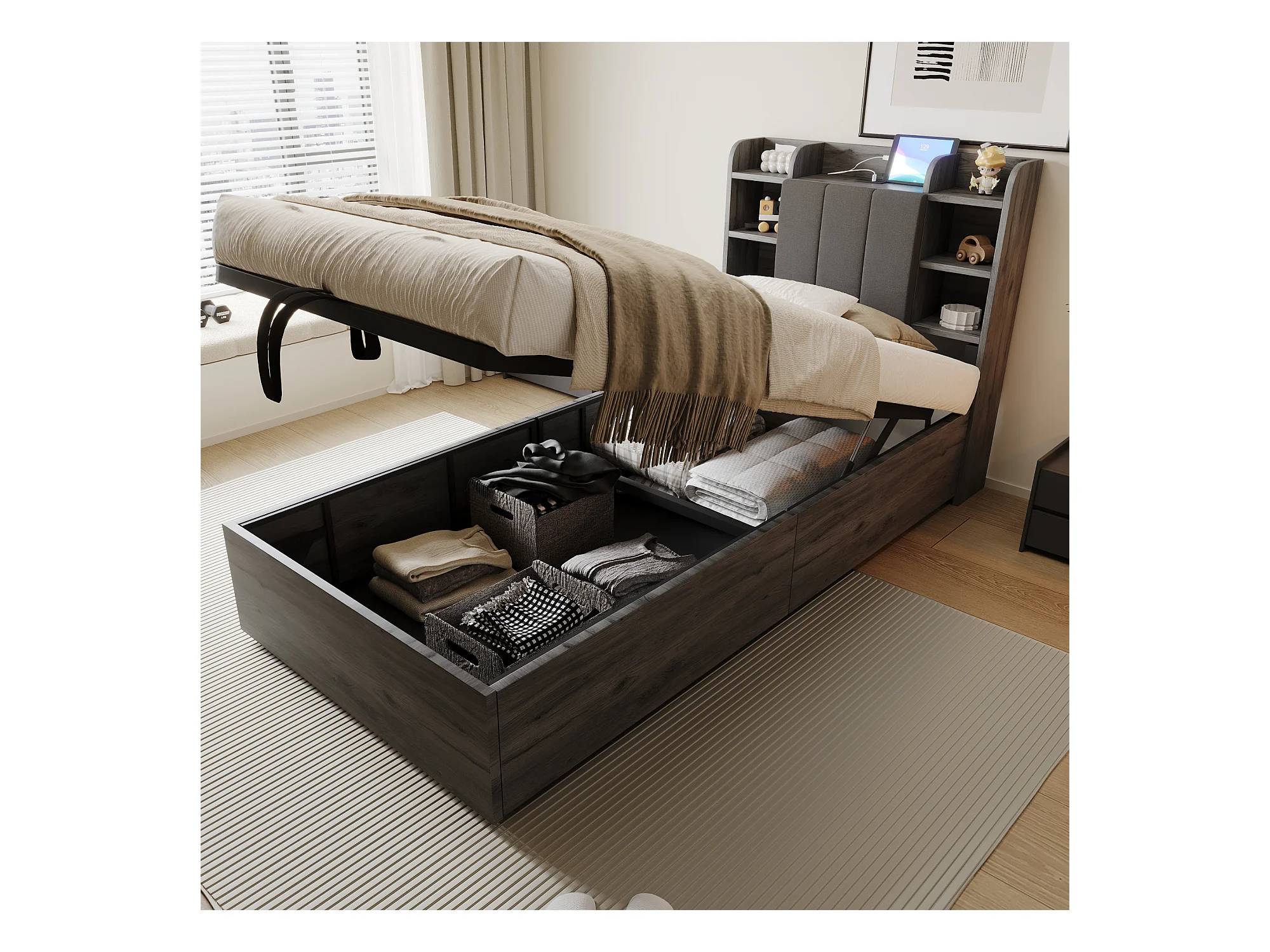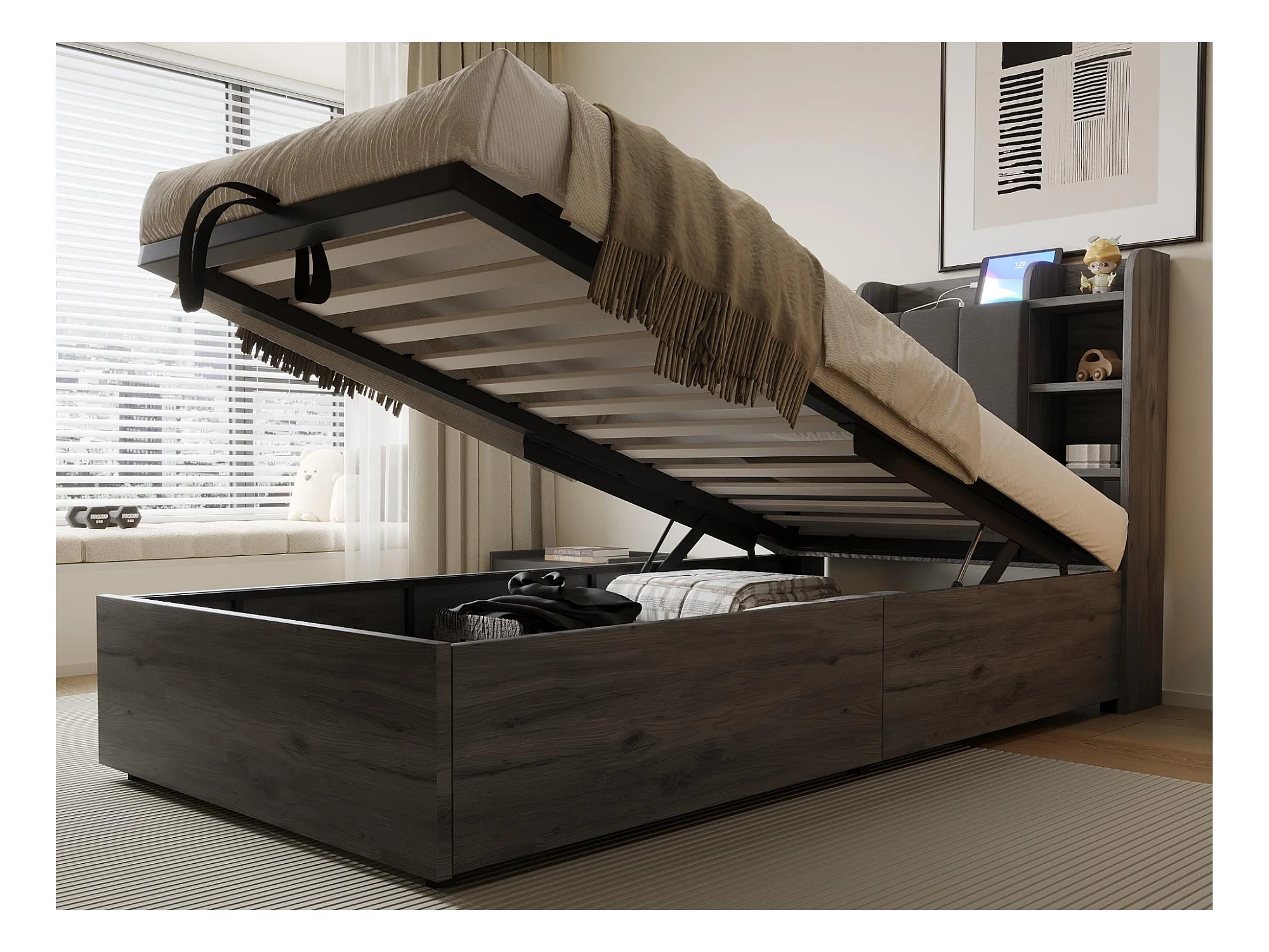 Lit coffre en bois 90x200 cm - tête de lit avec rangement - avec prises USB + Type-C - gris (matelas non inclus)