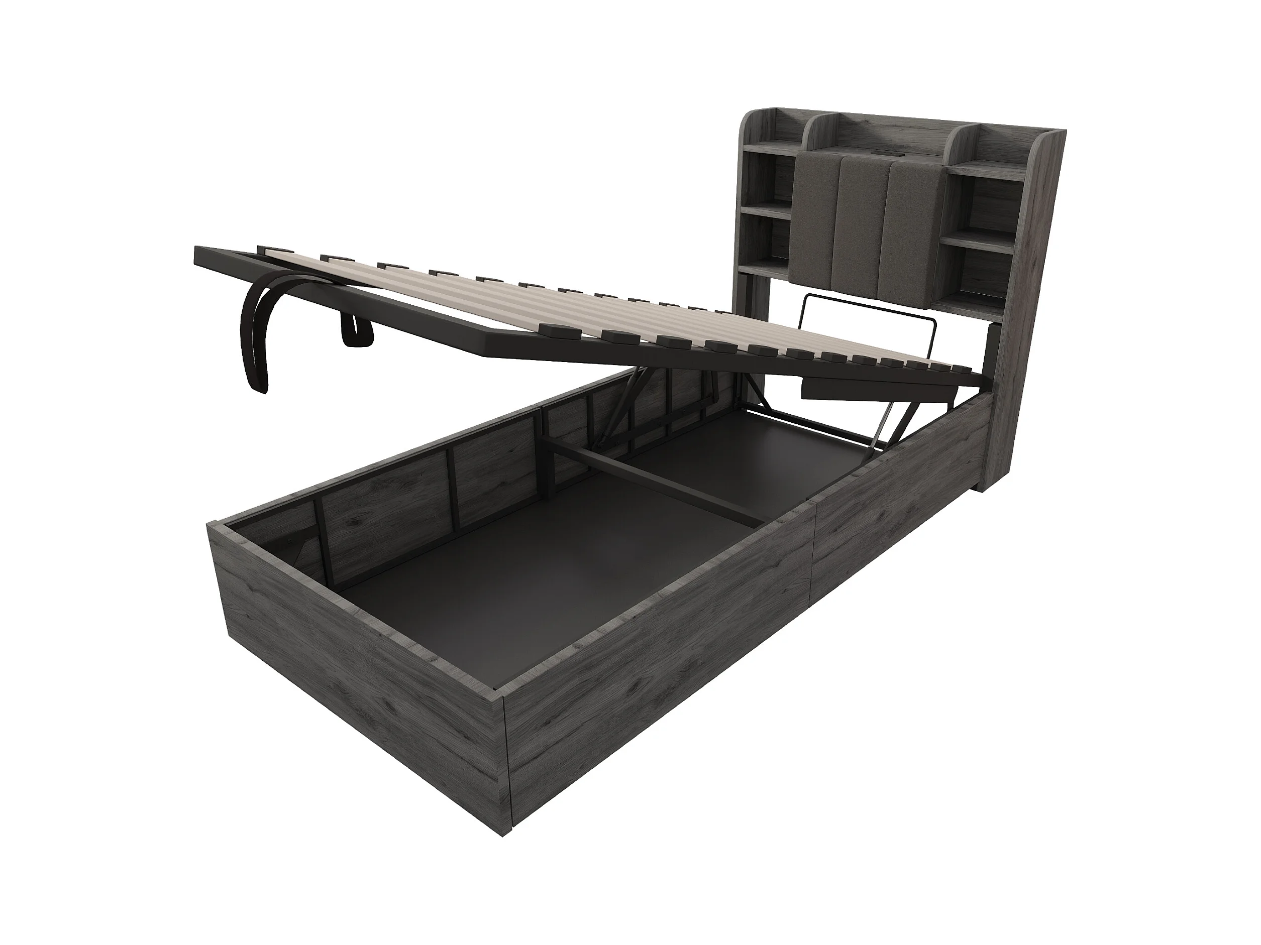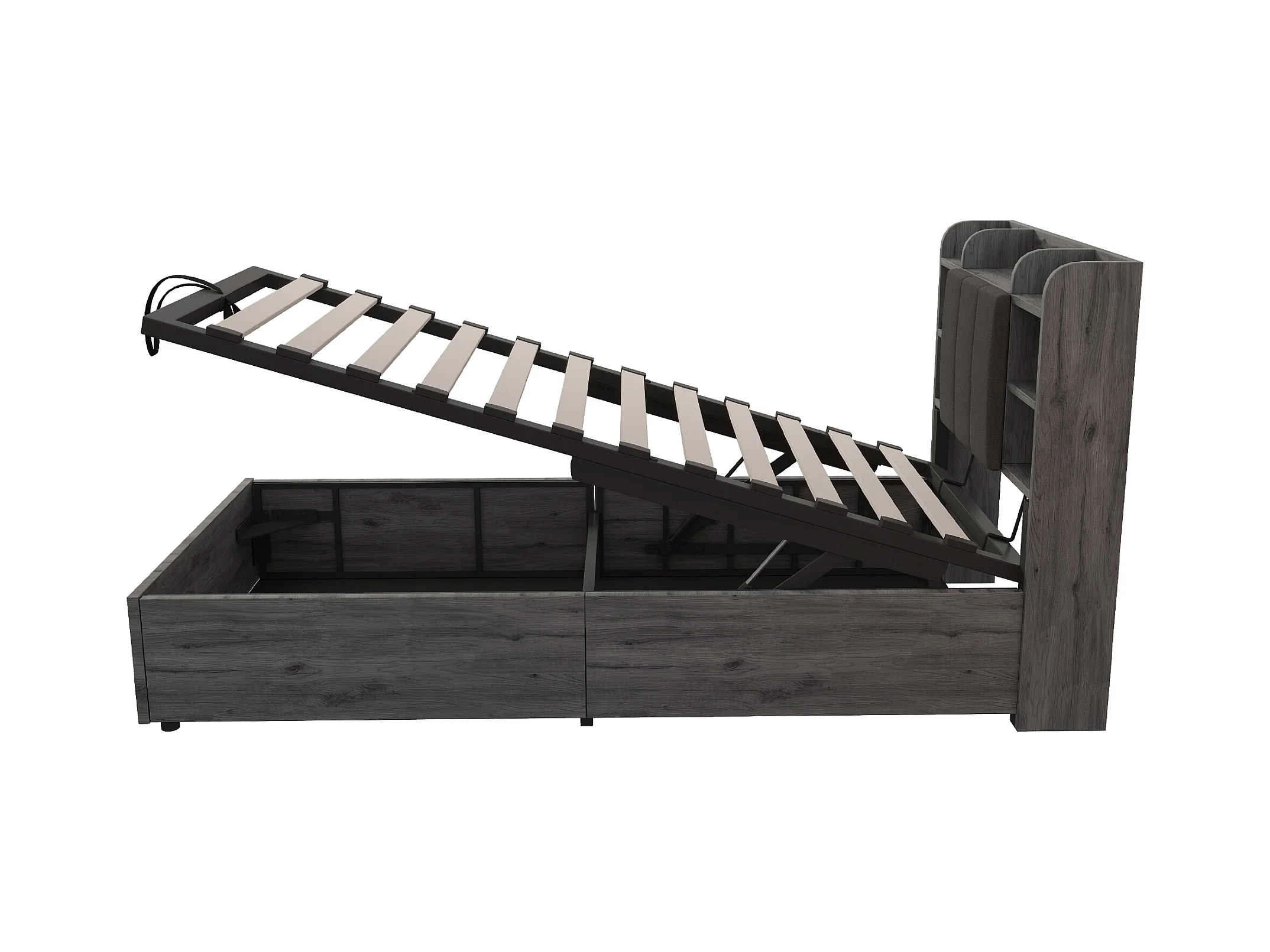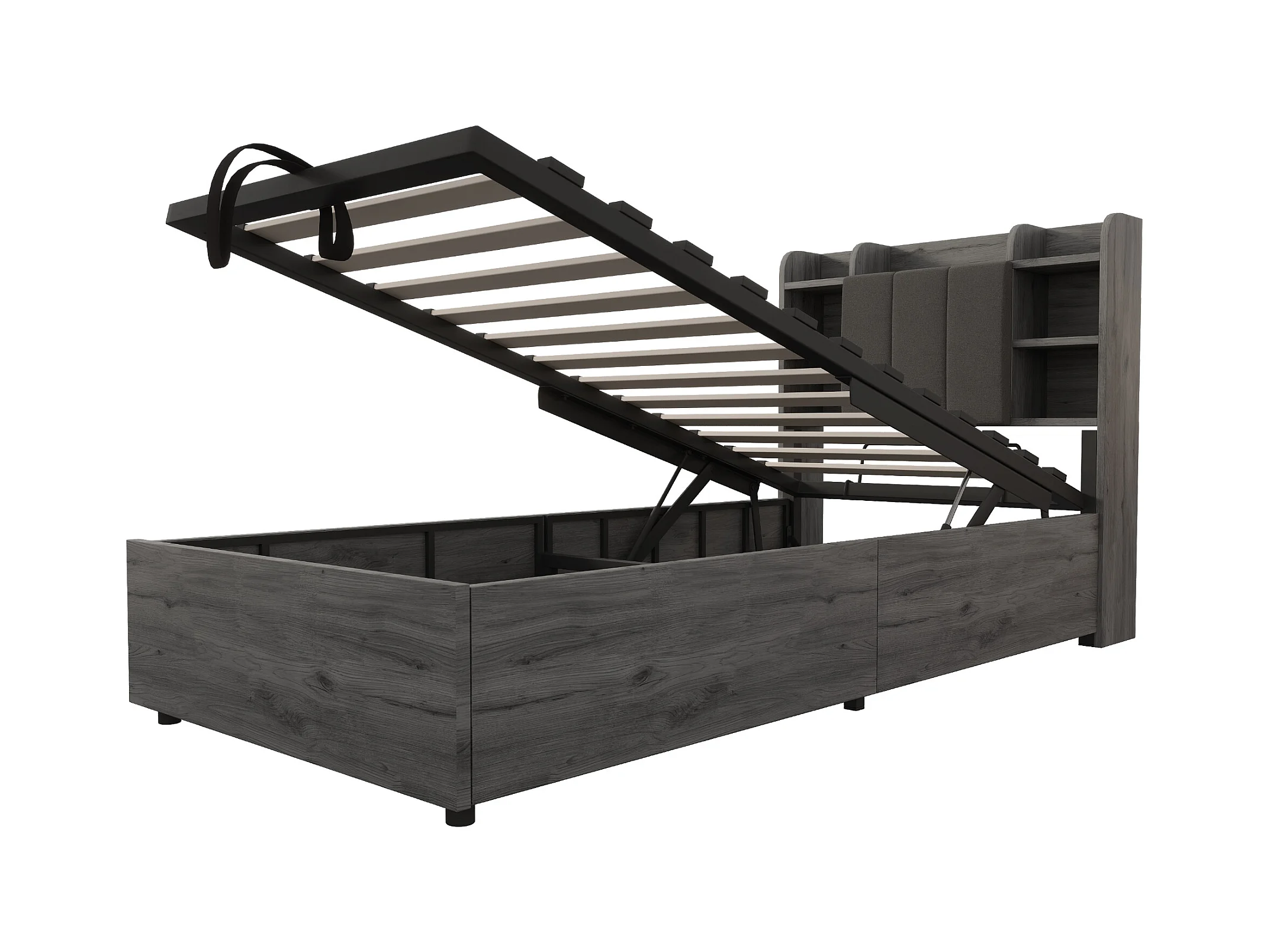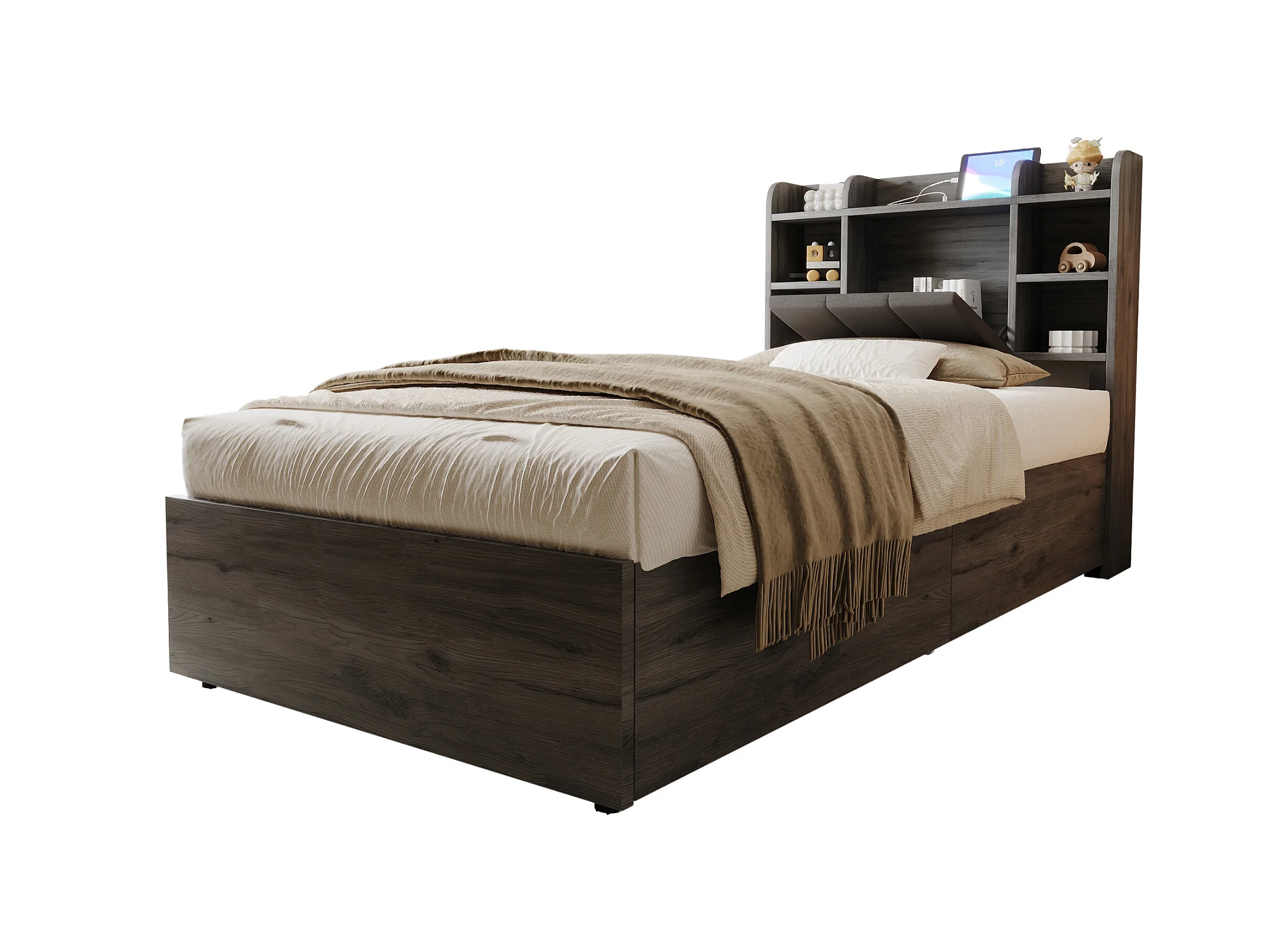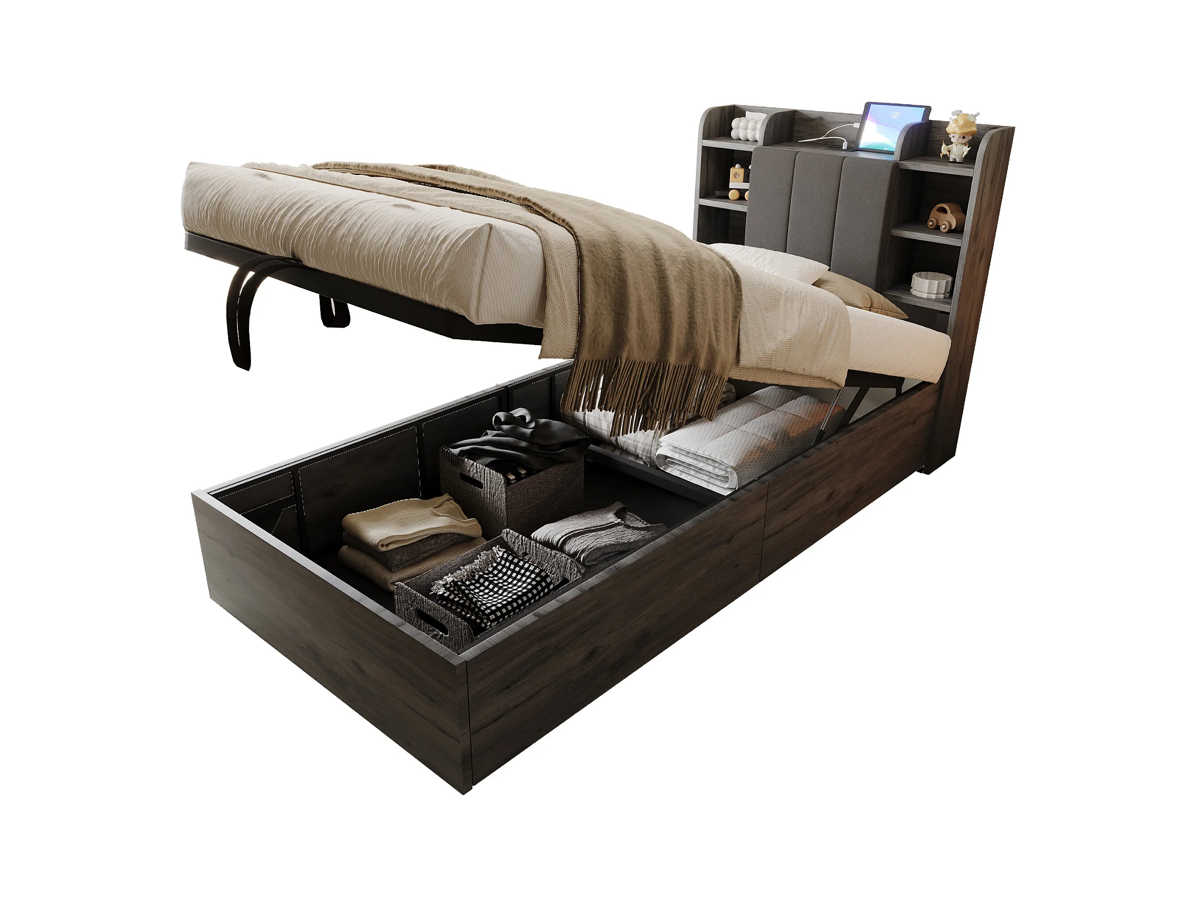 Lit coffre en bois 90x200 cm - tête de lit avec rangement - avec prises USB + Type-C - gris (matelas non inclus)