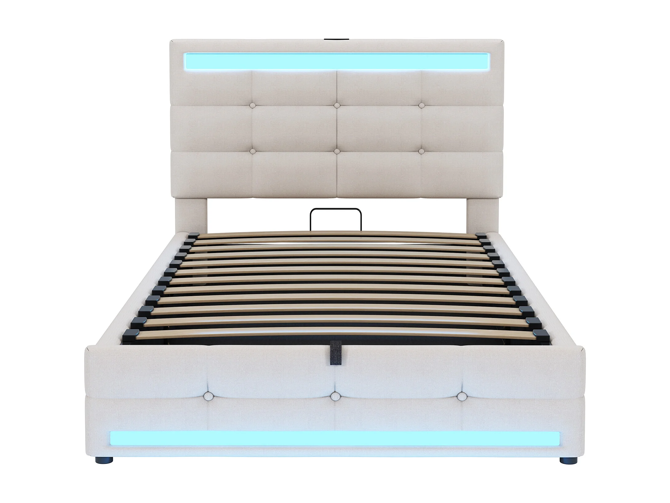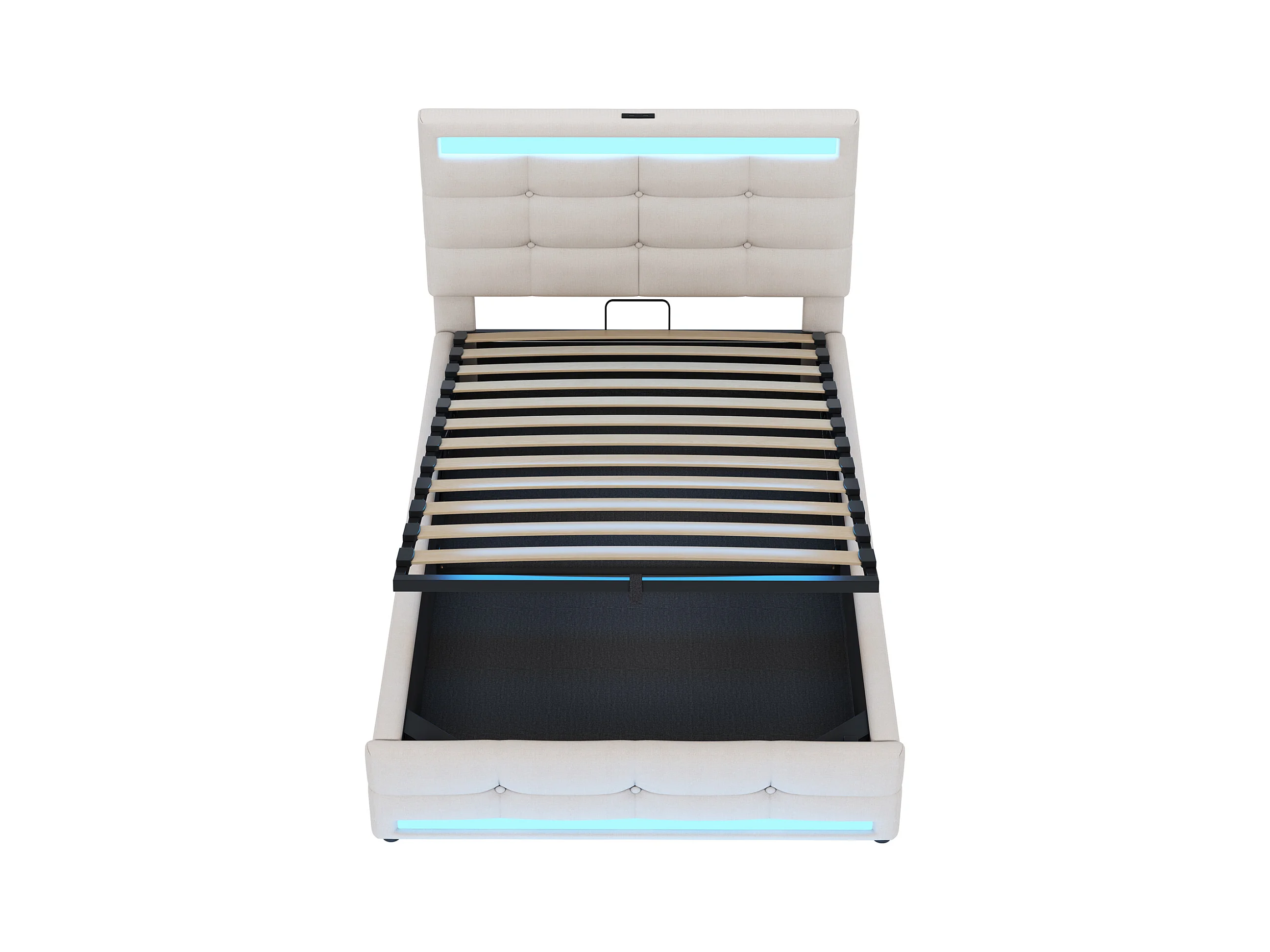 lit coffre enfant 90x200cm avec LED et USB, tête de lit réglable en hauteur, tissu en lin beige, sans matelas