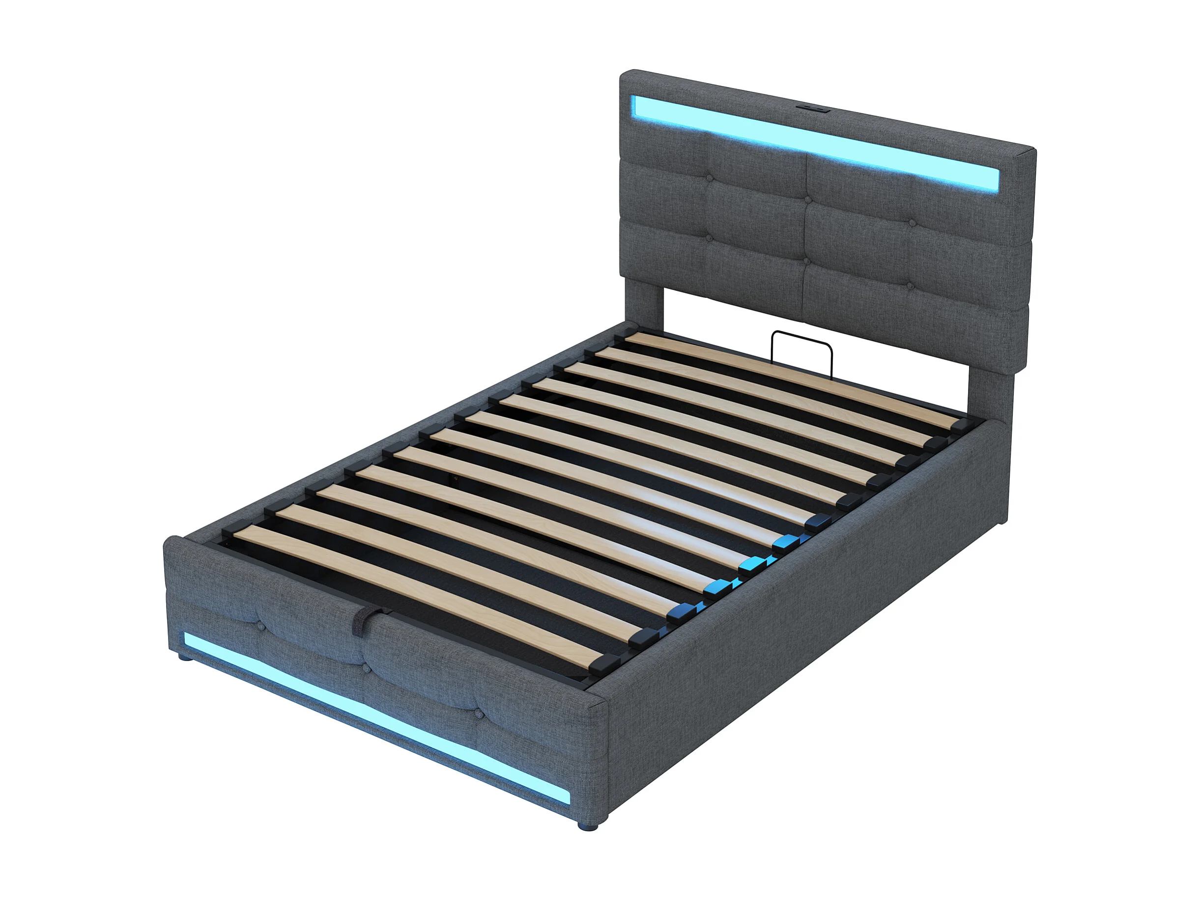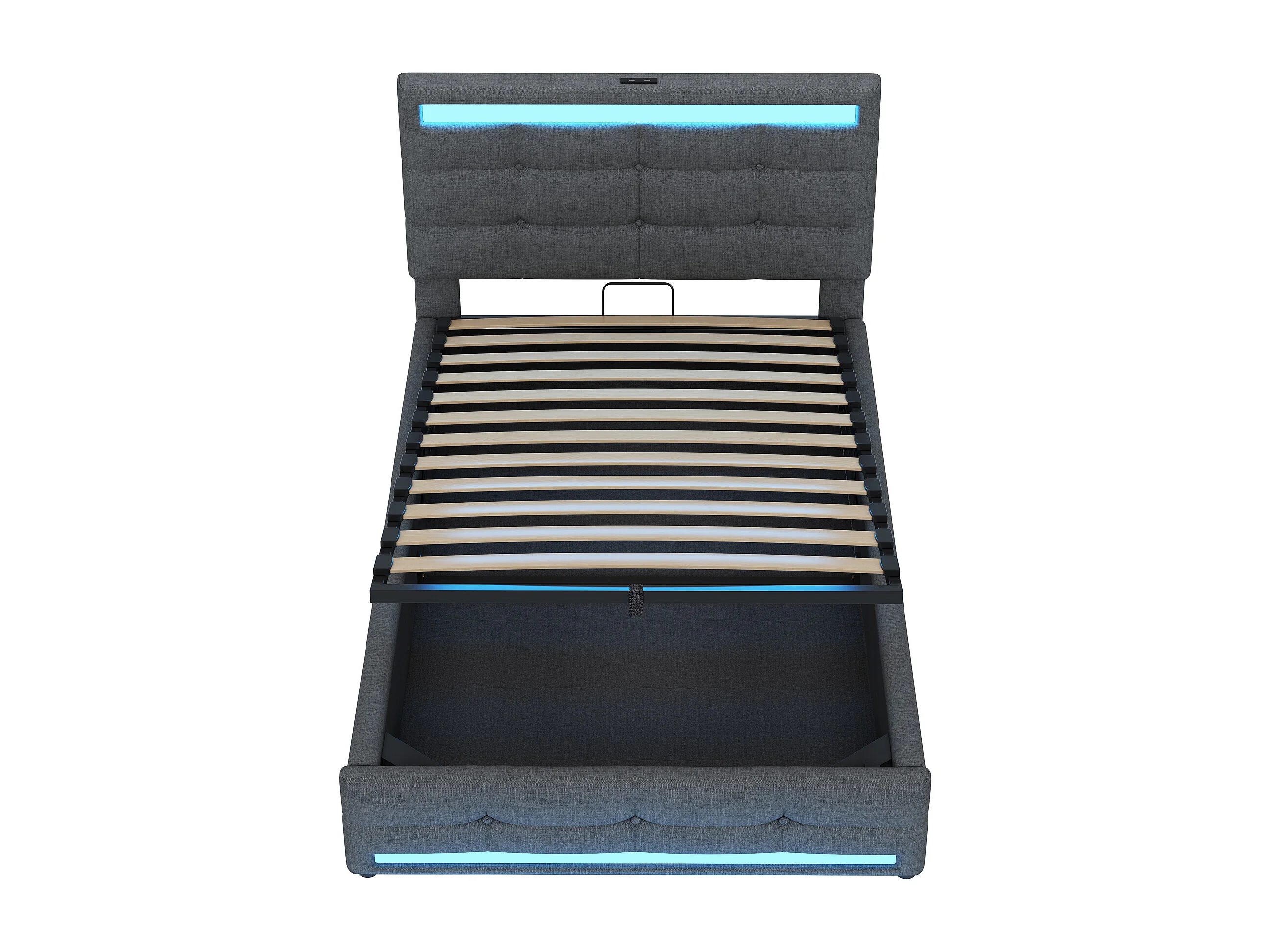lit coffre enfant 90x200cm avec LED et USB, tête de lit réglable en hauteur, tissu en lin gris, sans matelas