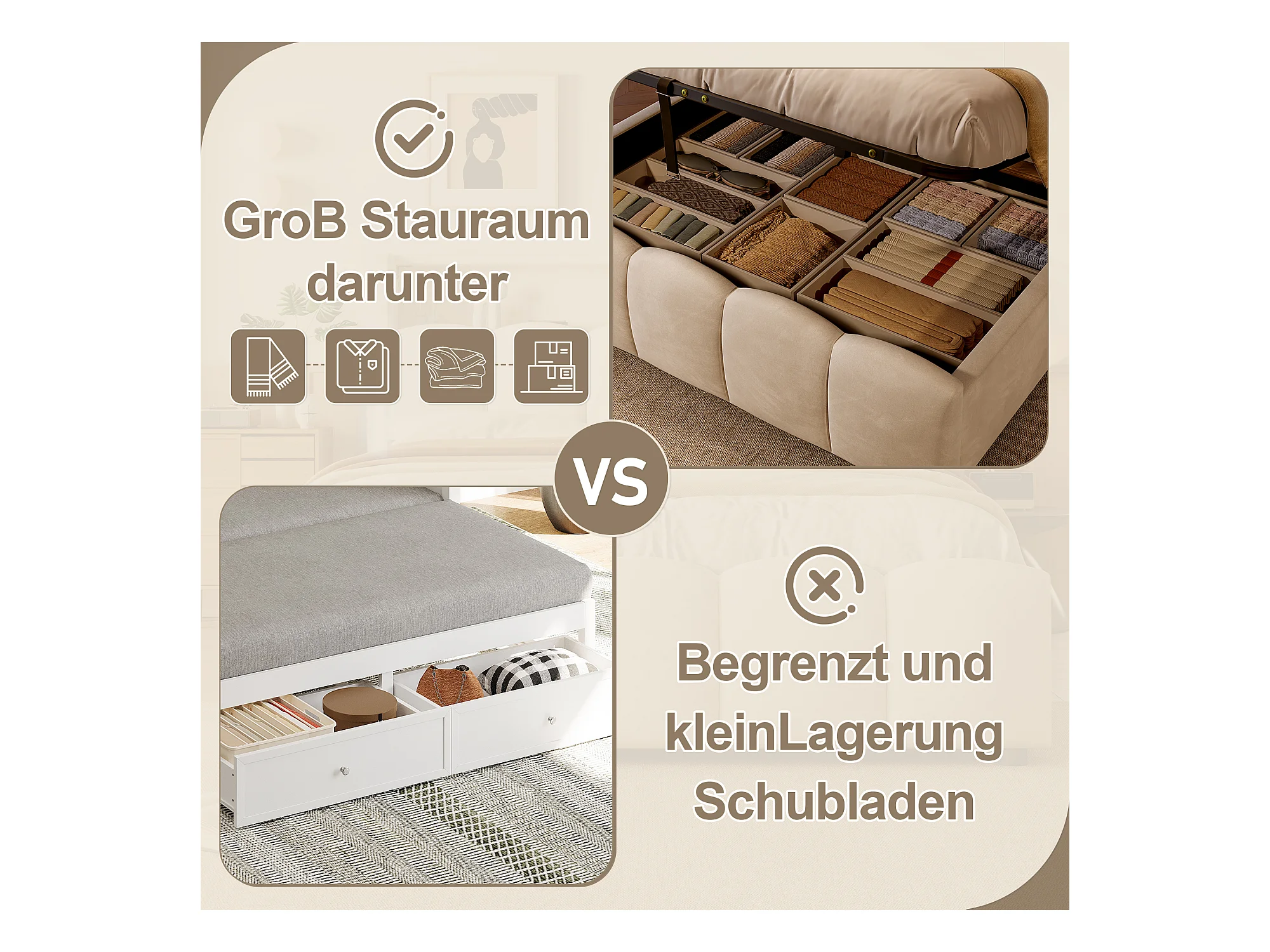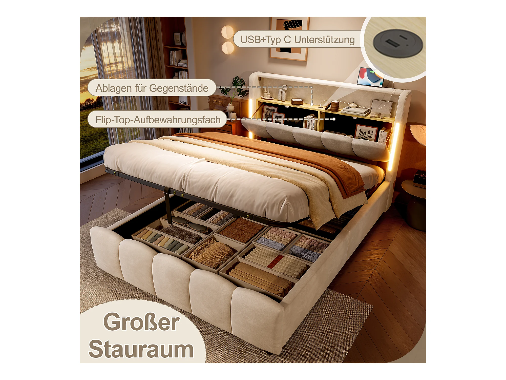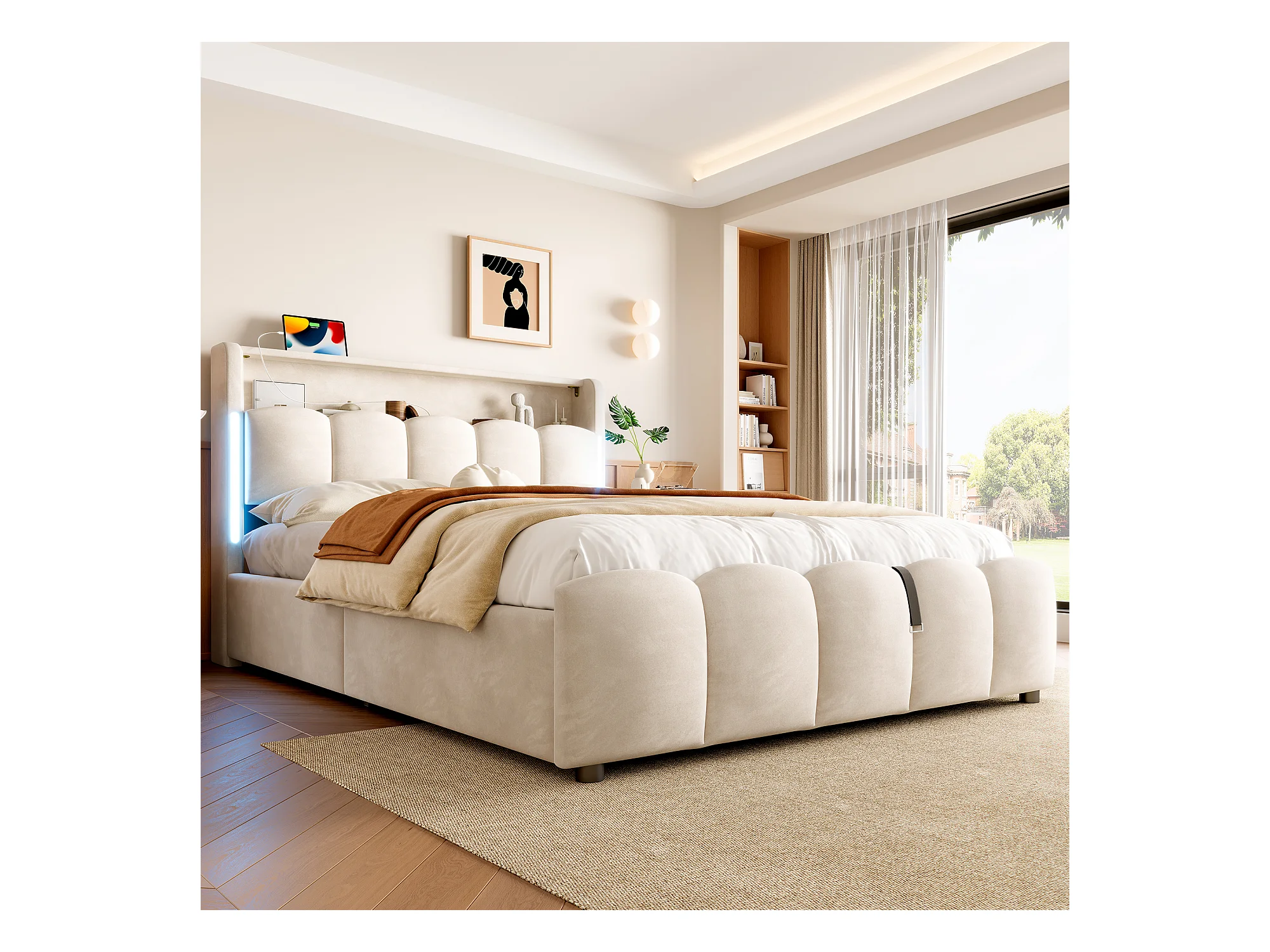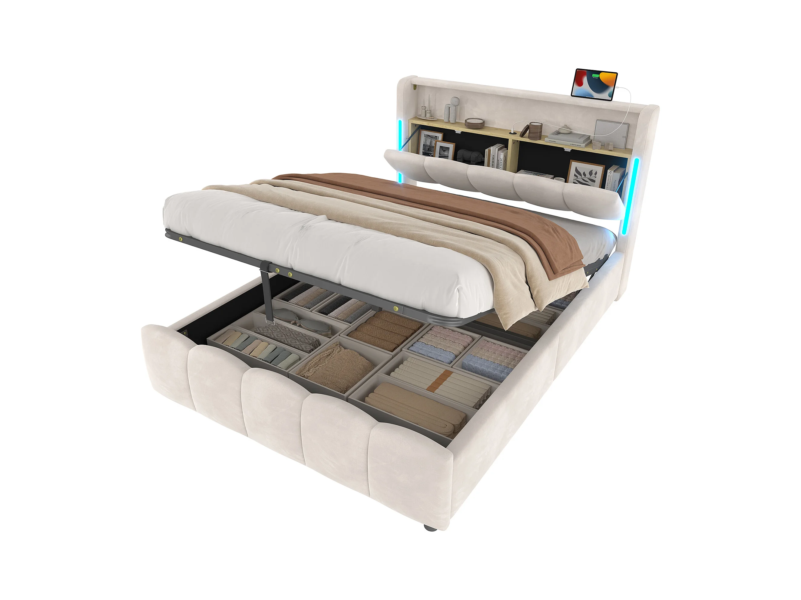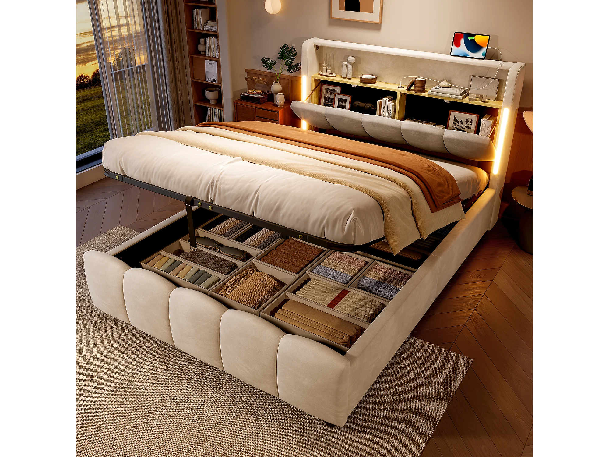 Lit coffre hydraulique rembourré - 140 x 200 cm - avec Leds + tête de lit avec rangements + avec USB /Type-C - velours - beige
