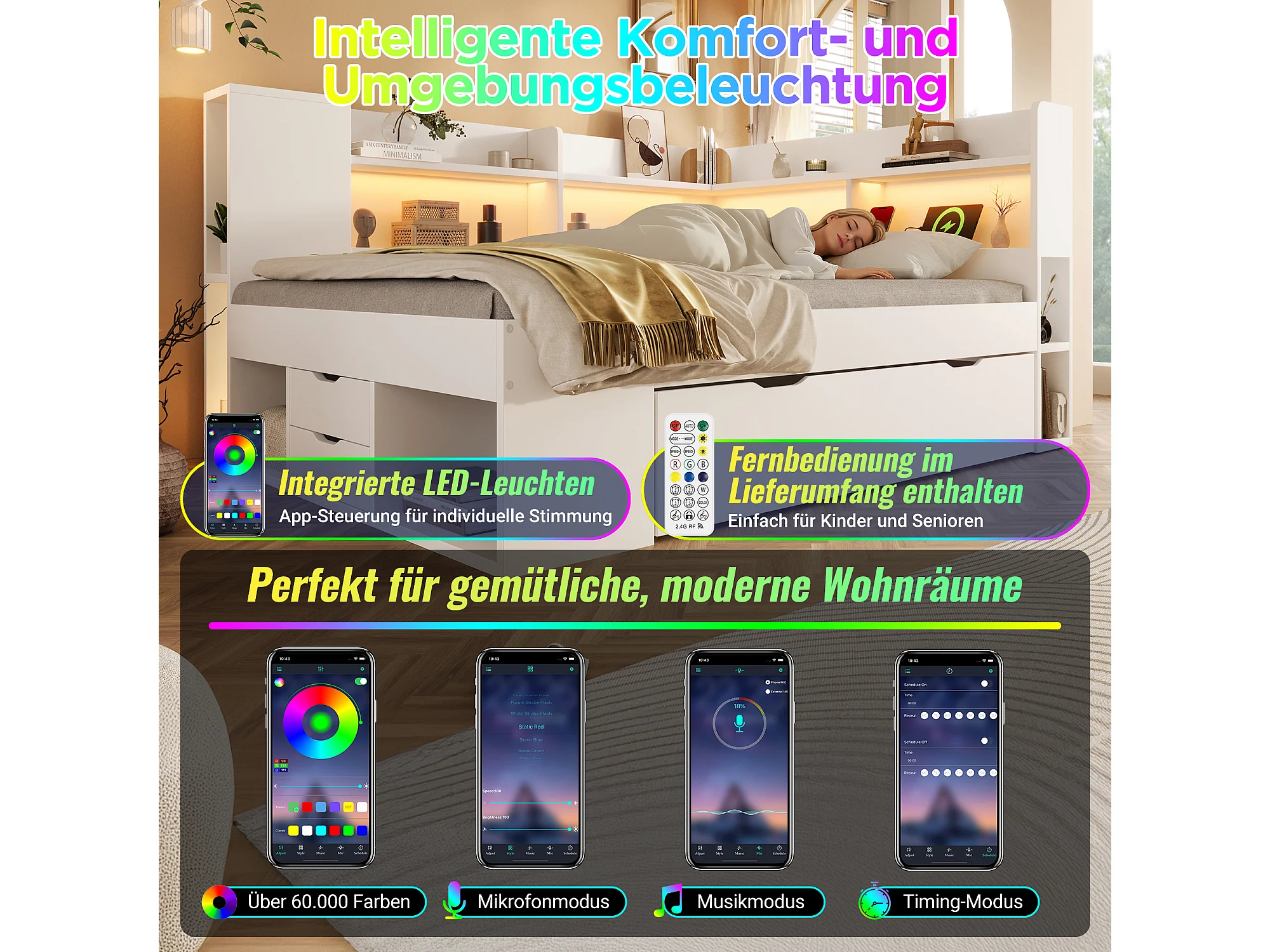Lit coffre pour enfant - 140 x 200 cm - avec Leds + USB + étagères + tiroirs de rangement - bois - blanc(matelas inclus)