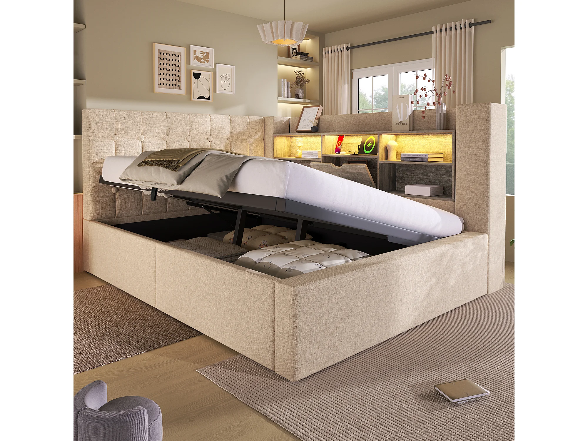 Lit coffre rembourré - 140 x 200 cm - avec Leds + rangement hydraulique + tête de lit L avec rangement - lin - beige