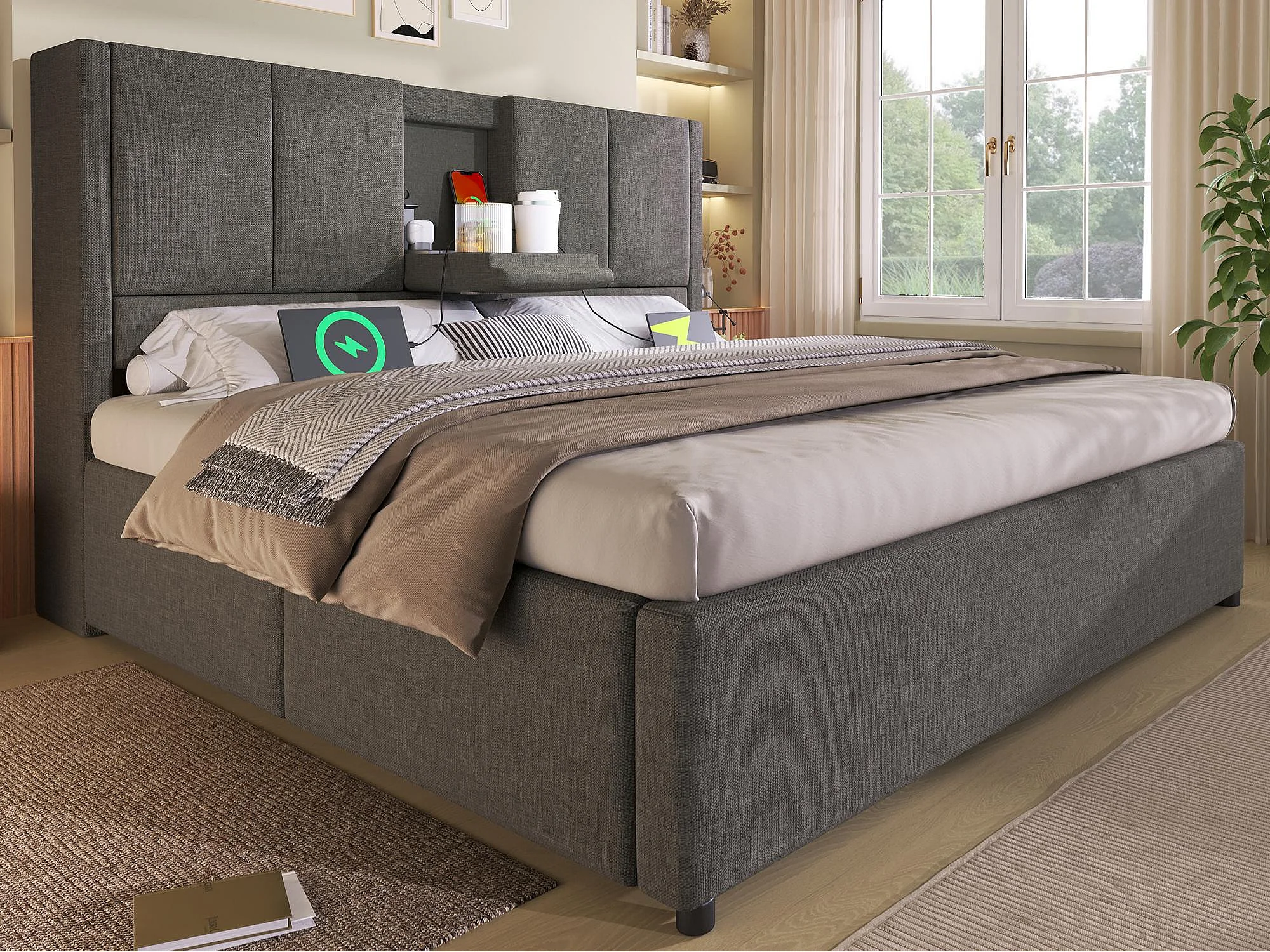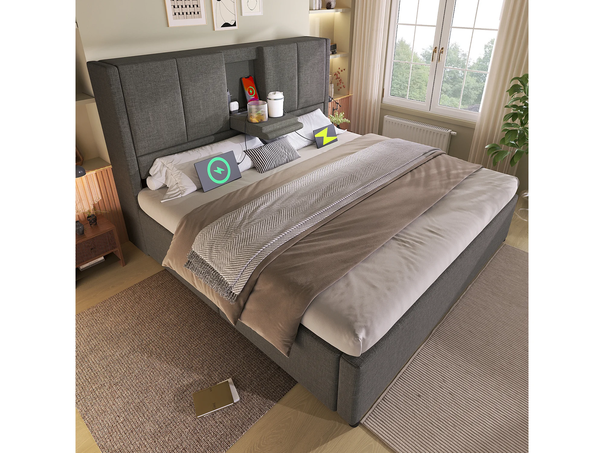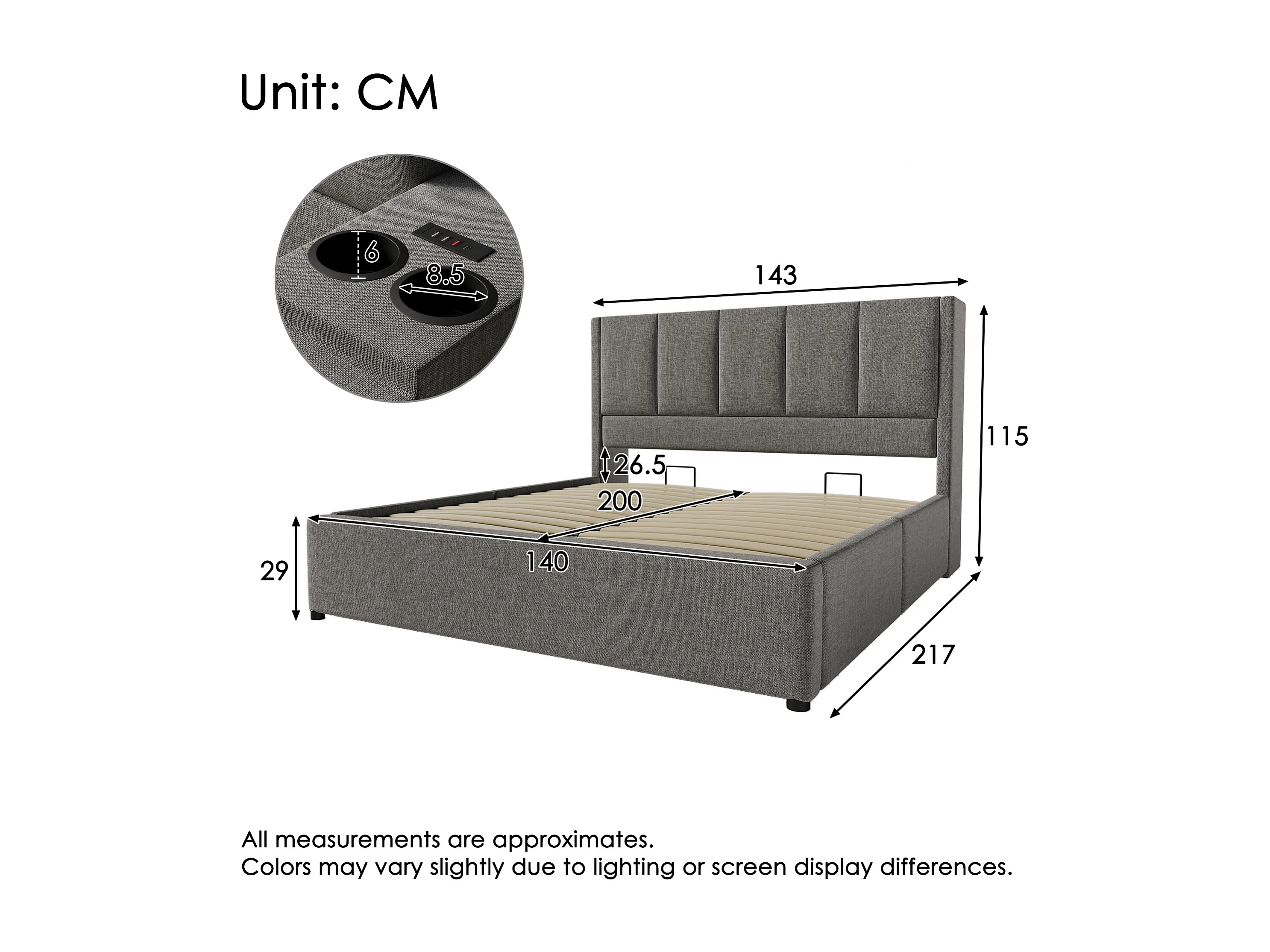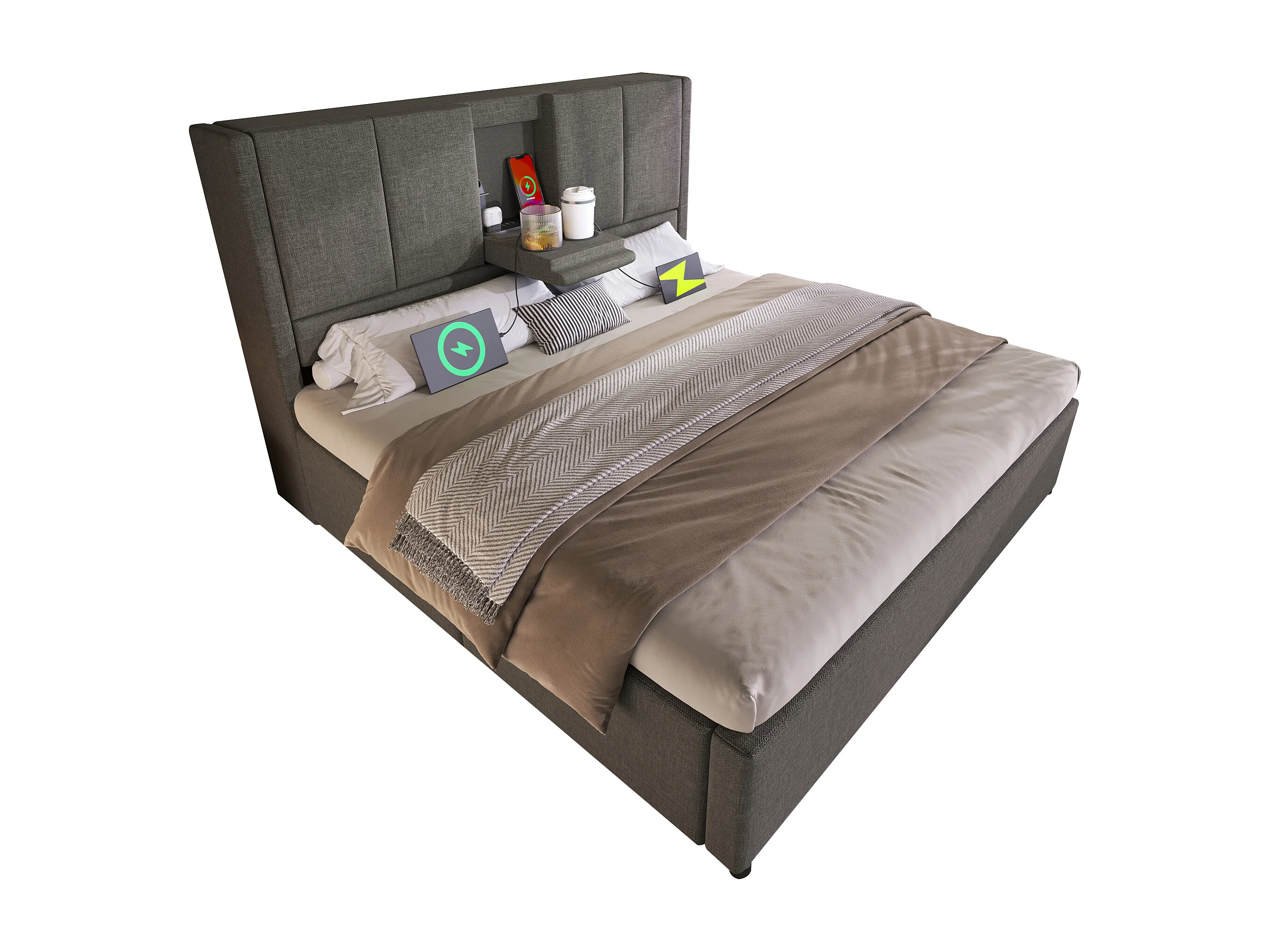 Lit coffre rembourré 140x200cm - avec porte-gobelet caché - avec ports USB et Type-C - avec sommier à lattes - Lin - Gris (sans matelas)