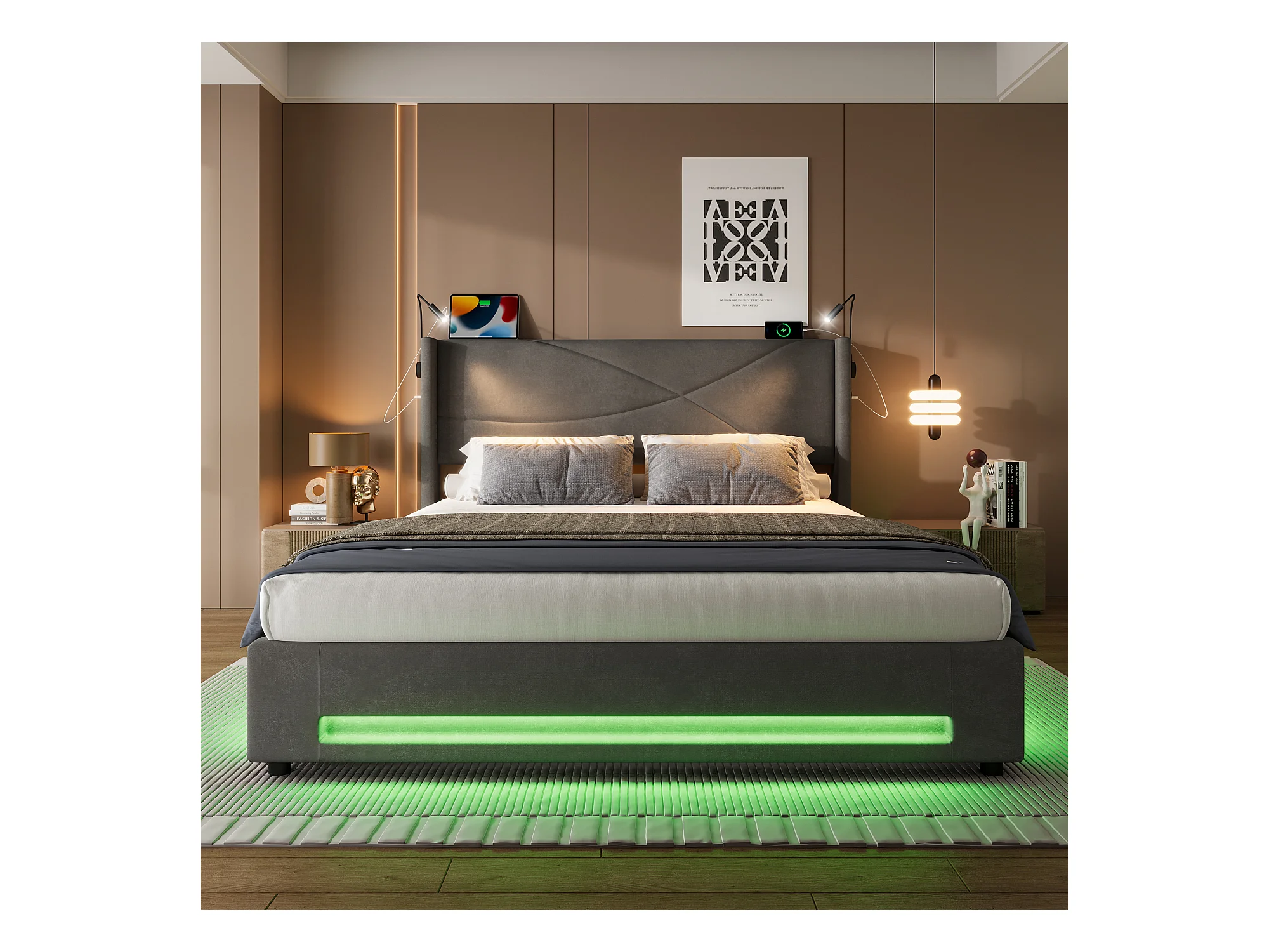 Lit coffre rembourré - 160 x 200 cm - avec Leds + USB Type-C + tête de lit avec rangement - velours - gris