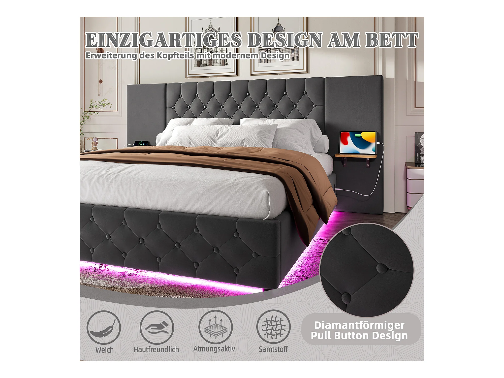 Lit coffre rembourré - 160 x 200 cm - avec ports USB + Leds - rangement hydraulique - velours - gris