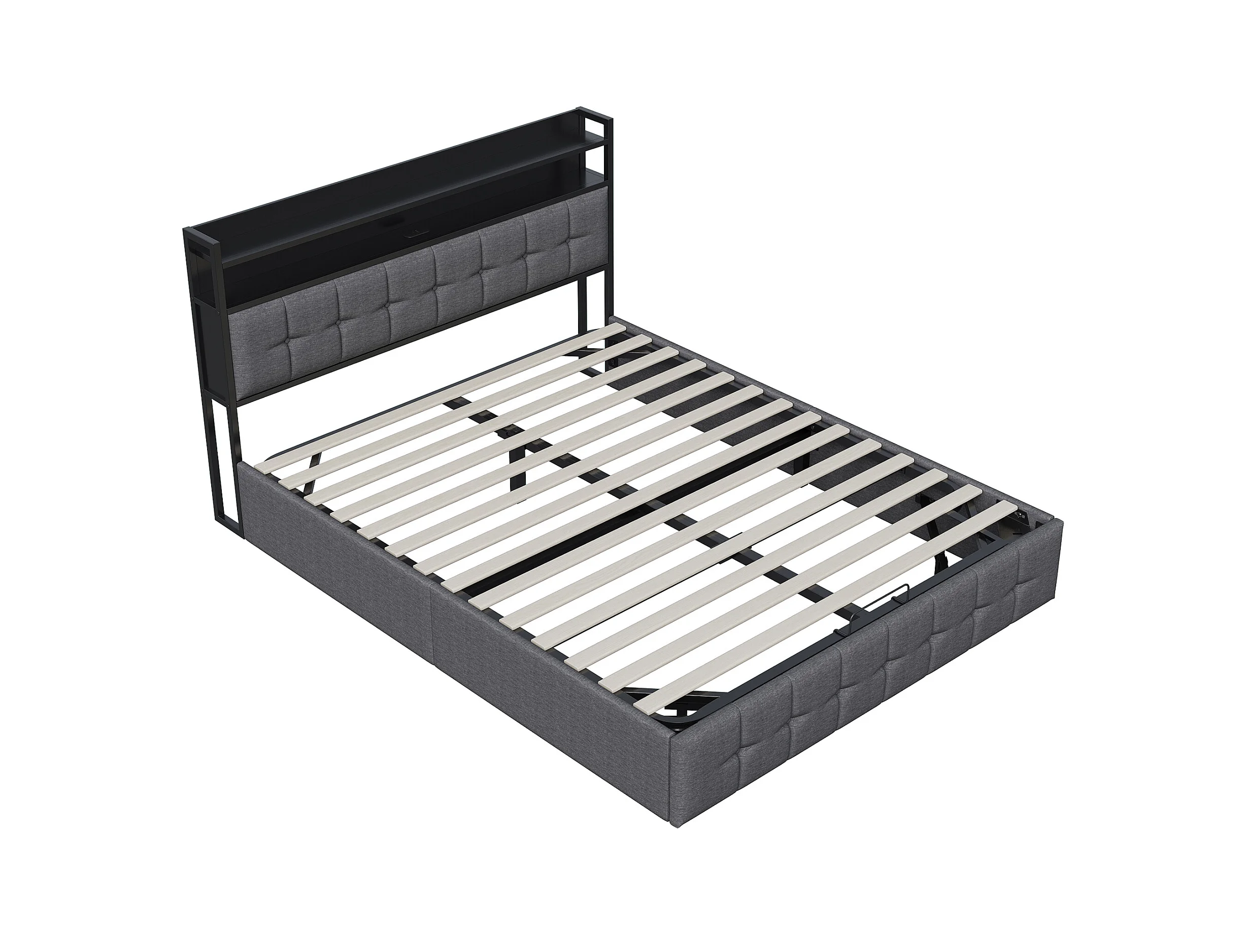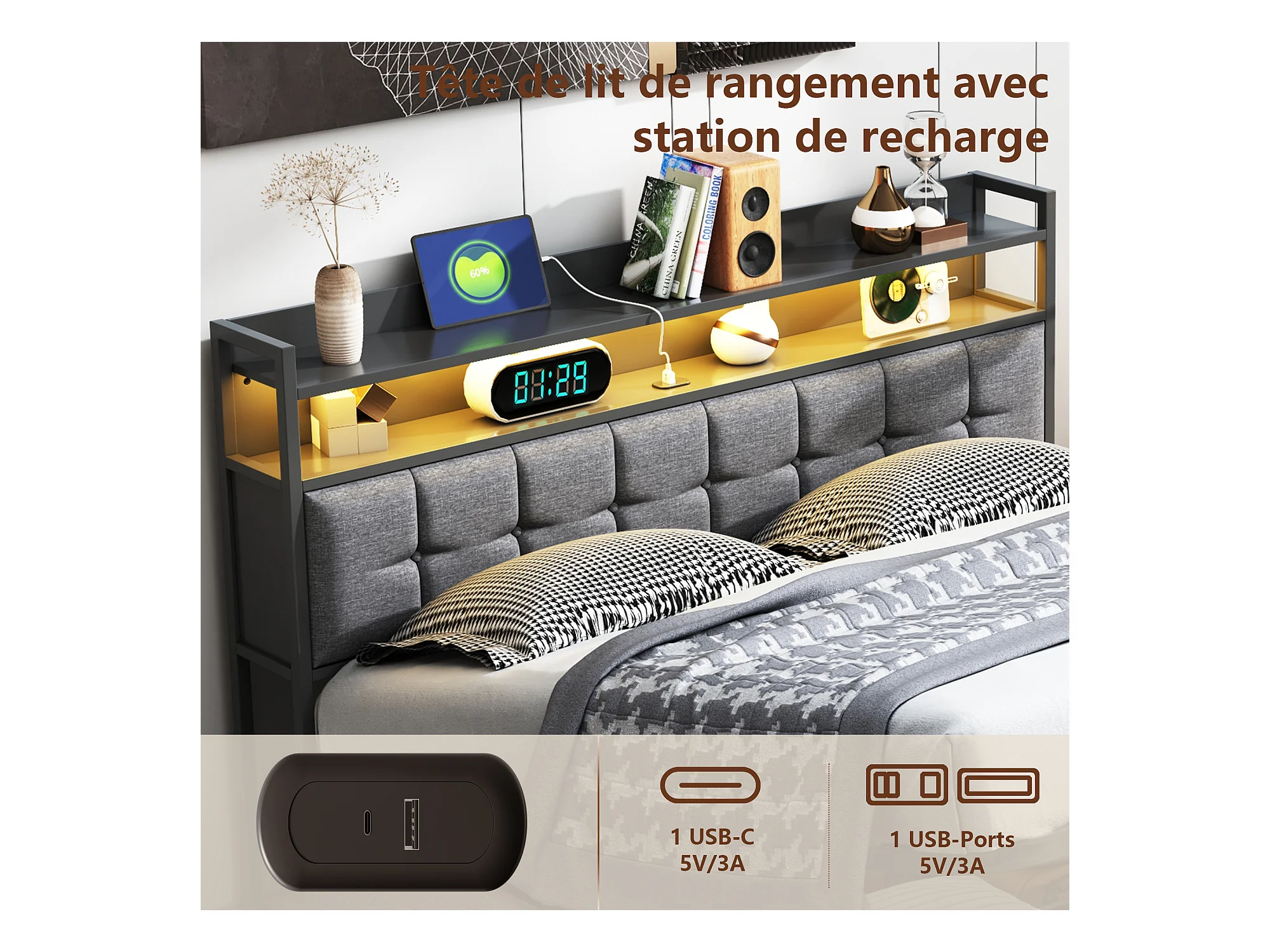 Lit coffre rembourré - 160 x 200cm - avec USB-C + Leds - tête de lit avec rangements - lin + MDF - gris