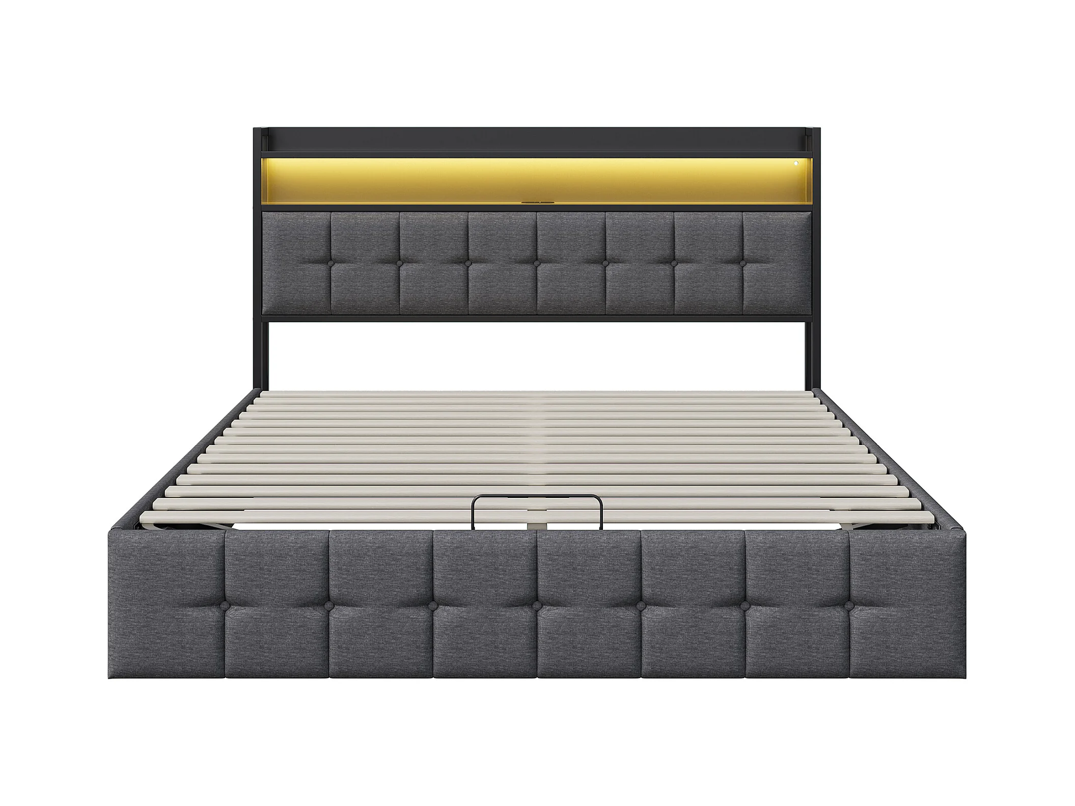 Lit double rembourré - 160 x 200 cm - rangement hydraulique - avec Leds + USB - velours - gris(avec matelas)