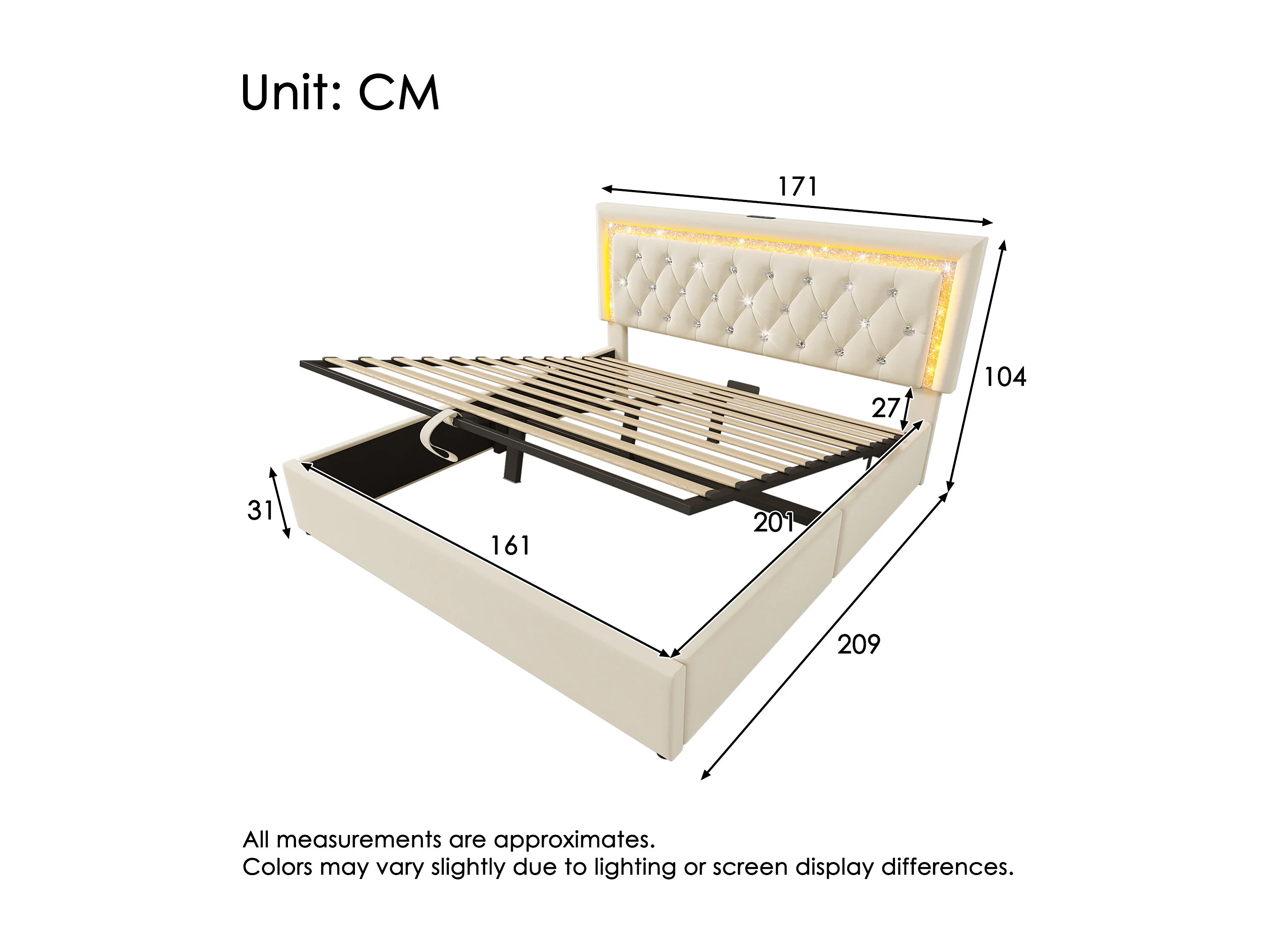 Lit coffre avec tête de lit 160 x 200 cm - Porte USB + LEDs - Tissu lin - sommier à lattes inclus - Beige
