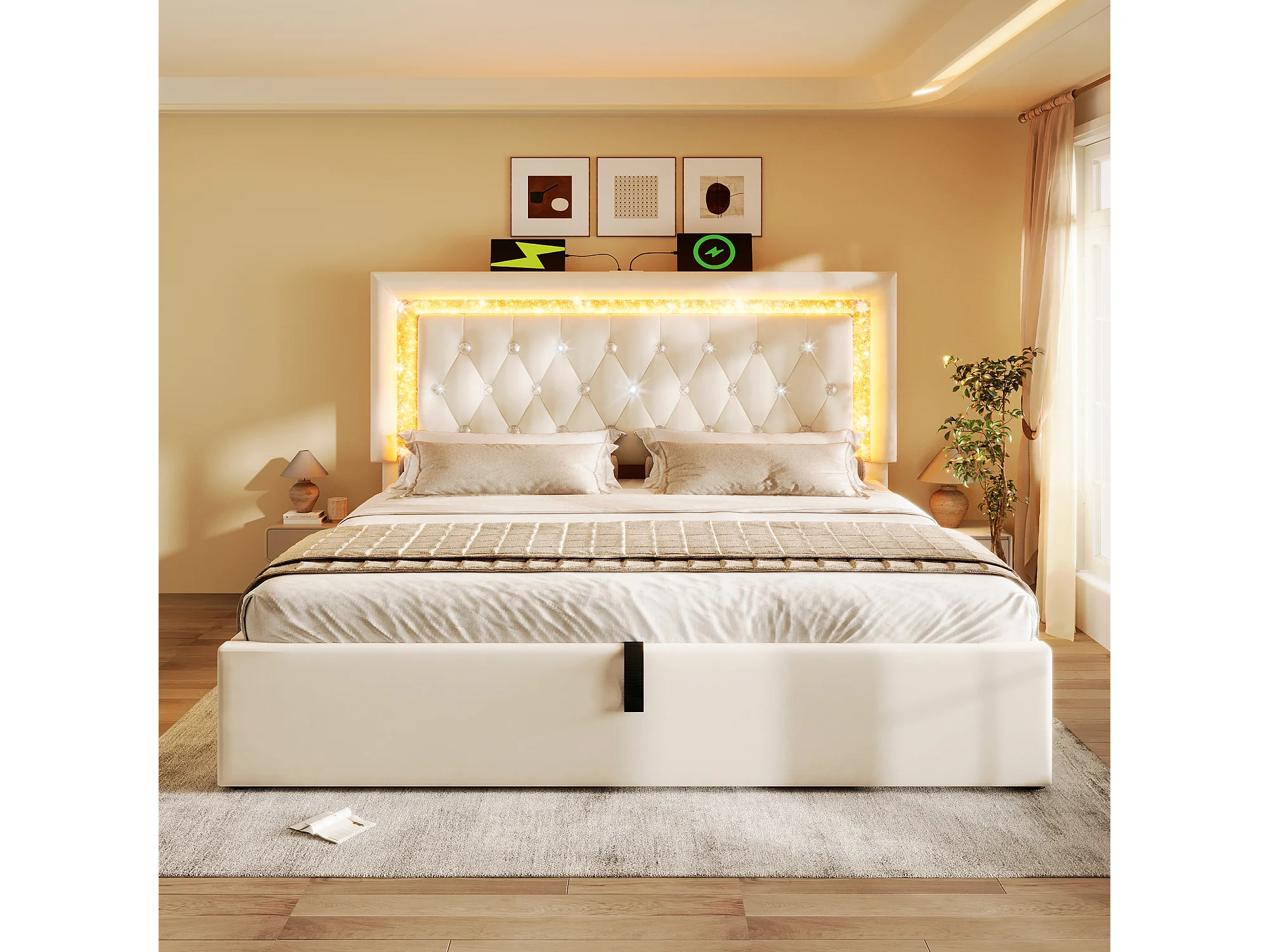 Lit coffre capitonné 180x200 cm - avec lumière LED - avec port USB - velours - beige (matelas non inclus)