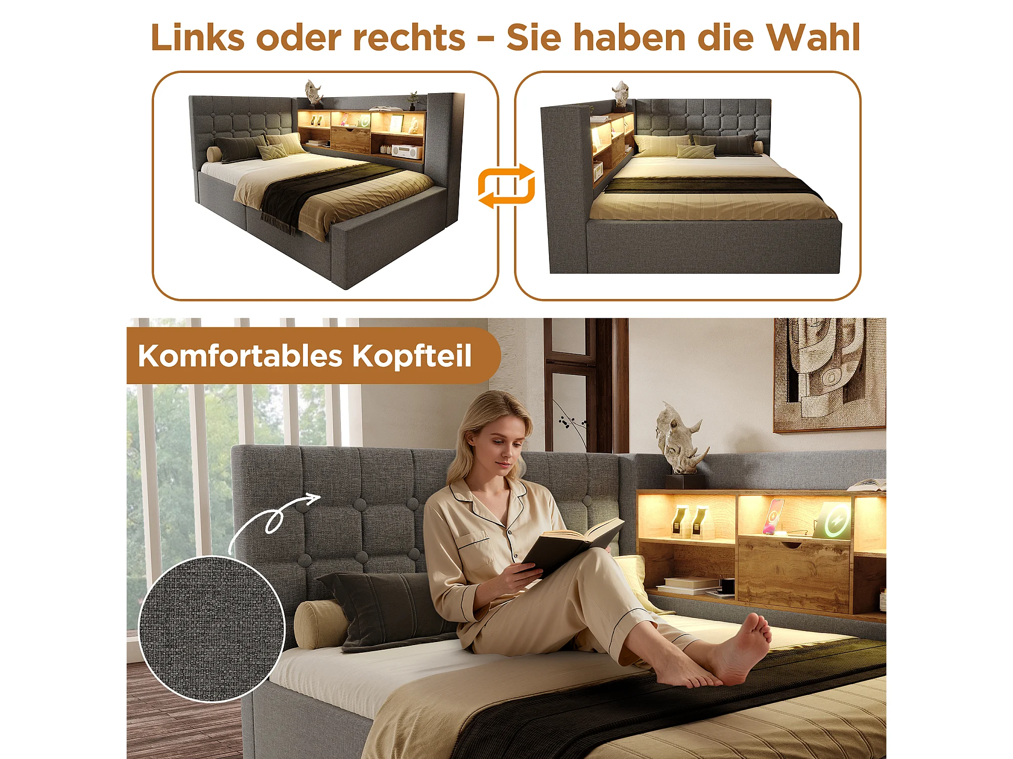 Lit coffre rembourré - 90 x 190 cm - avec Leds + rangement hydraulique + tête de lit L avec rangement - lin - gris