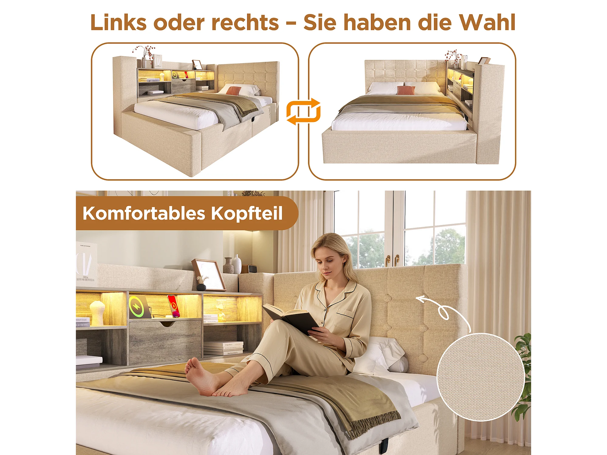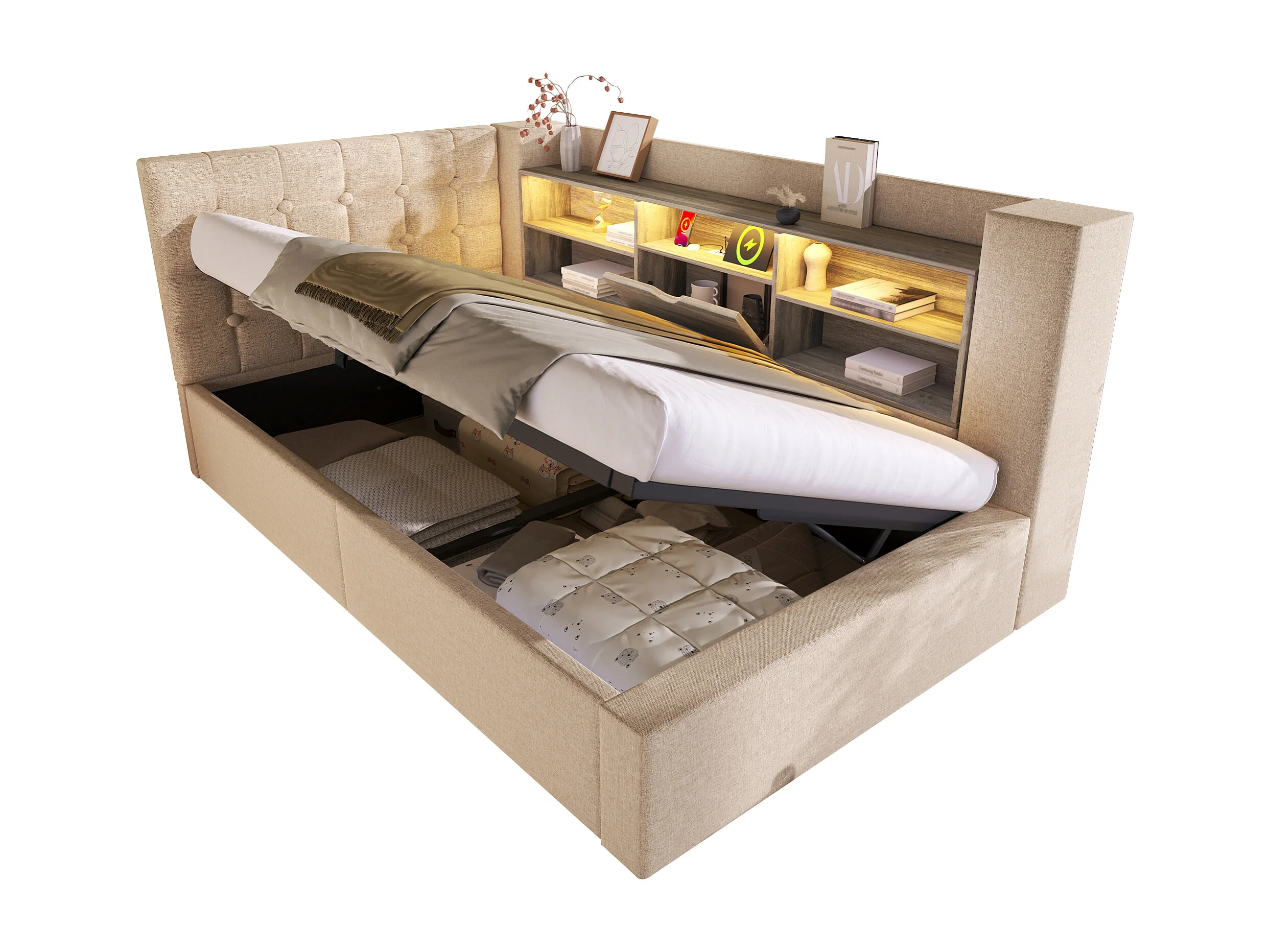 Lit coffre rembourré - 90 x 200 cm - avec USB + Leds + tête de lit + étagère de rangement - lin - beige