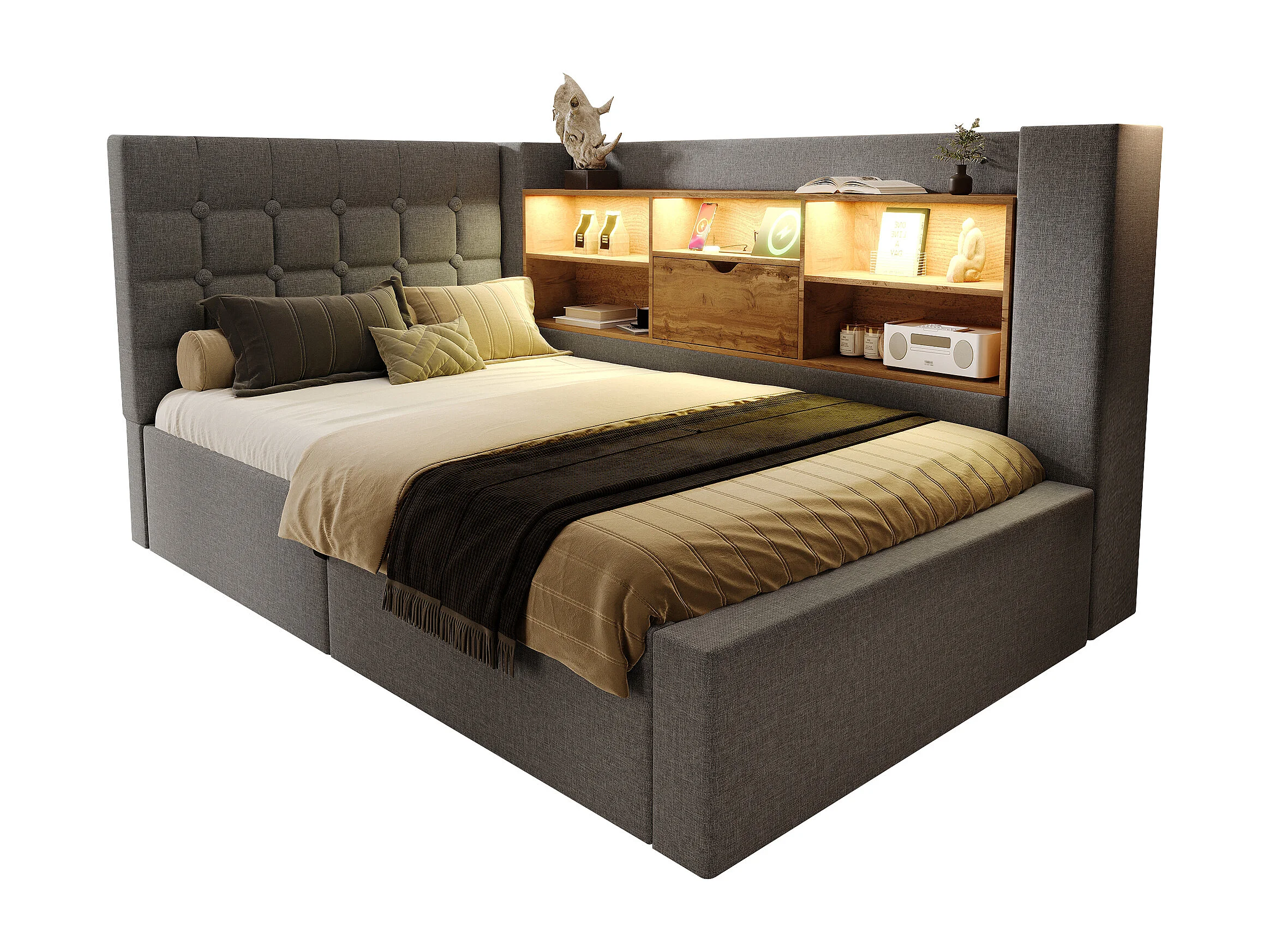 Lit coffre rembourré - 90 x 200 cm - avec USB + Leds + tête de lit + étagère de rangement - lin - gris