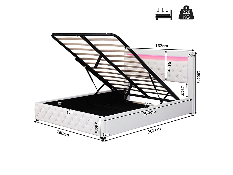 Lit coffre rembourré en similicuir avec LED - 160x200cm - avecsommier à lattes - Blanc