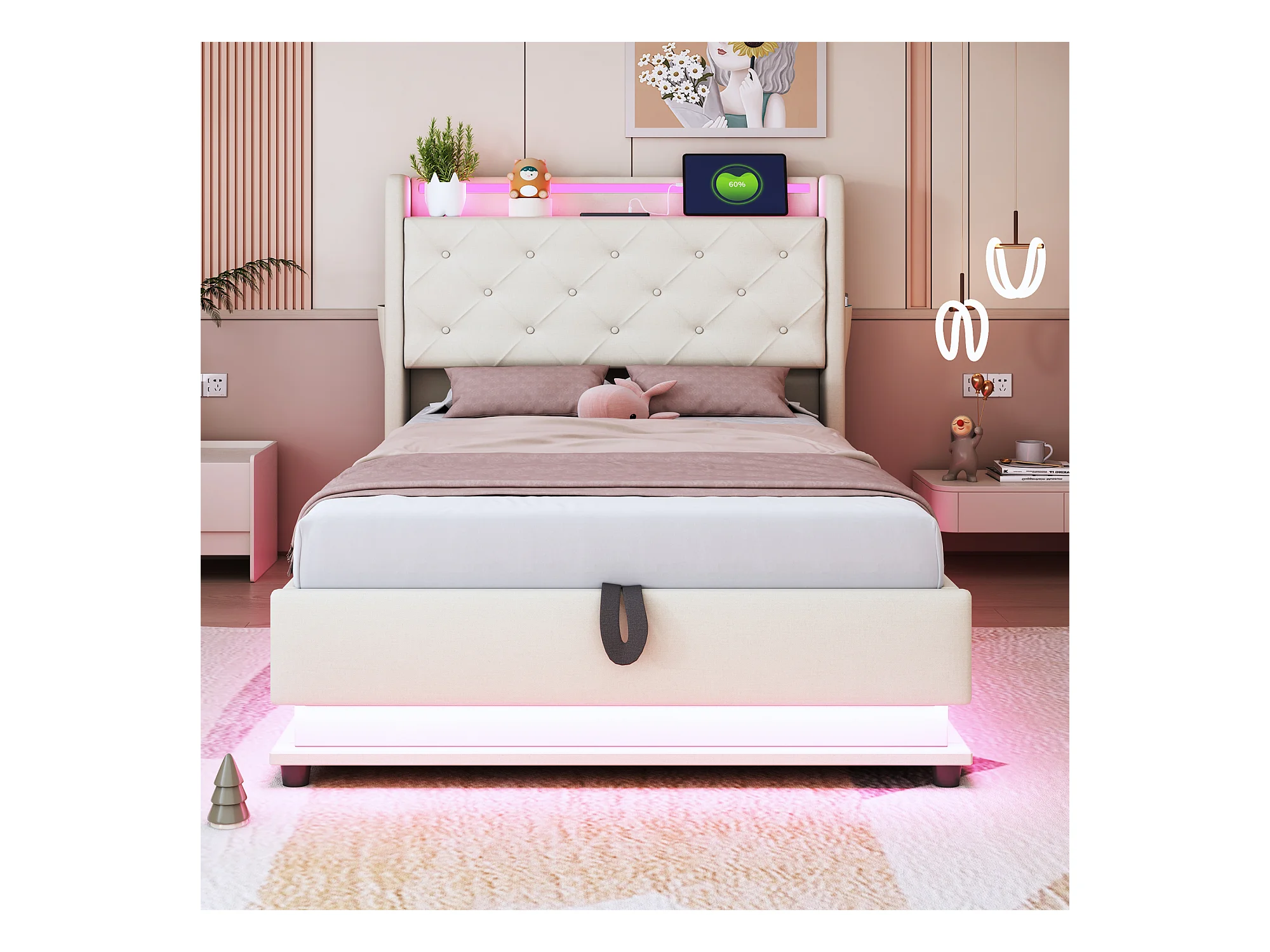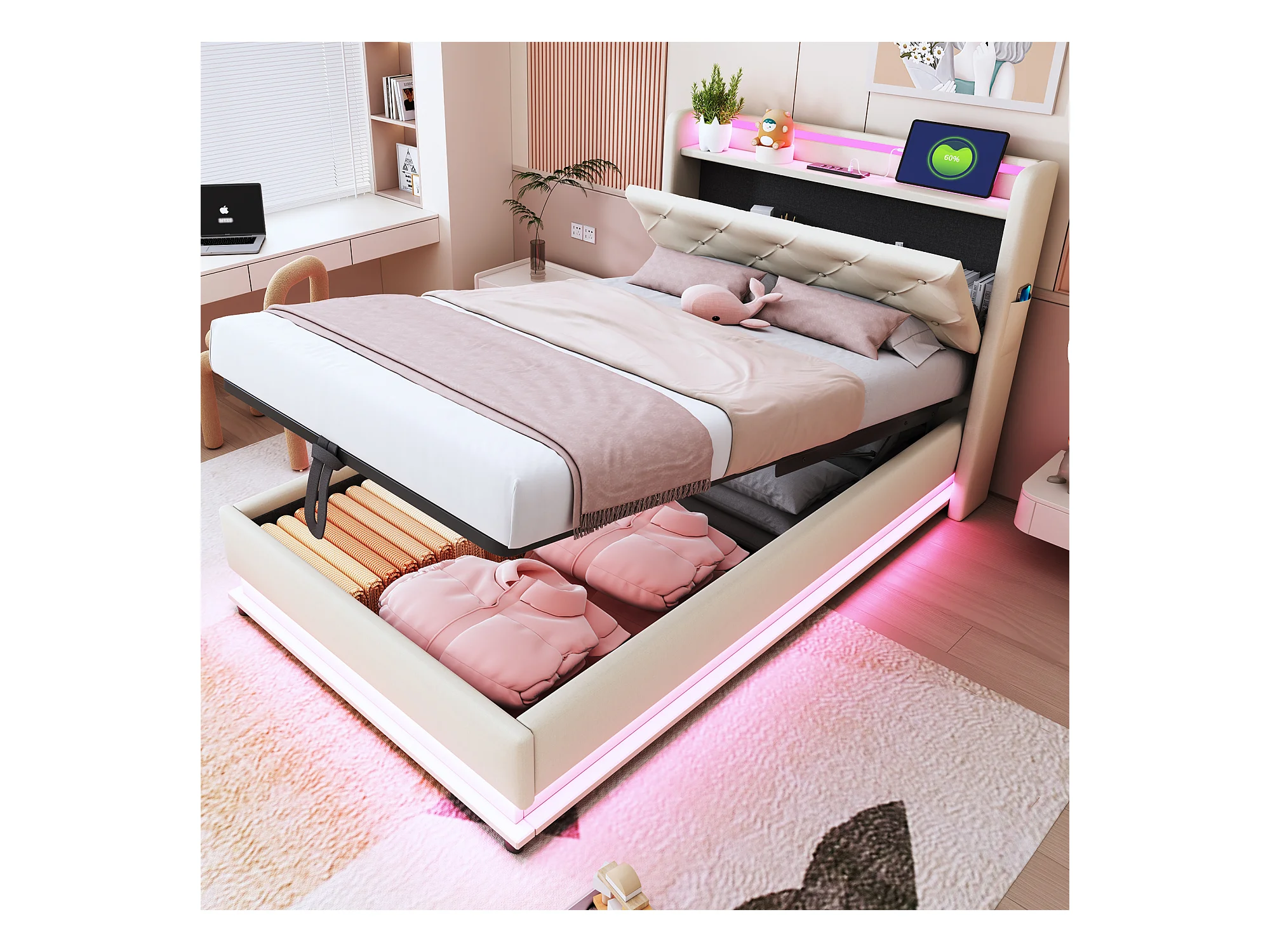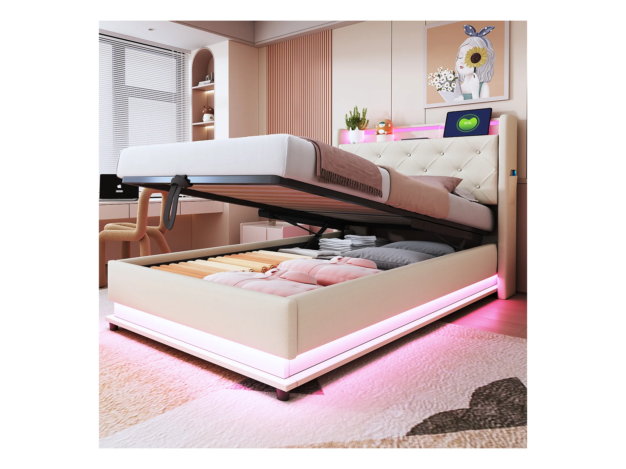 Lit coffre rembourré pour enfant - 90 x 200 cm - avec Leds + USB + tête de lit pliablee - rangement hydraulique - tissu en lin - beige