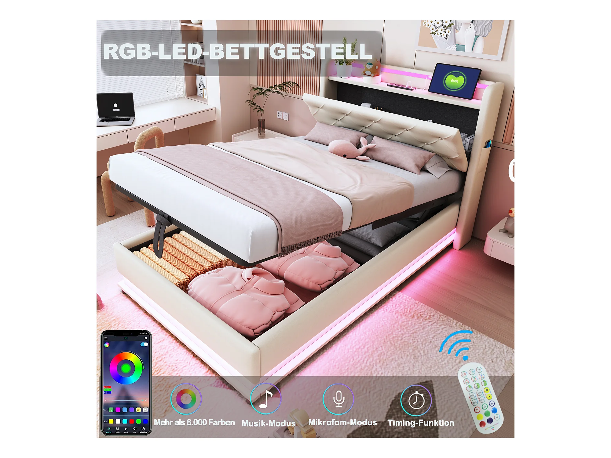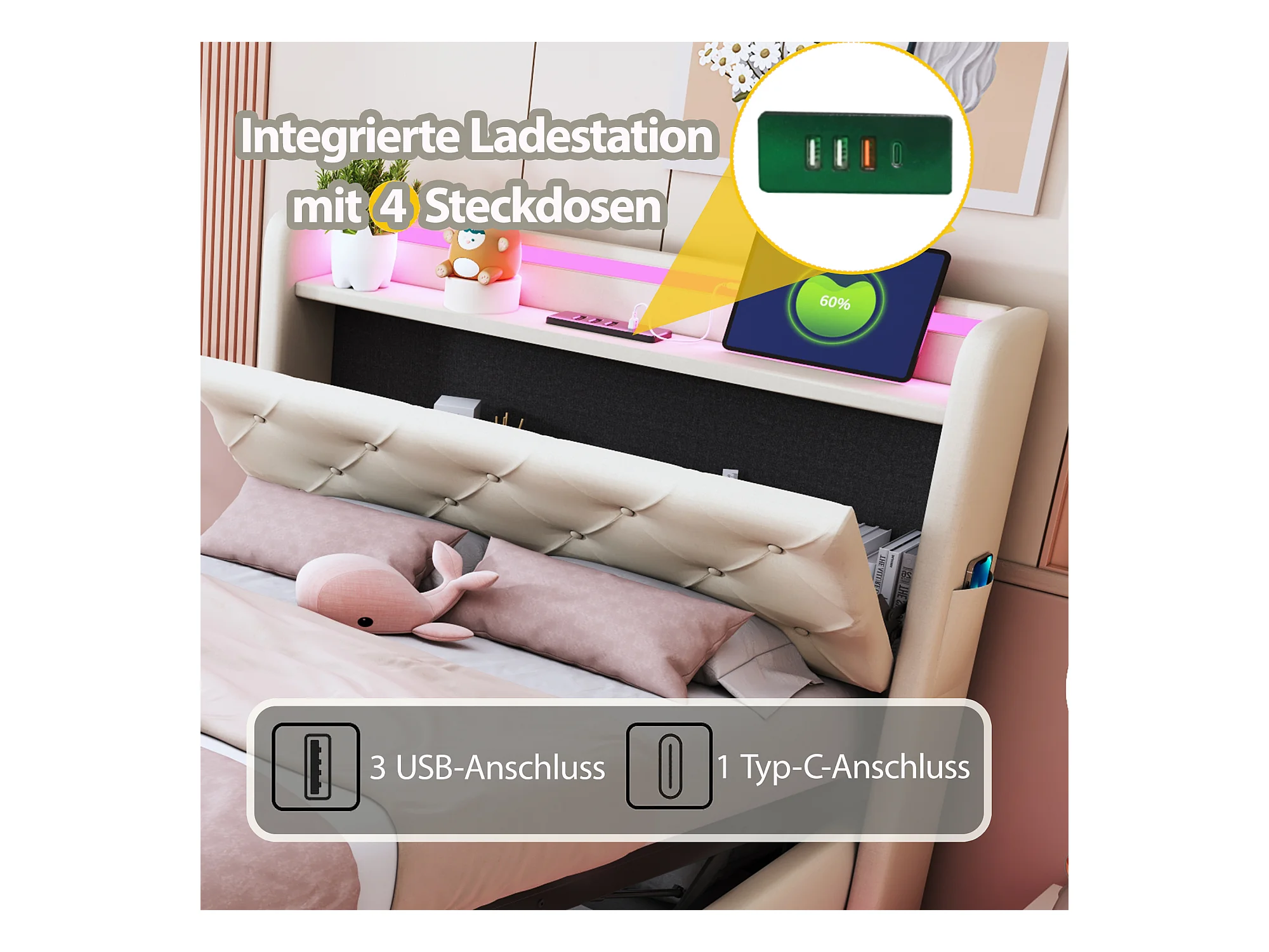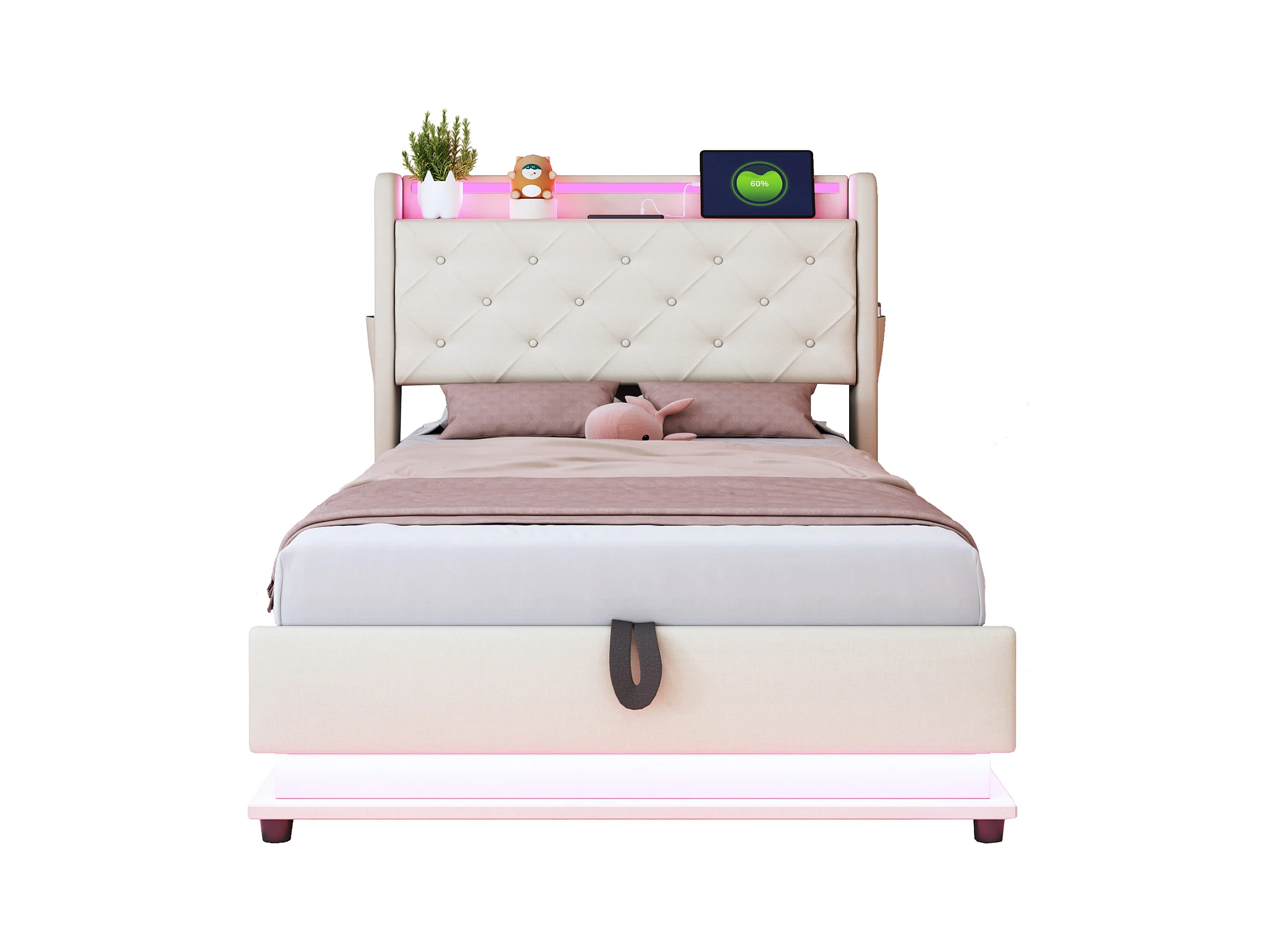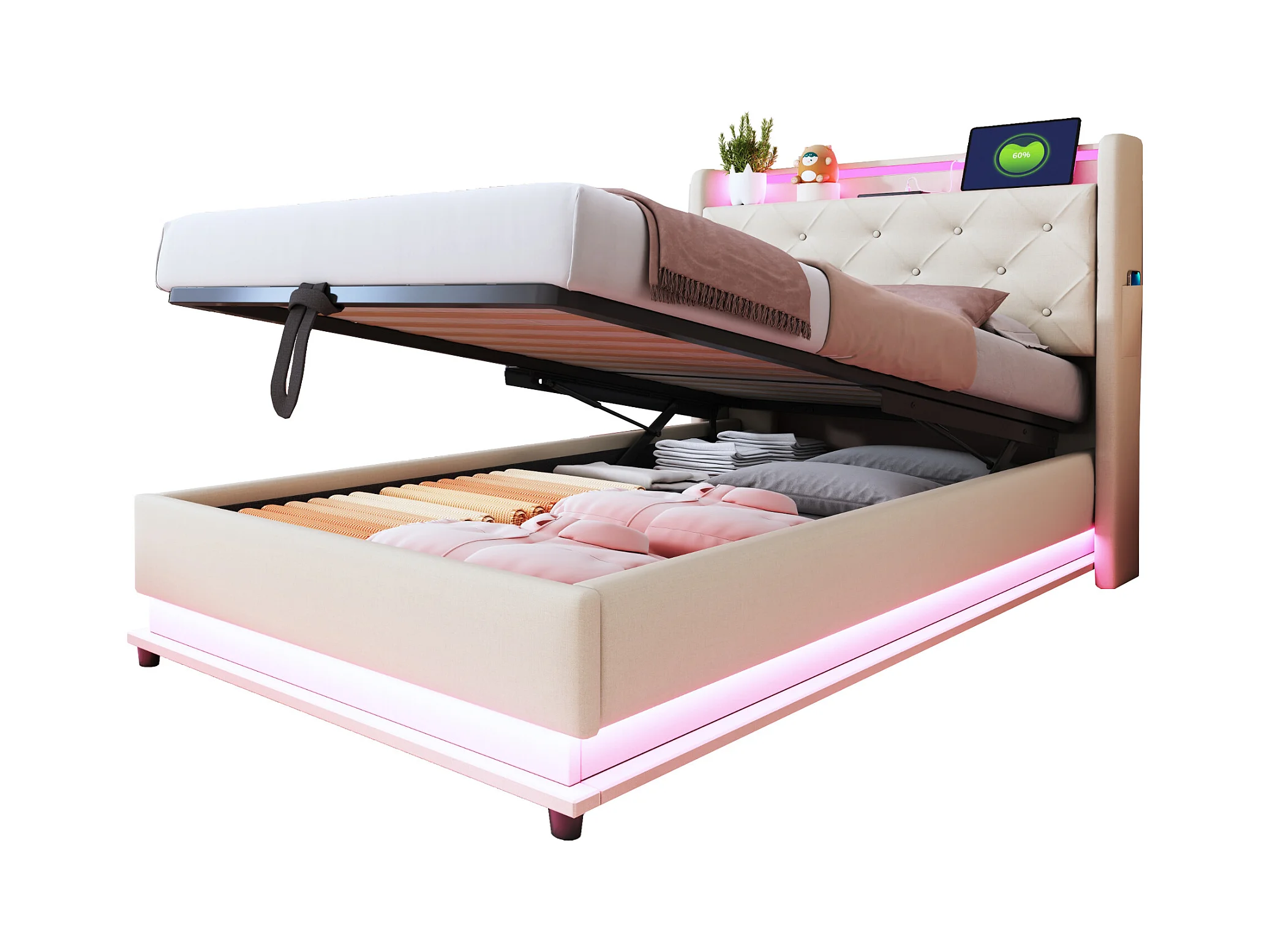 Lit coffre rembourré pour enfant - 90 x 200 cm - avec Leds + USB + tête de lit pliablee - rangement hydraulique - tissu en lin - beige
