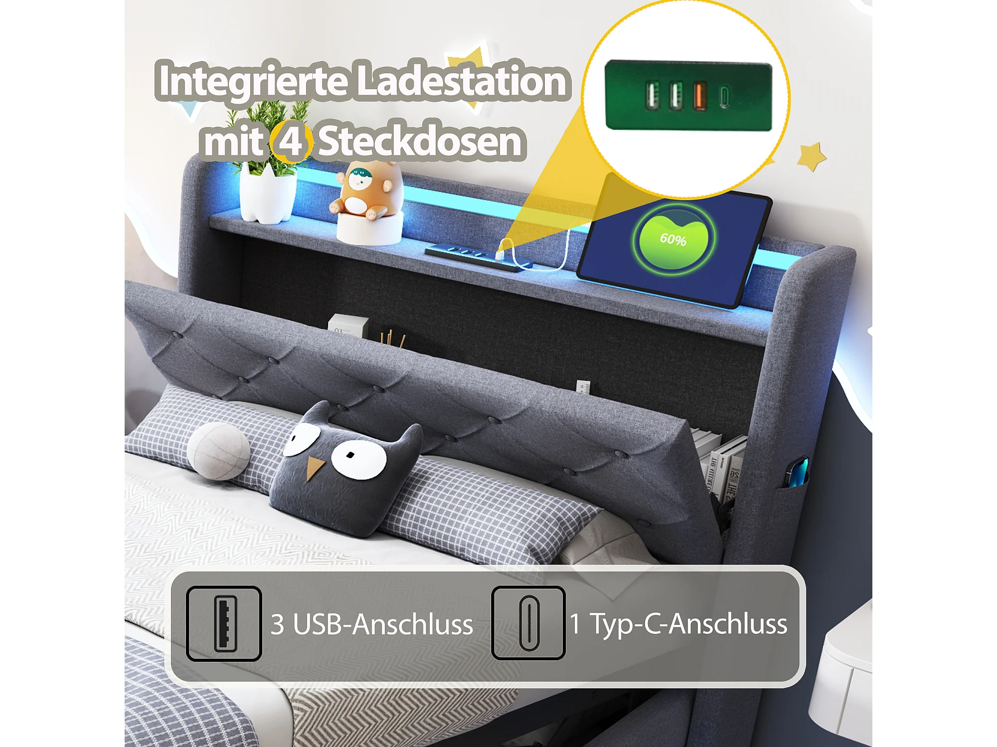 Lit coffre rembourré pour enfant - 90 x 200 cm - avec Leds + USB + tête de lit pliablee - rangement hydraulique - tissu en lin - gris