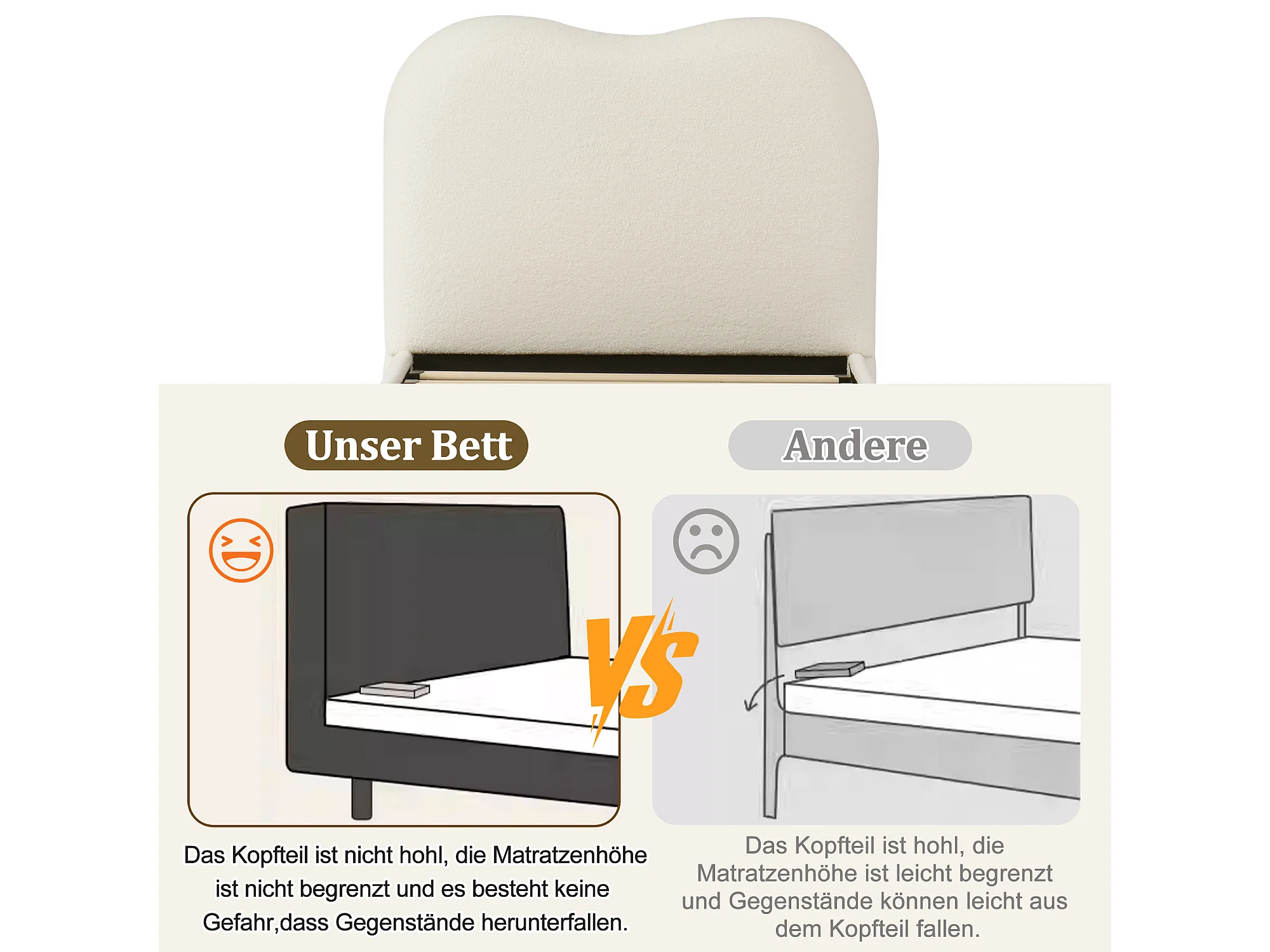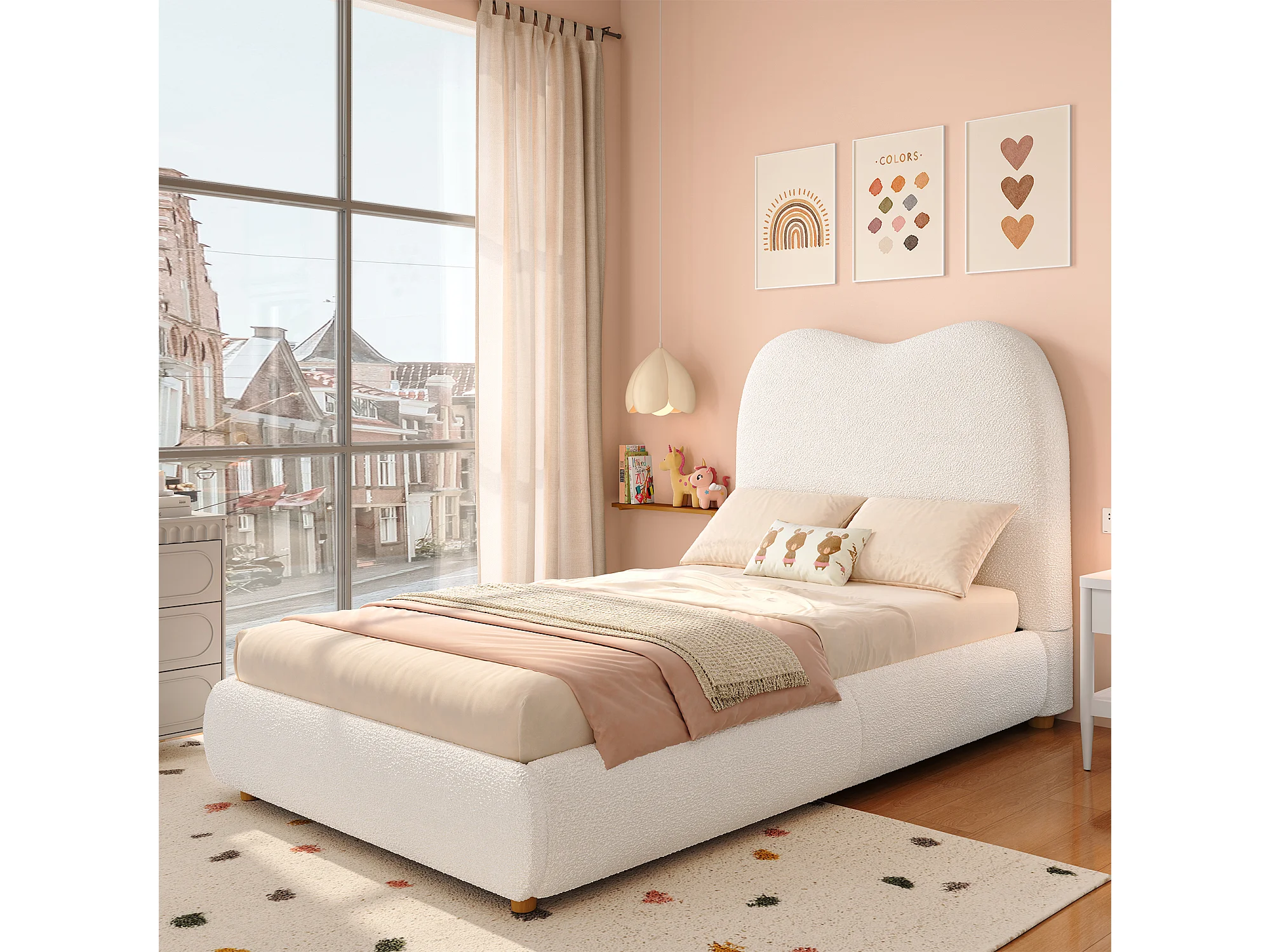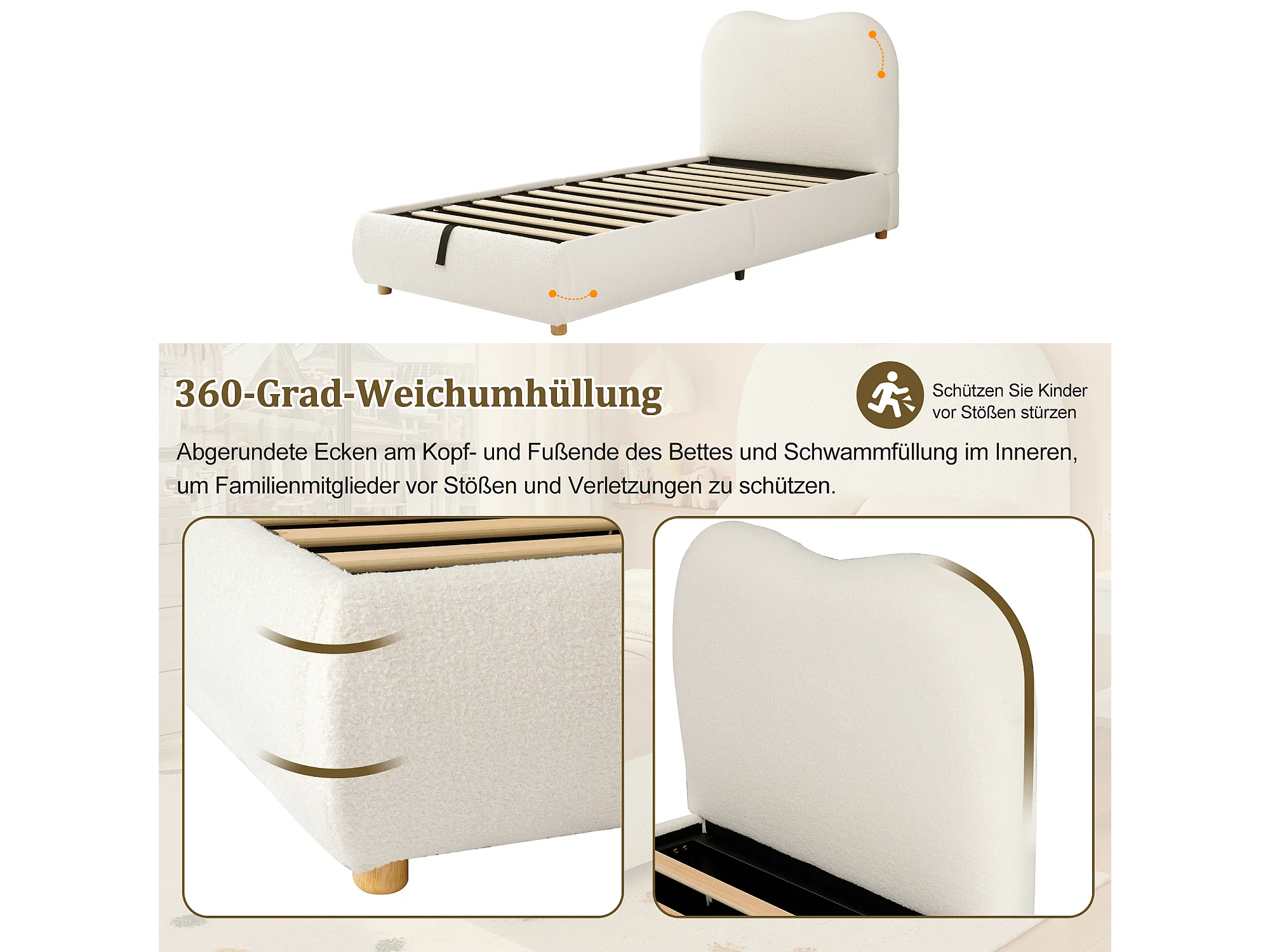 Lit coffre rembourré pour enfant - 90 x 200 cm - avec rangement hydraulique + tête de lit - bouclé - beige