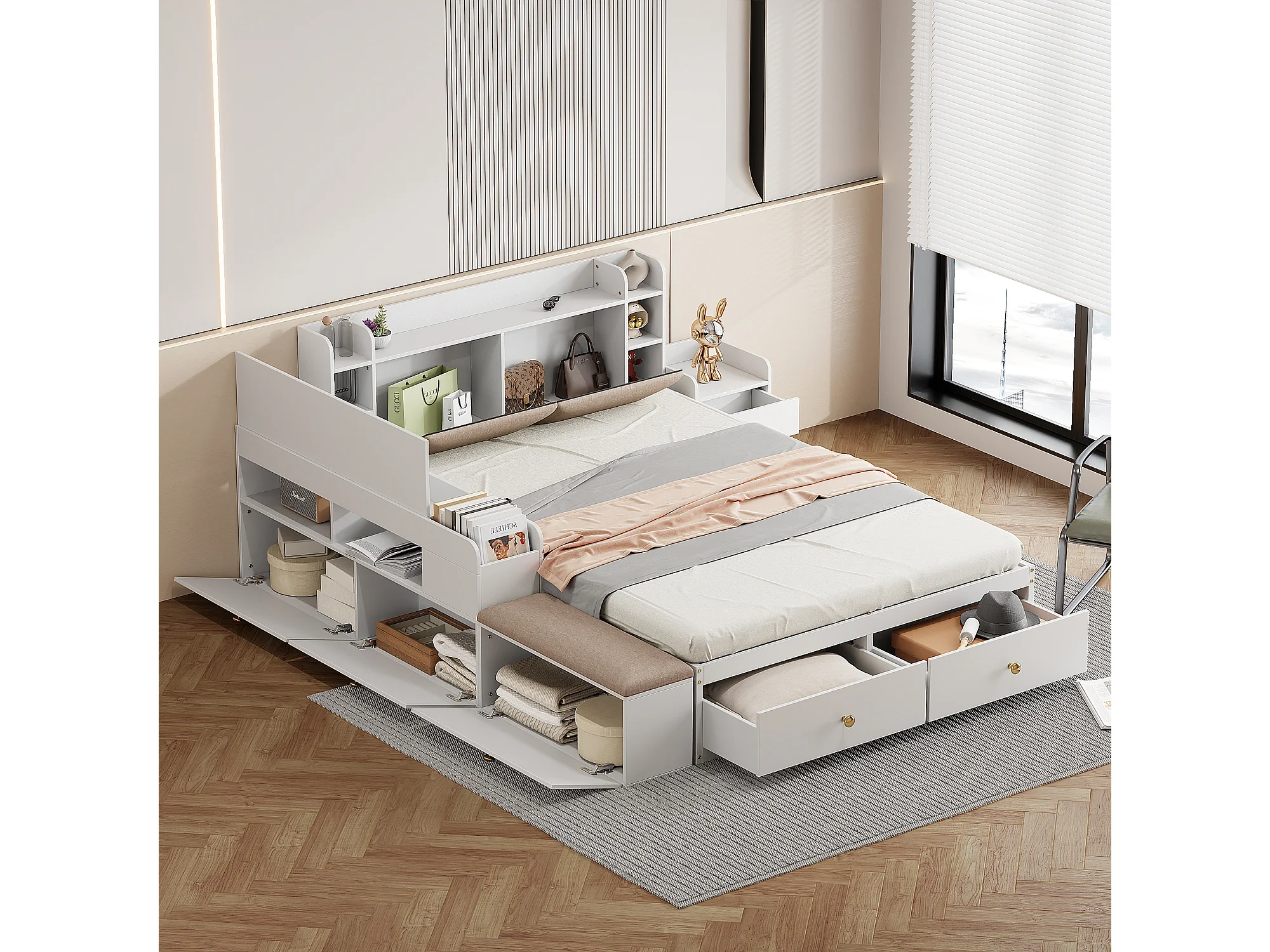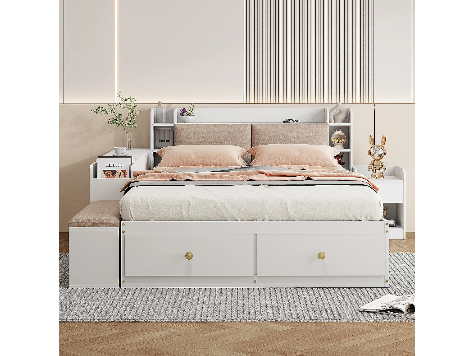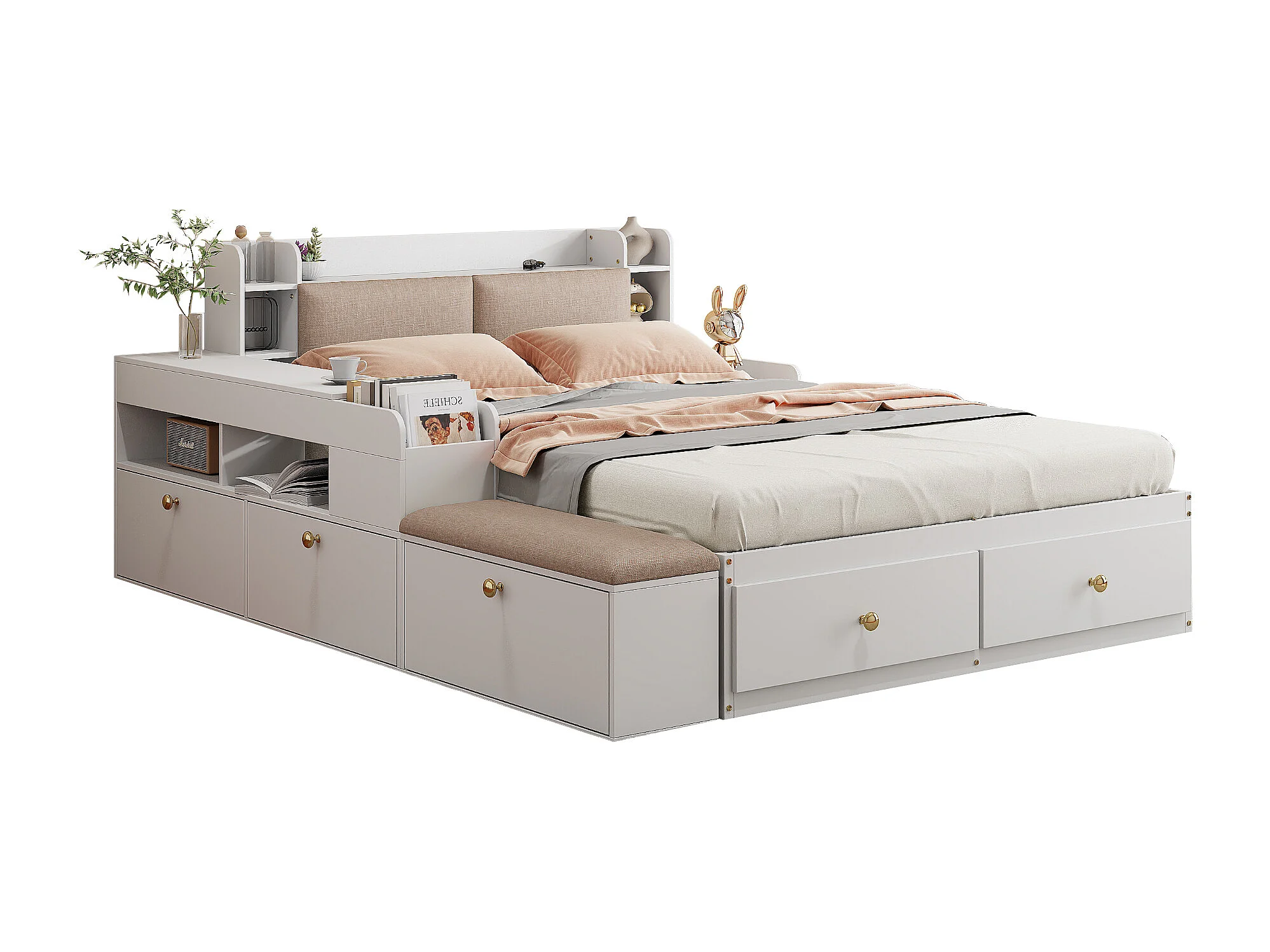 Lit combiné en bois massif 140x200 cm avec tête de lit rangement, tiroirs, table de nuit et banc, blanc