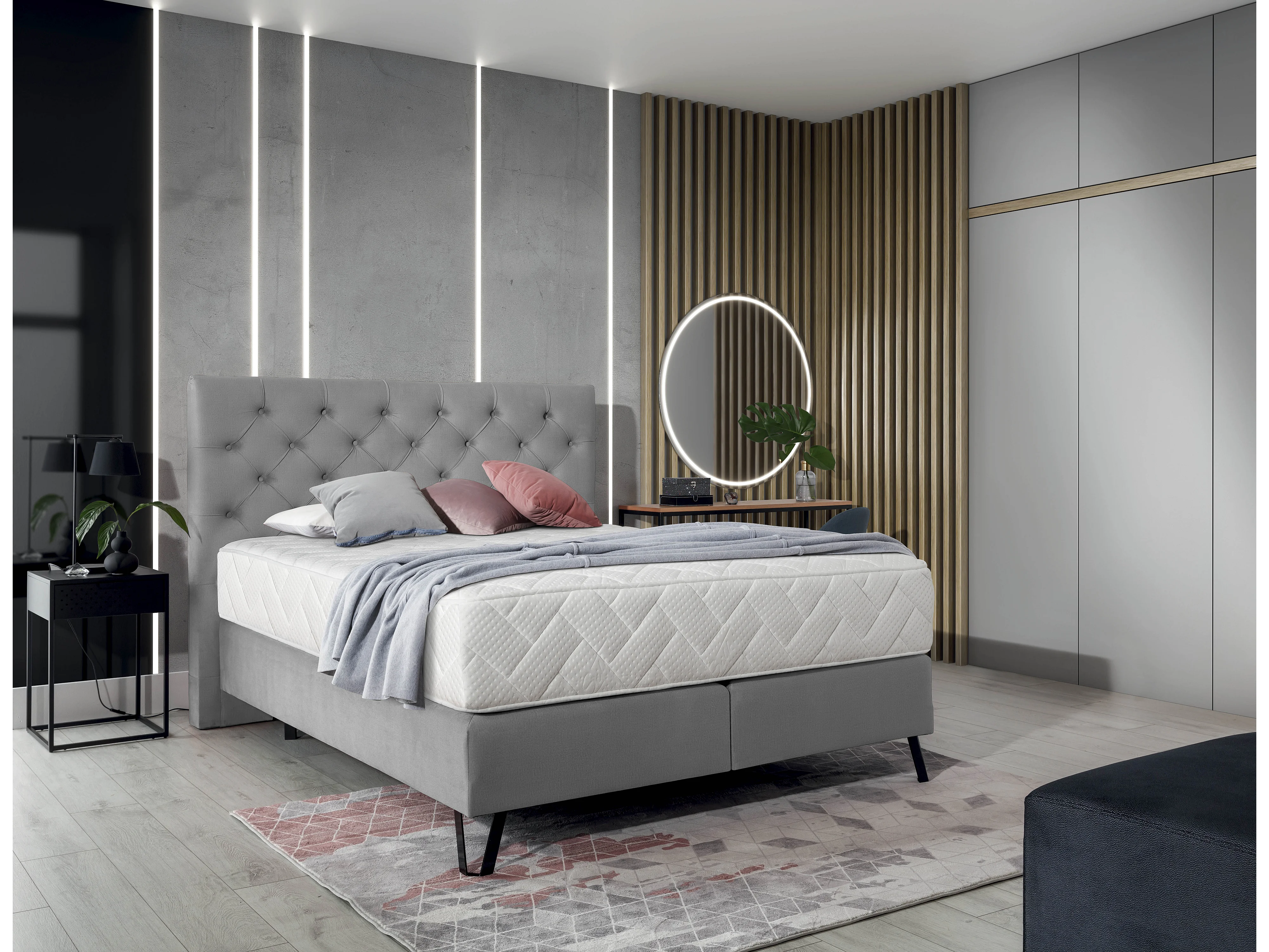 Lit continental capitonné tissu gris clair Pozza avec matelas 30cm en latex et pied métal noir-160x200
