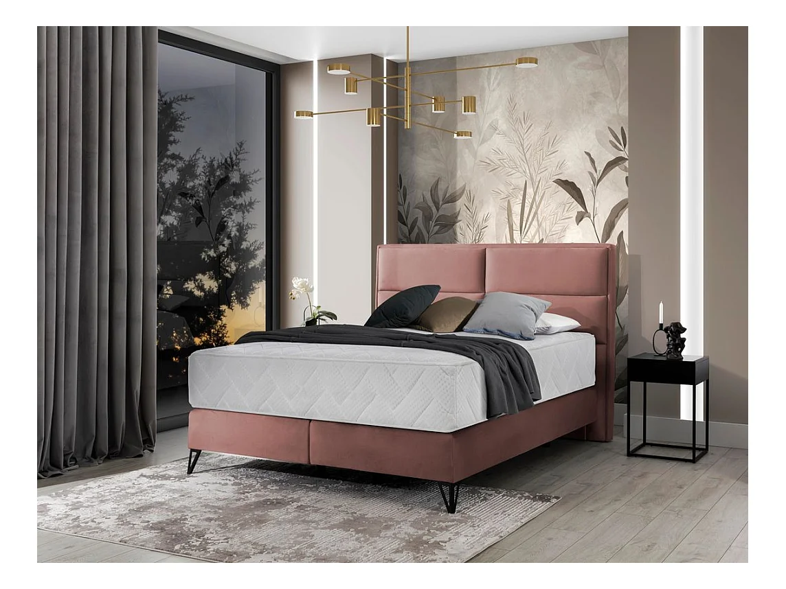 Lit continental velours rose balai Tiempo avec matelas 30cm en latex et pied métal noir-160x200