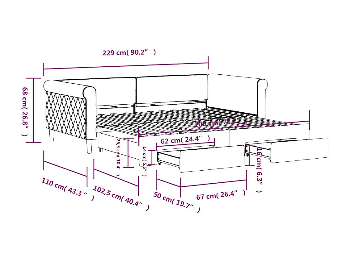 Lit de jour avec gigogne et tiroirs sans matelas 100x200 cm