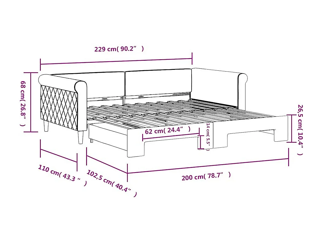 Lit de jour avec gigogne et tiroirs sans matelas 100x200 cm