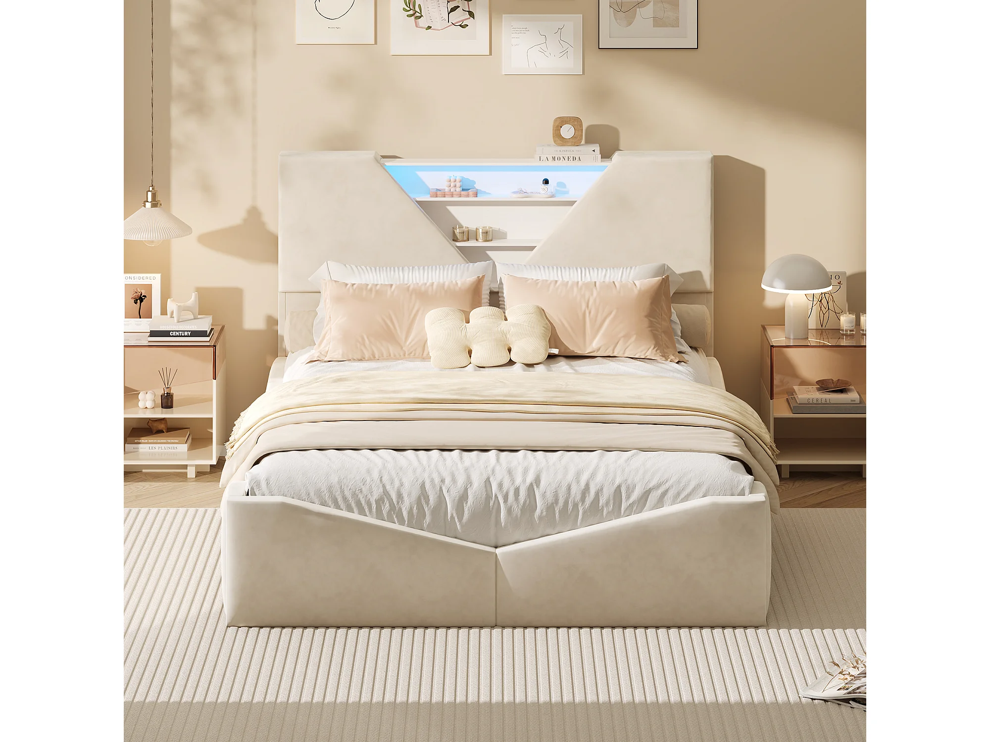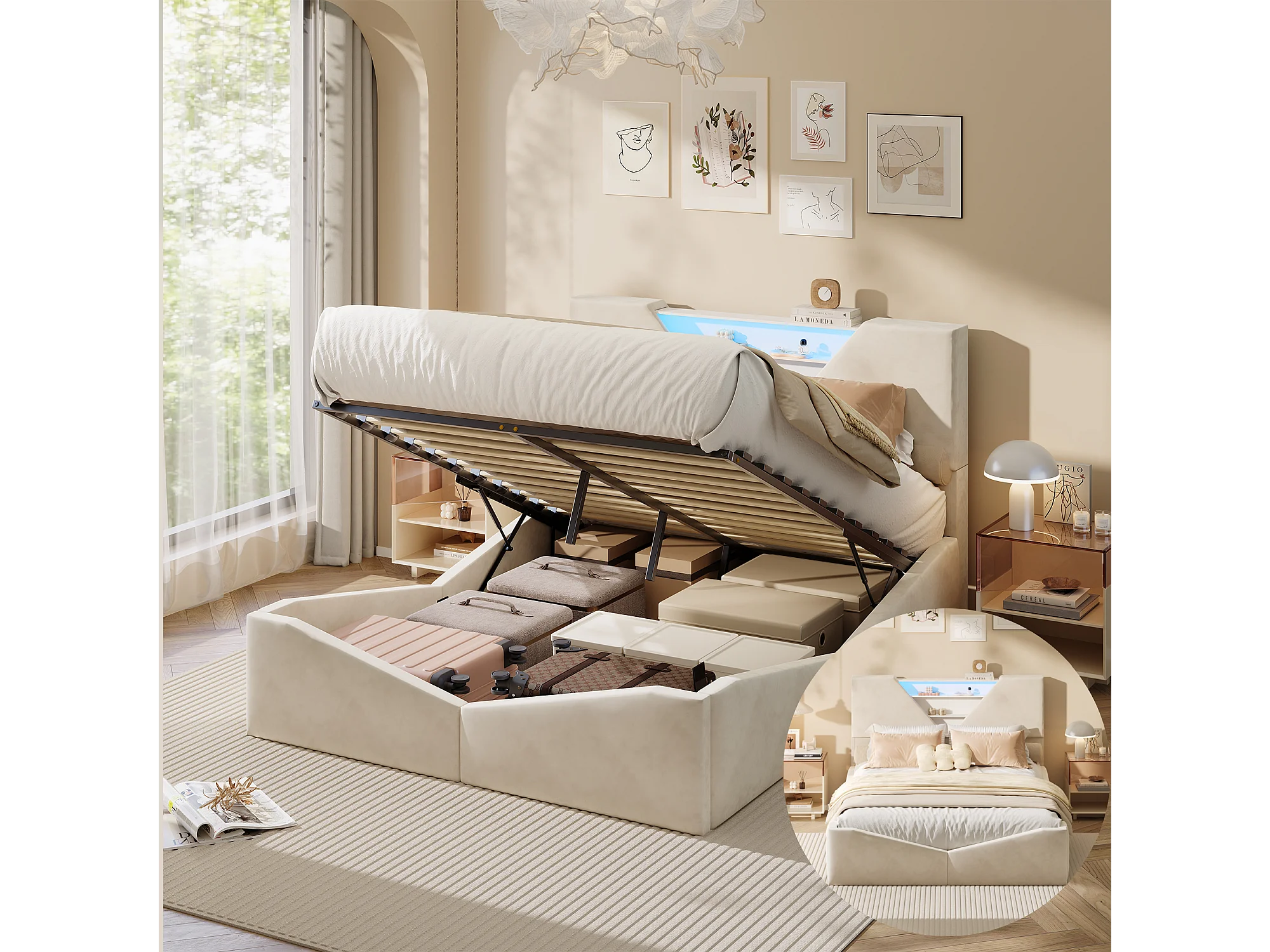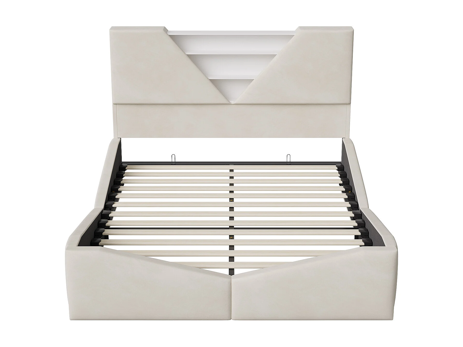 Lit double 140 x 200 cm avec rangement hydraulique - tête de lit triangulaire avec LED et fonction de chargement sans fil - beige