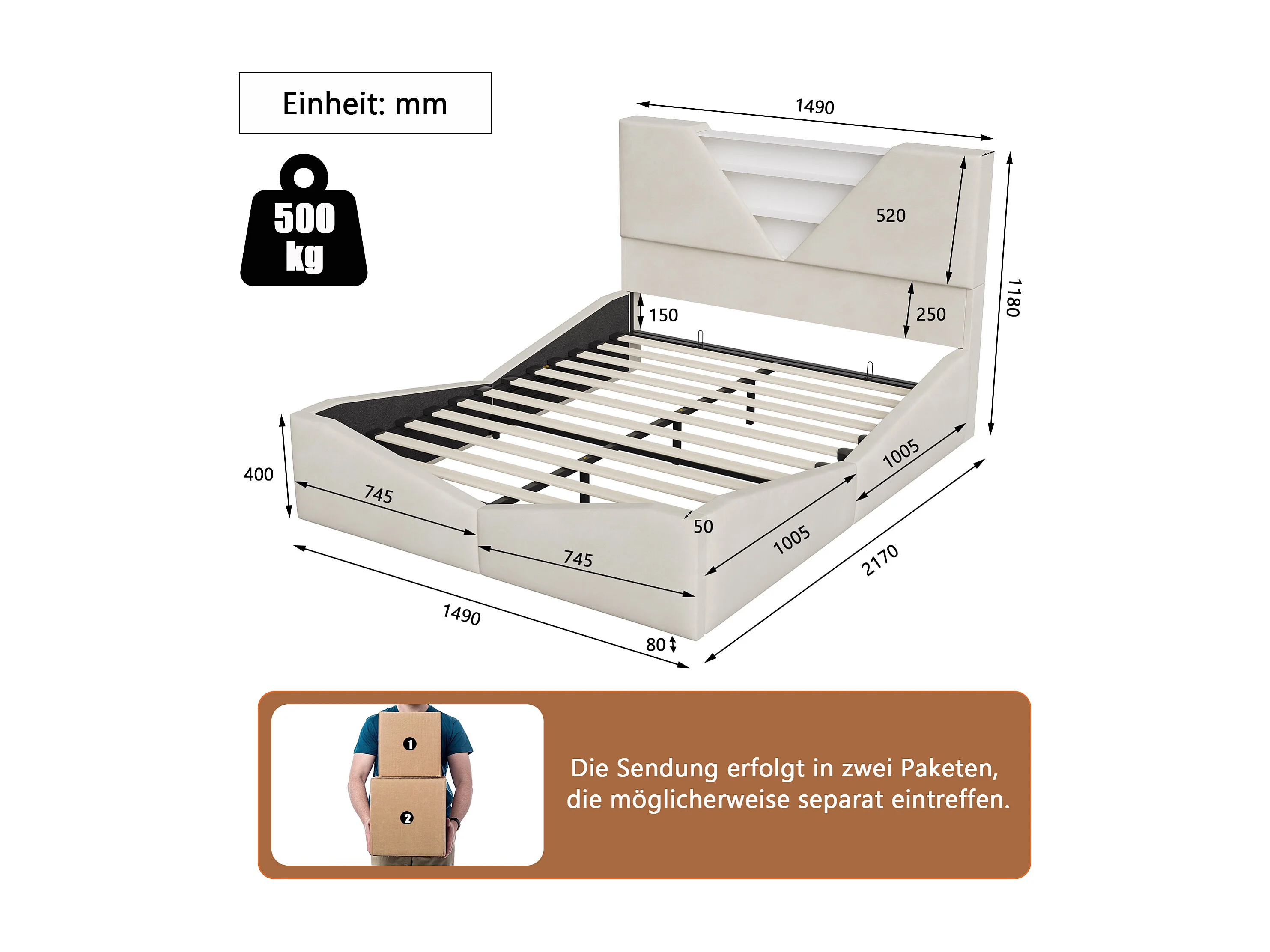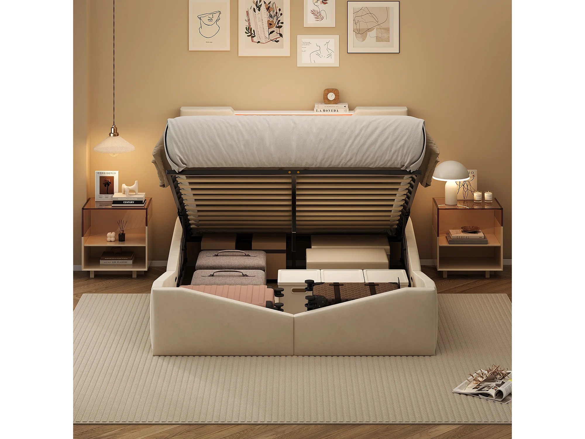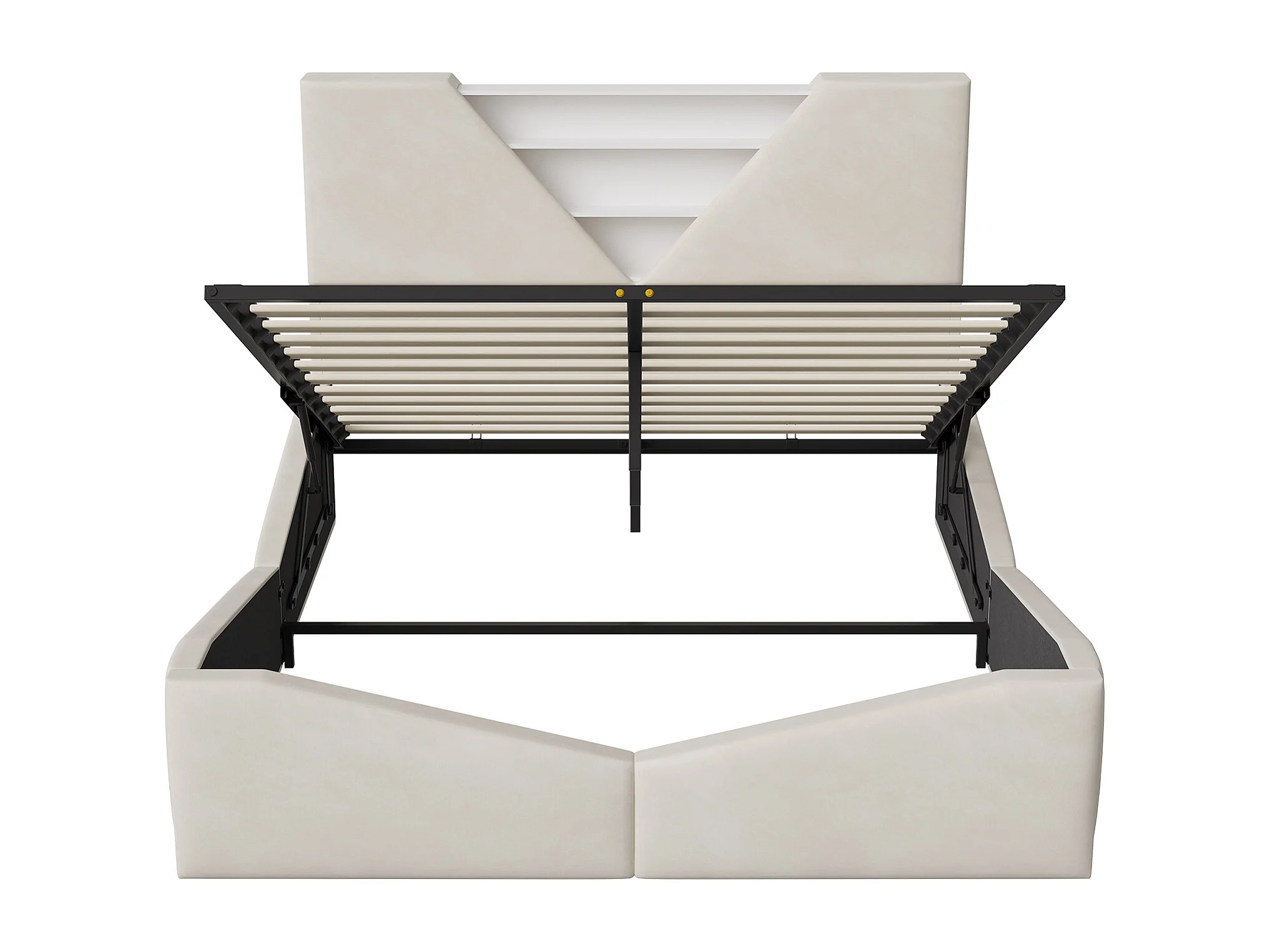 Lit double 140 x 200 cm avec rangement hydraulique - tête de lit triangulaire avec LED et fonction de chargement sans fil - beige