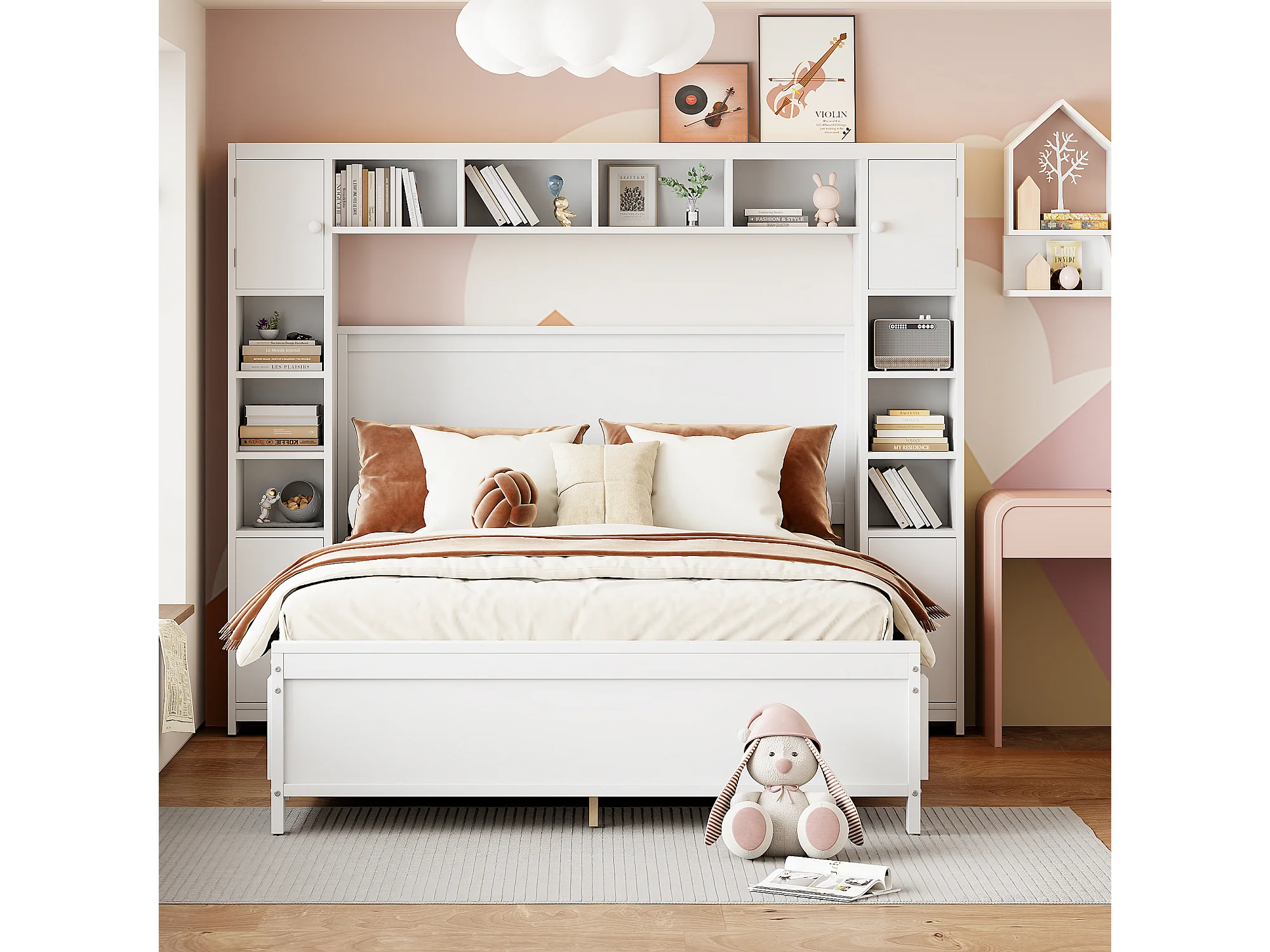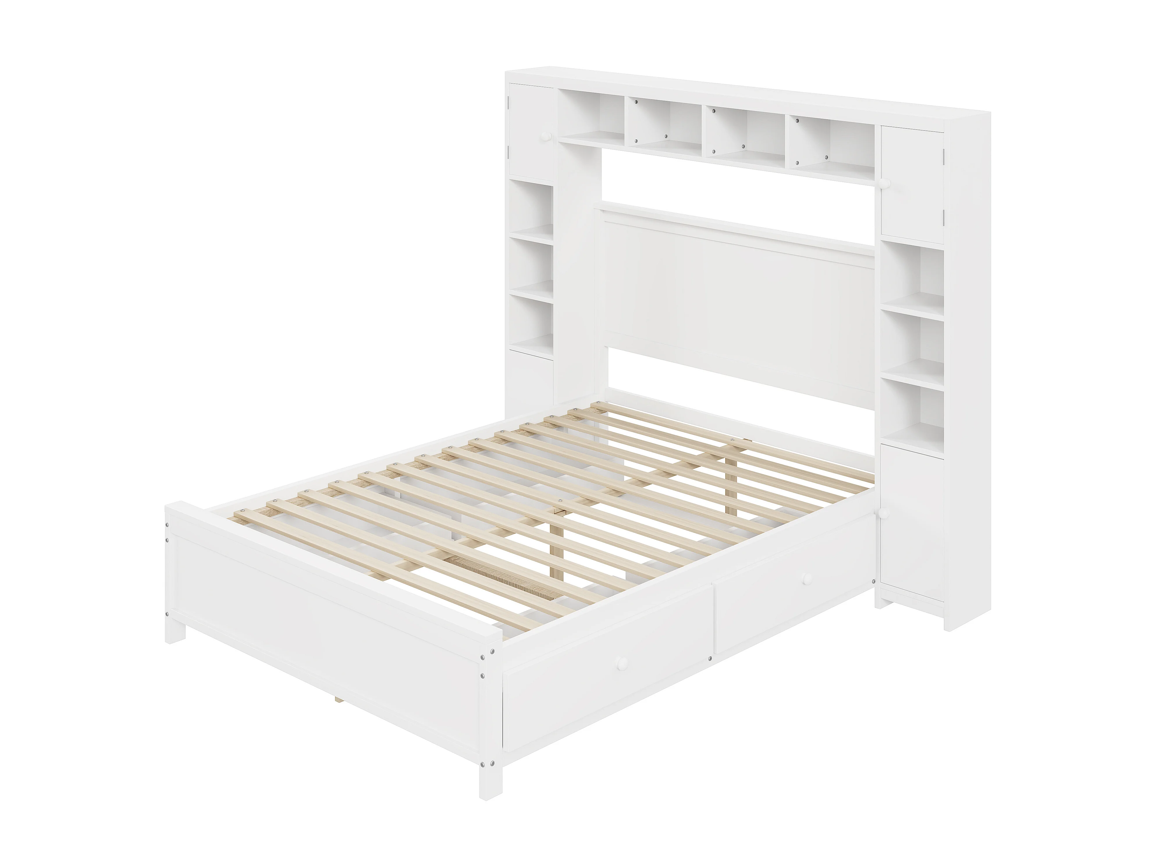Lit double 140x200 cm avec 4 tiroirs et grand espace de rangement, en bois massif avec sommier, blanc
