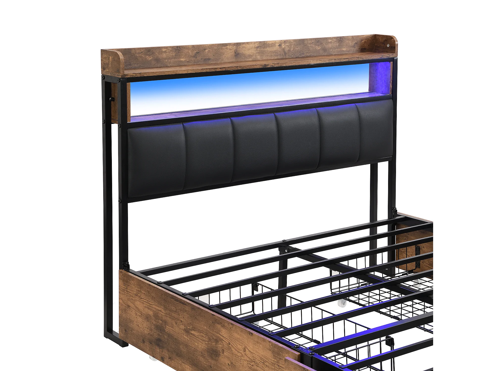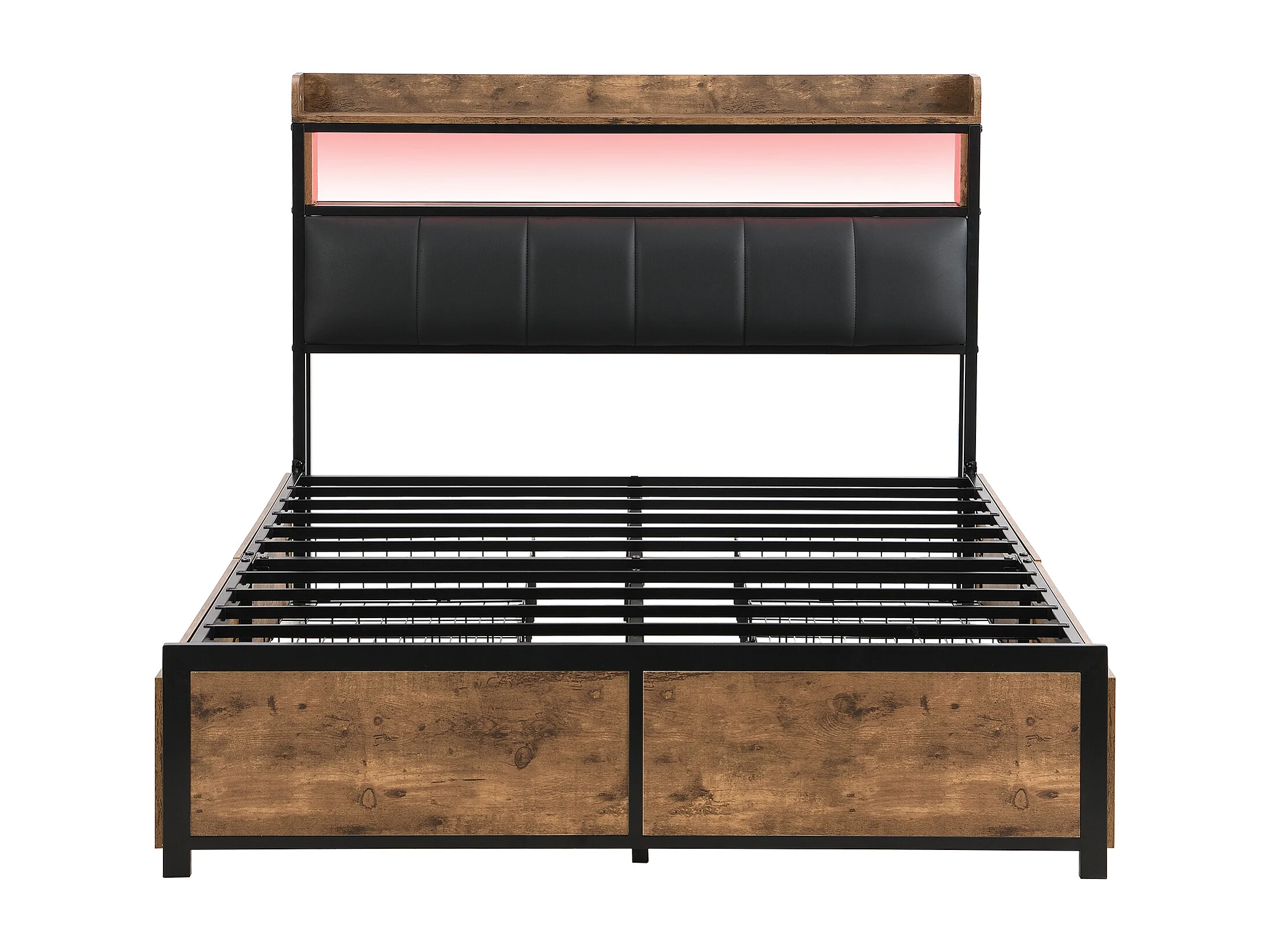 Lit double 140x200 cm avec éclairage LED, 4 tiroirs, tête de lit, PU noir + naturel, sans matelas