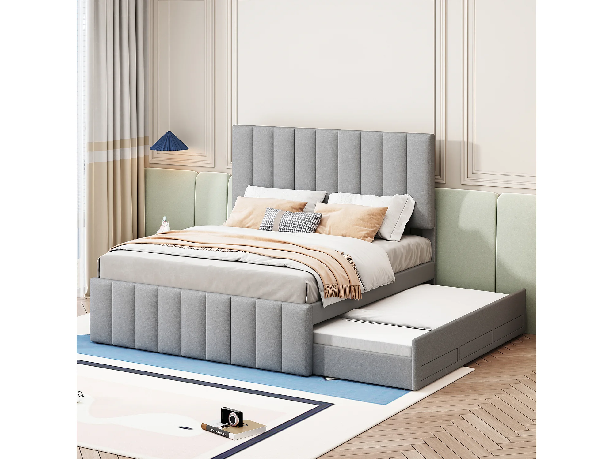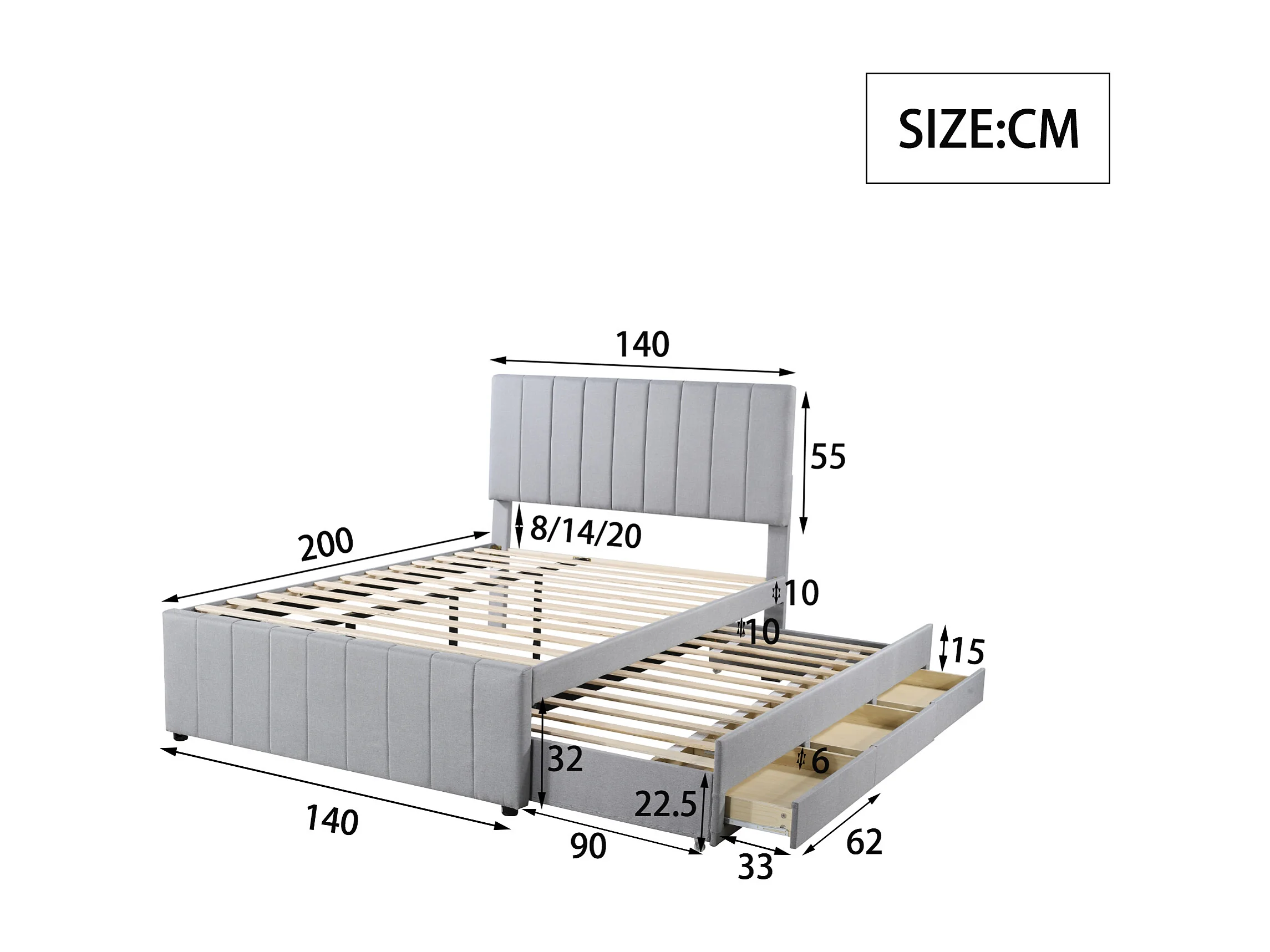 Lit double 140x200 cm avec lit gigogne et tiroirs, revêtement en lin gris, lit d’enfant ou d’invité