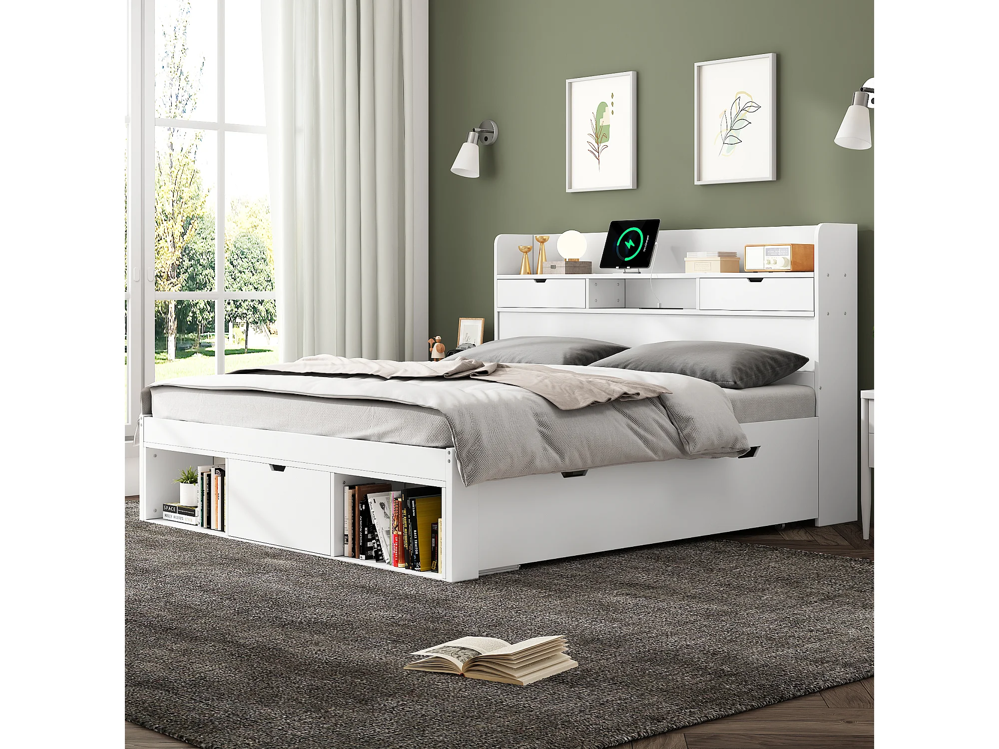 Lit double 140×200 cm blanc, avec port USB, tiroirs et armoire intégrée, grand espace de rangement