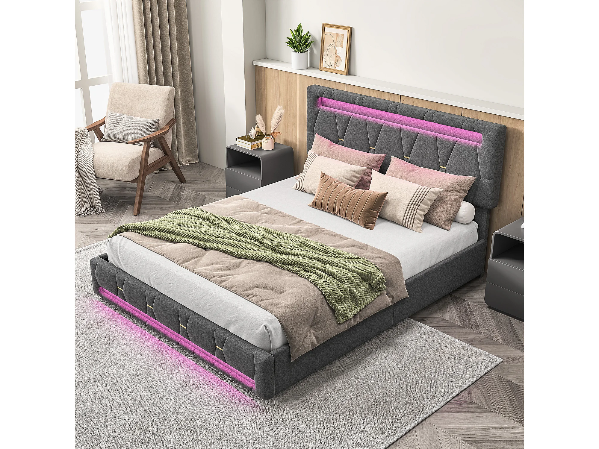 Lit double 140x200cm - avec 4 tiroirs - éclairage LED et port USB -hauteur de tête de lit réglable - lin - gris