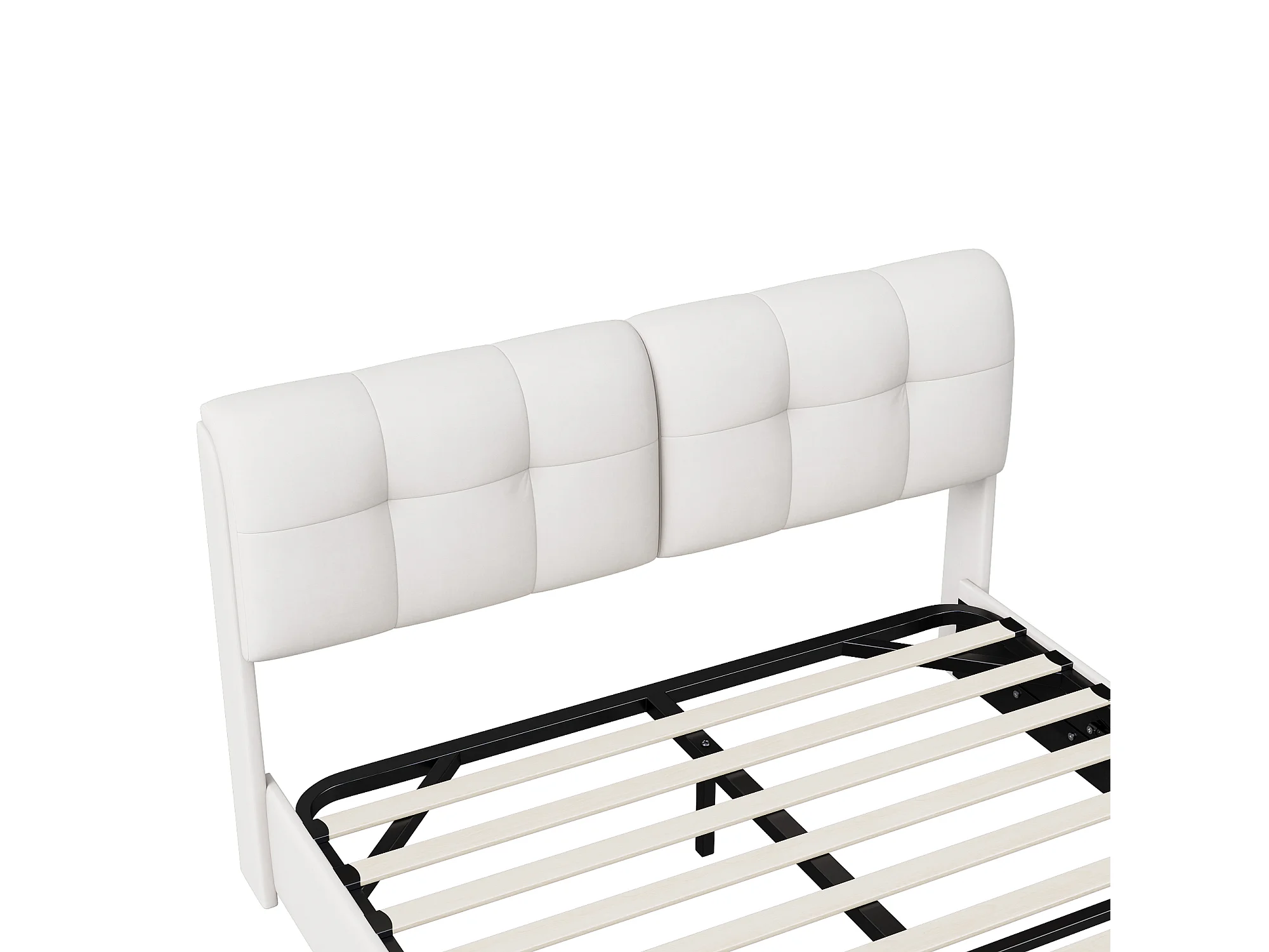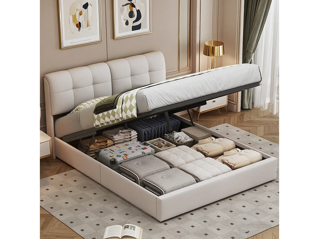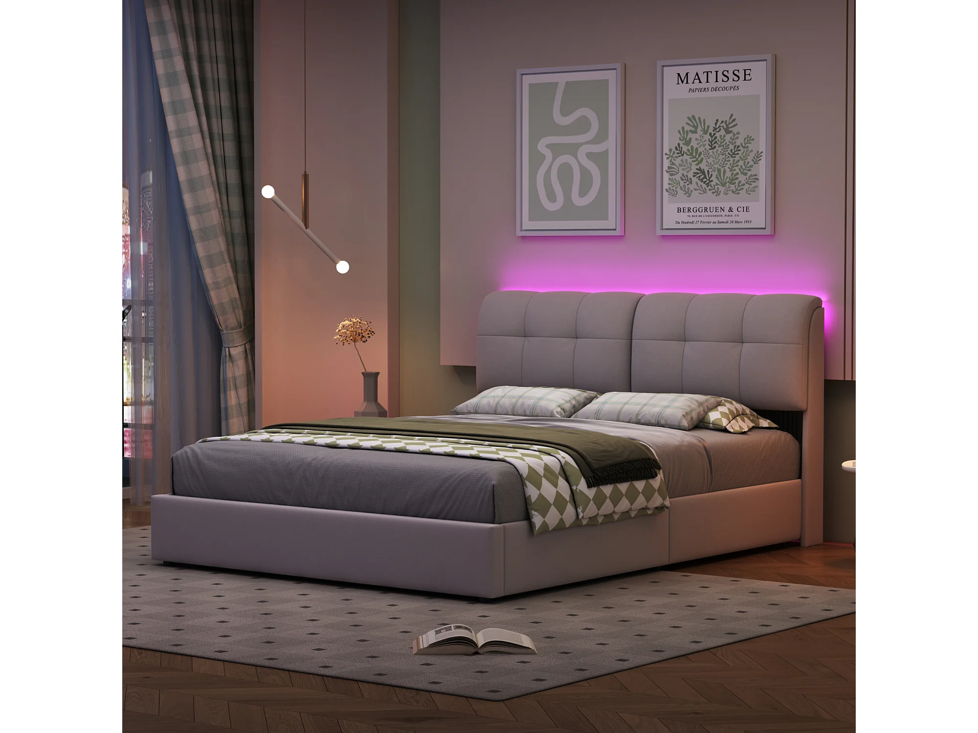 Lit double 140x200cm avec éclairage LED - avec tête de lit et coffre de rangement hydraulique - Beige
