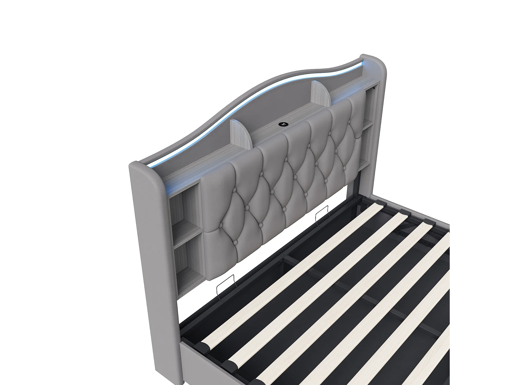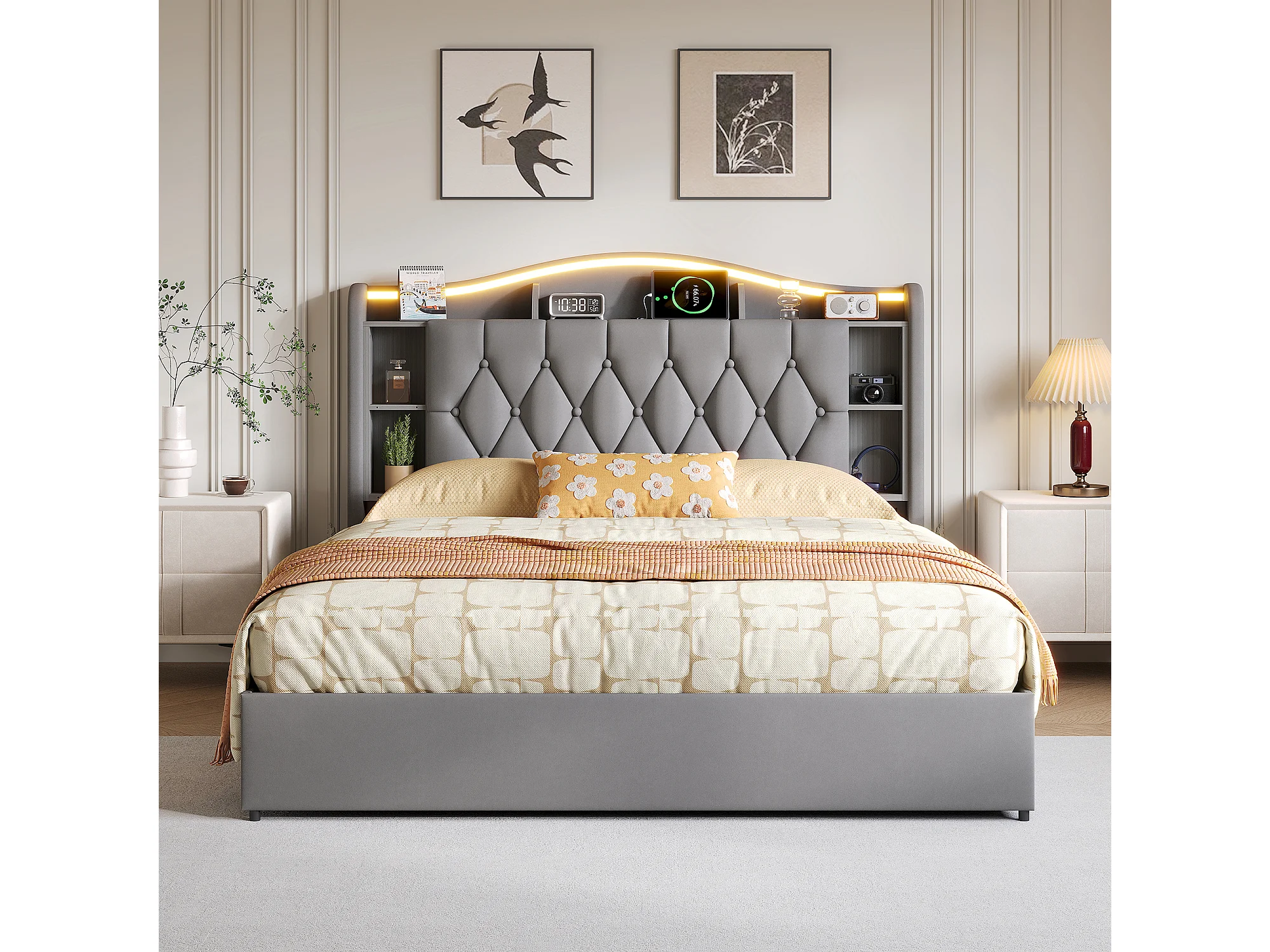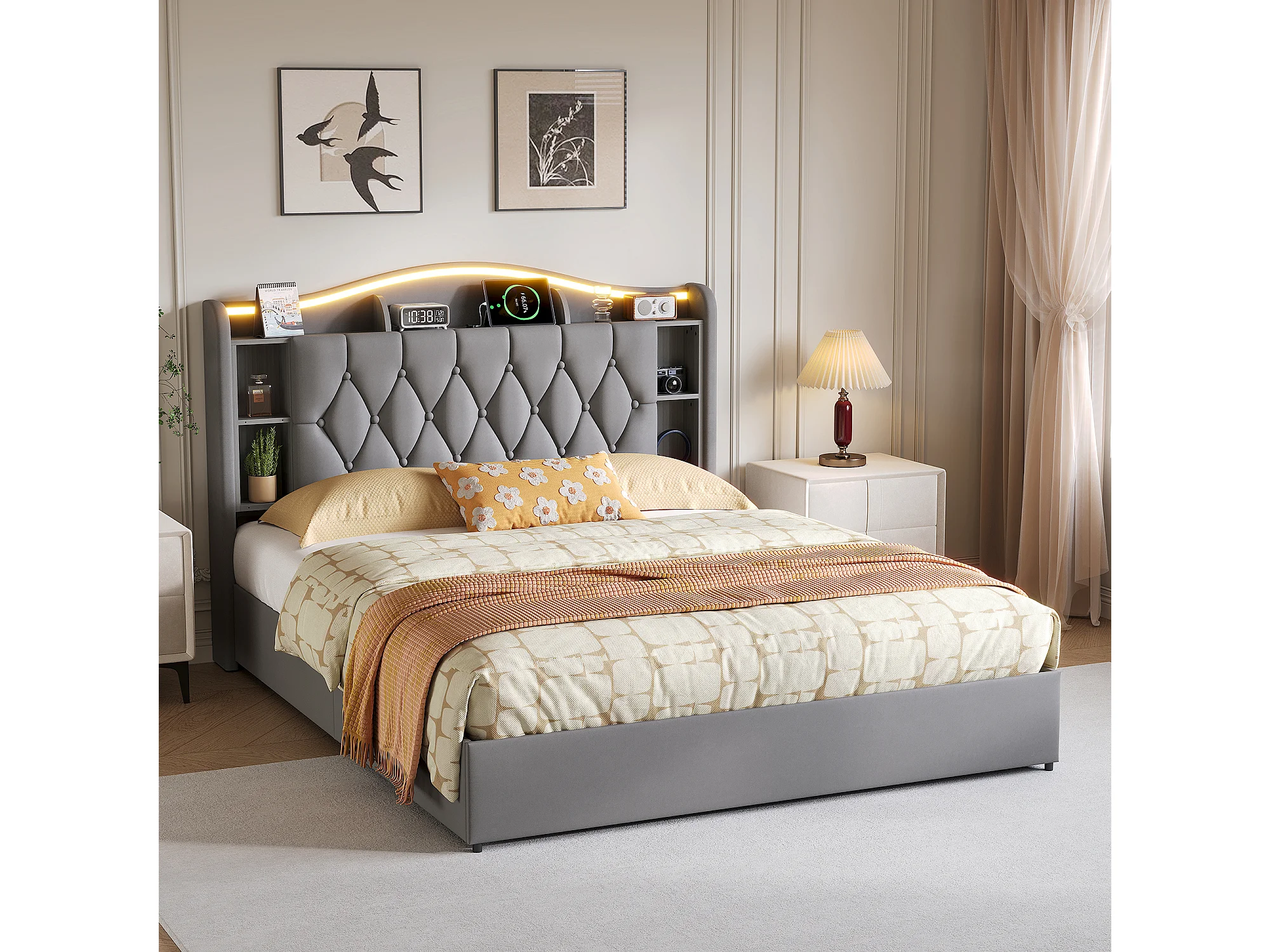 Lit double 140x200cm avec éclairage LED et ports USB - rangement hydraulique - velours - style moderne - gris