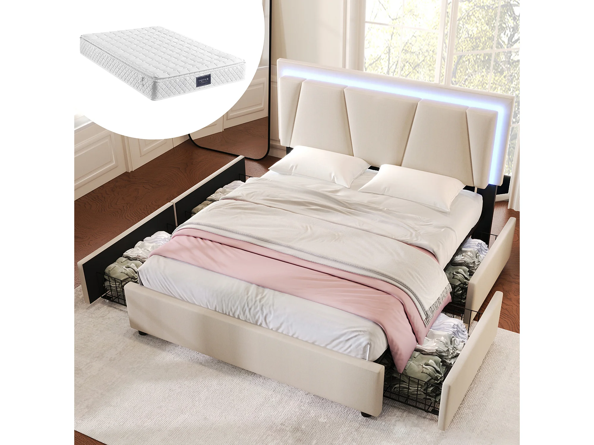 Lit double 140x200cm avec LED quatre tiroirs Tête de lit réglable en hauteur Matelas en beige pour adultes et adolescents