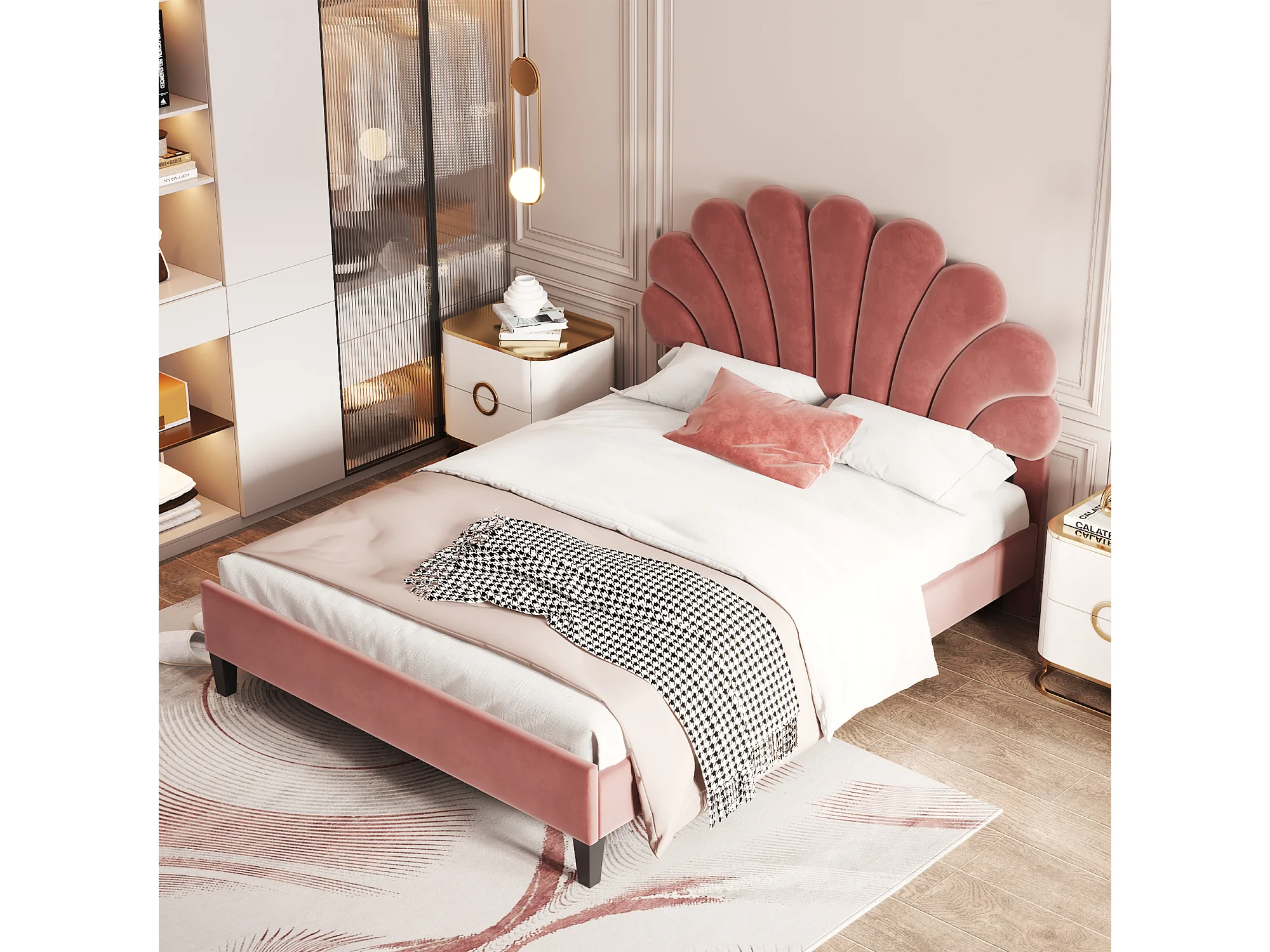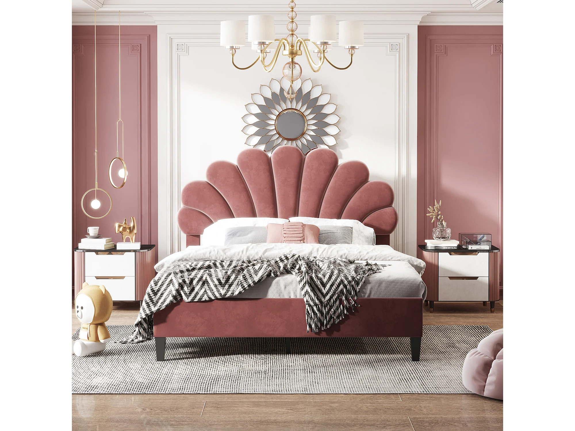 Lit double 140x200cm avec tête de lit en forme de fleur et sommier à lattes Panneaux de particules en rouges pour adultes et adolescents