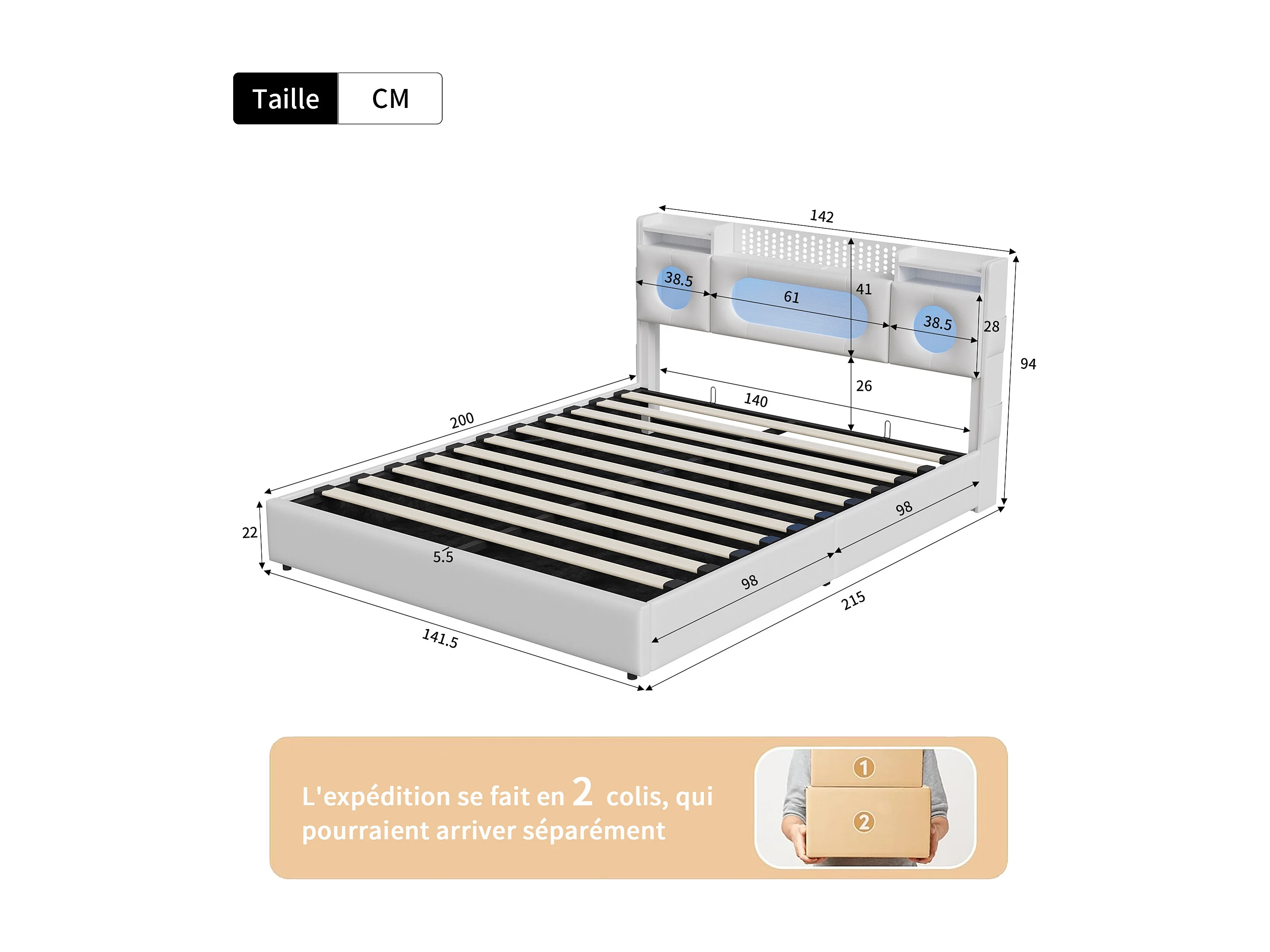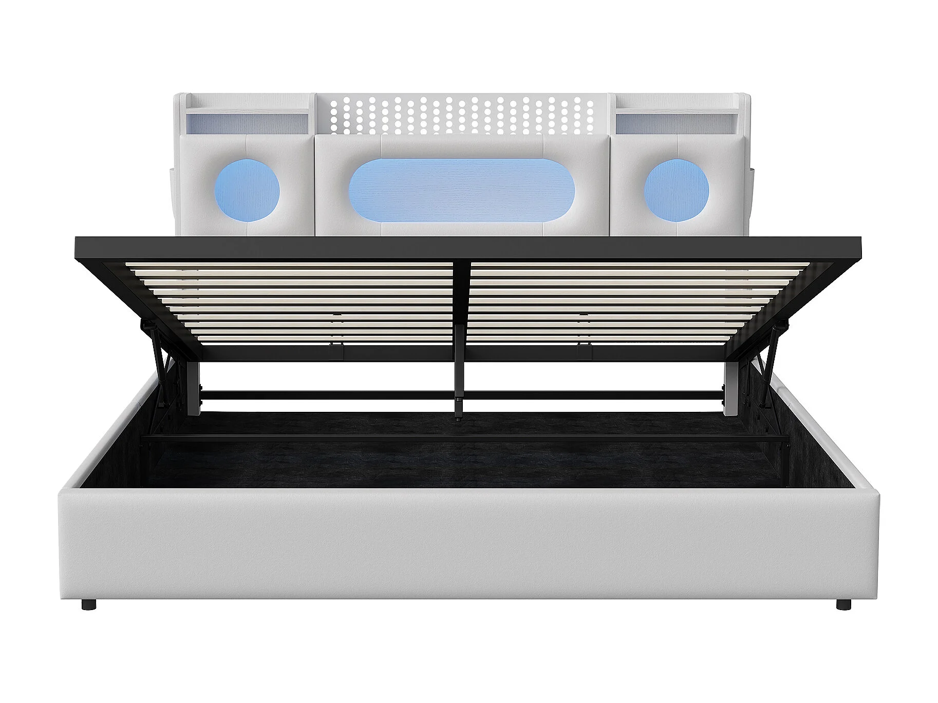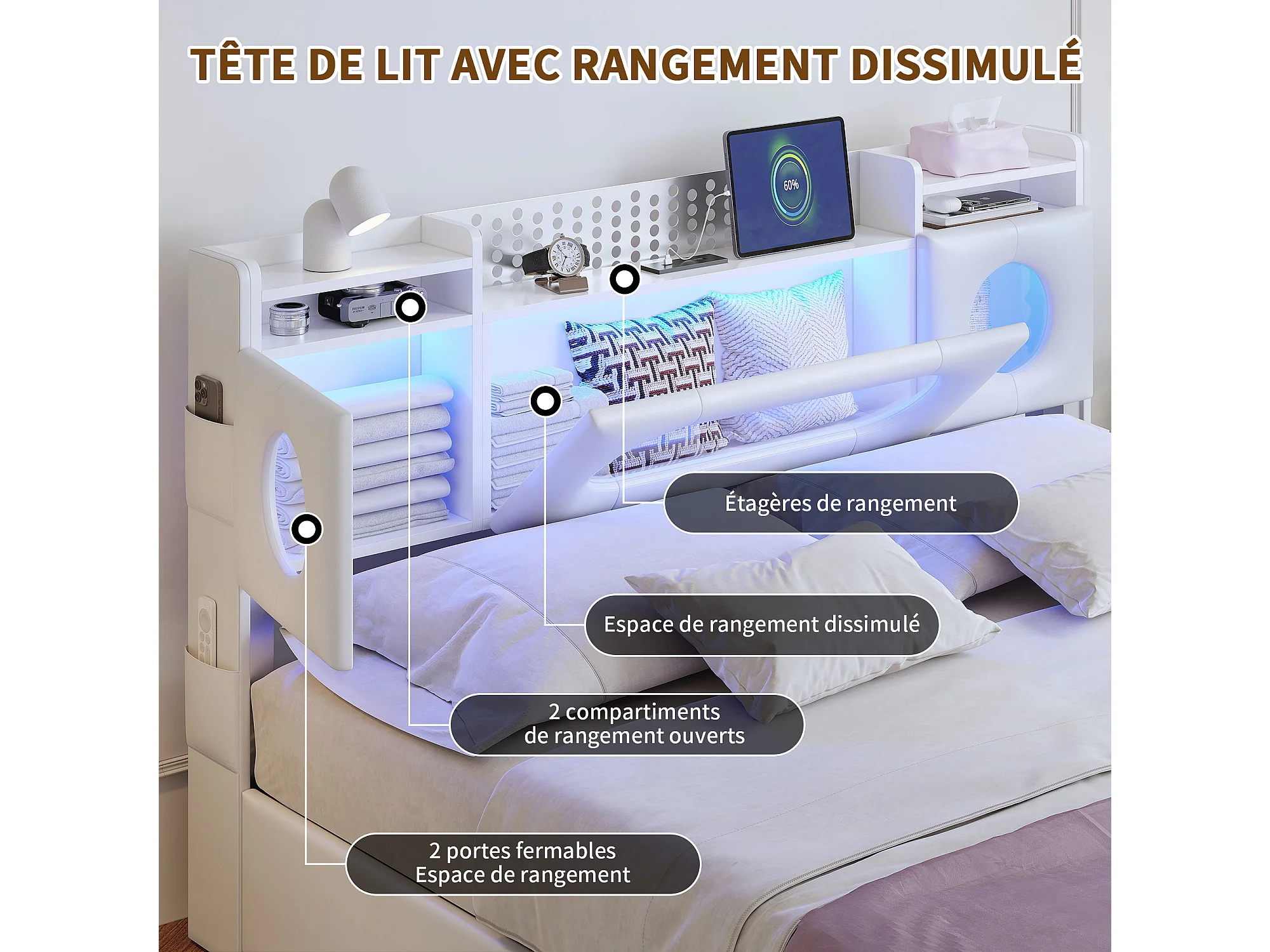 Lit double 140x200cm avec tête de lit LED - espace de rangement et port USB - lit coffre hydraulique - PU - blanc